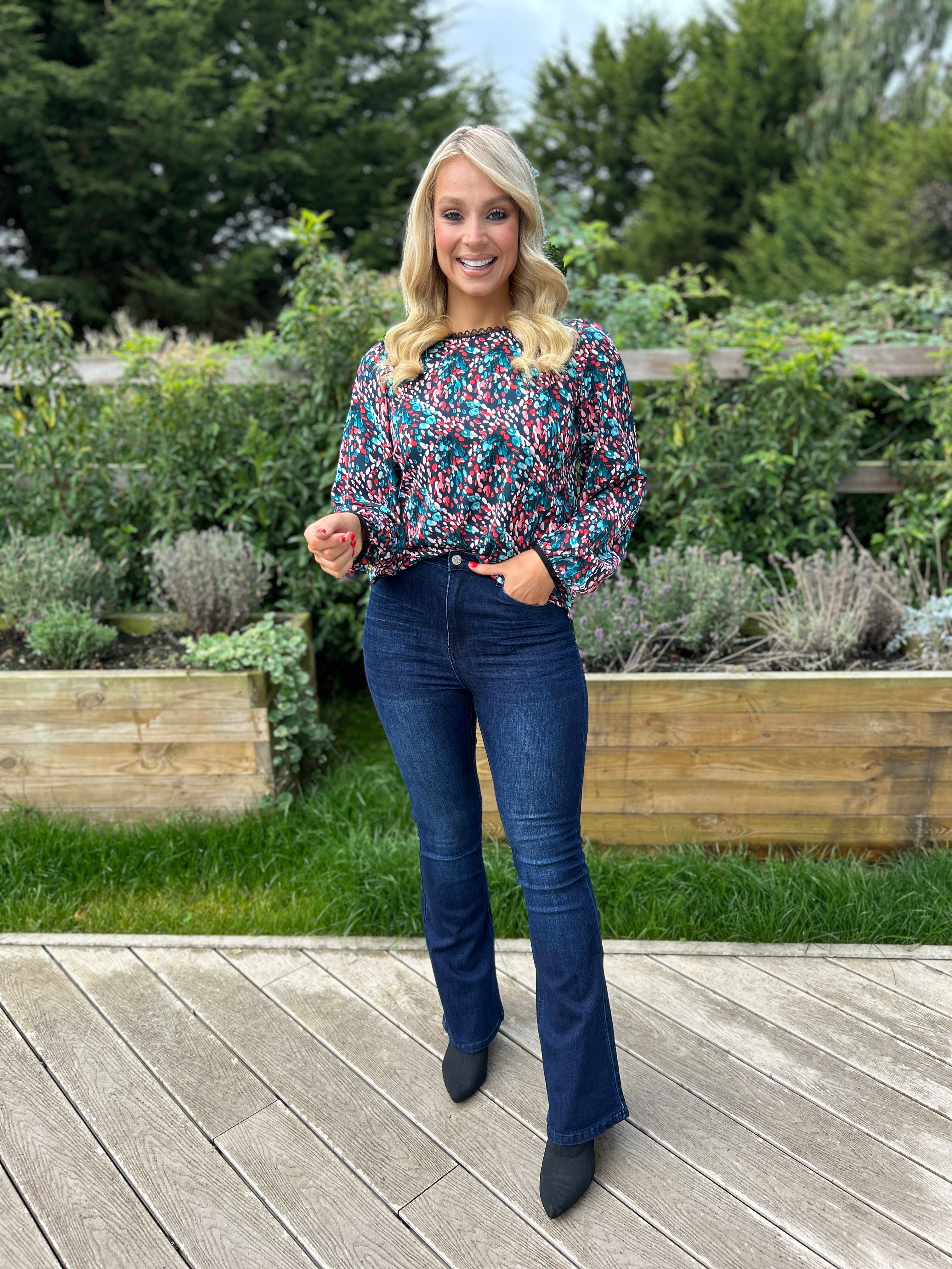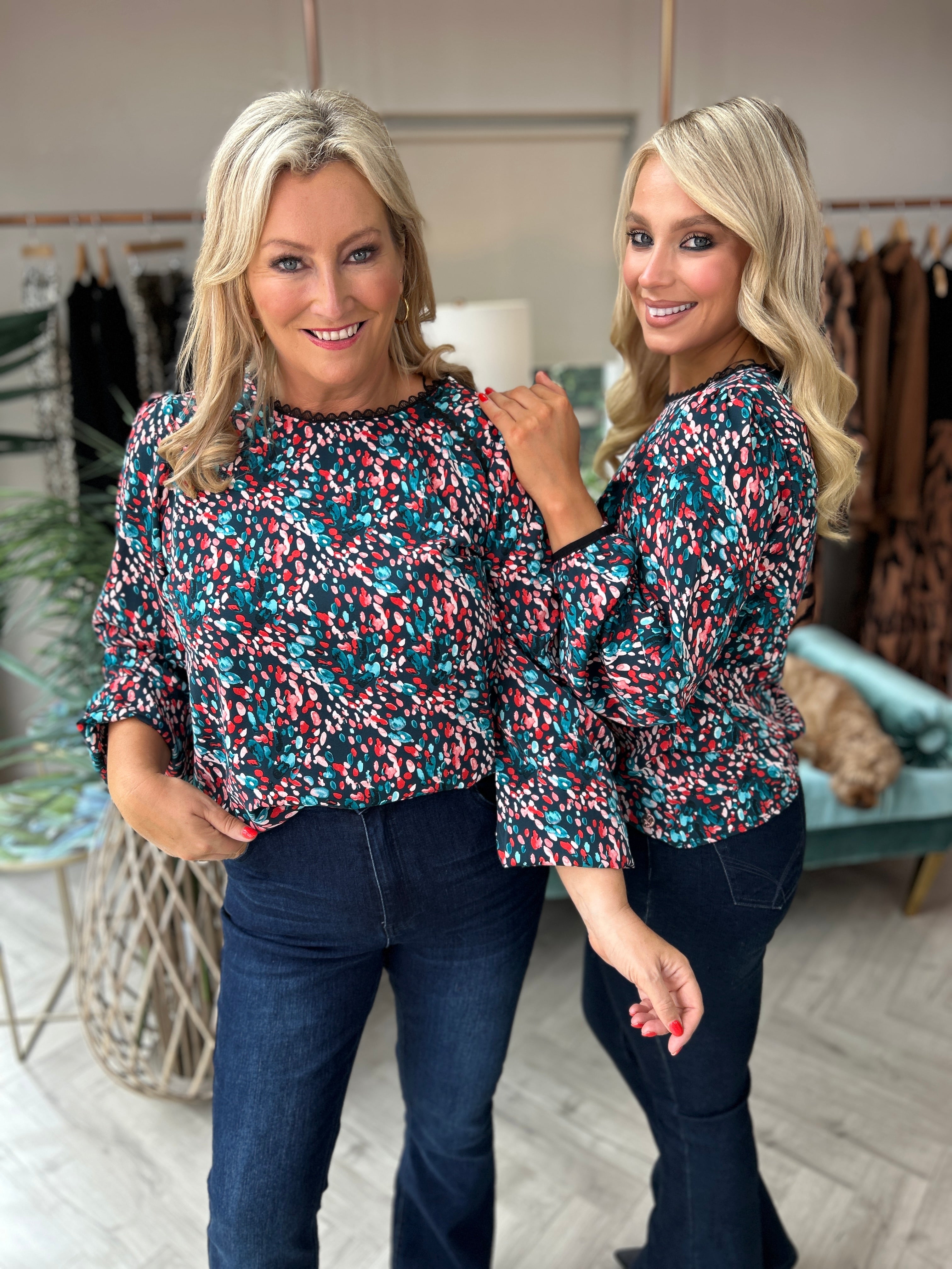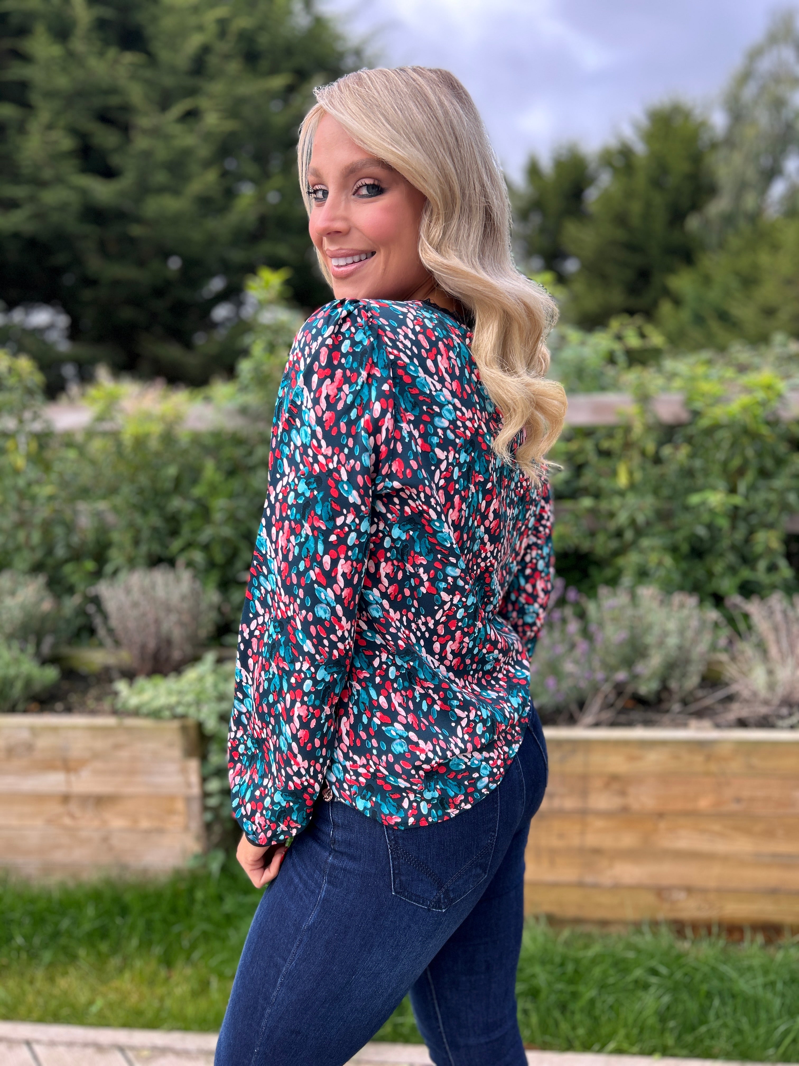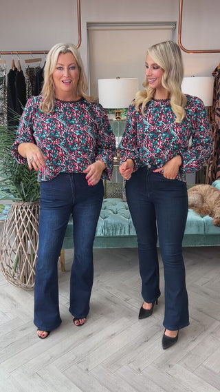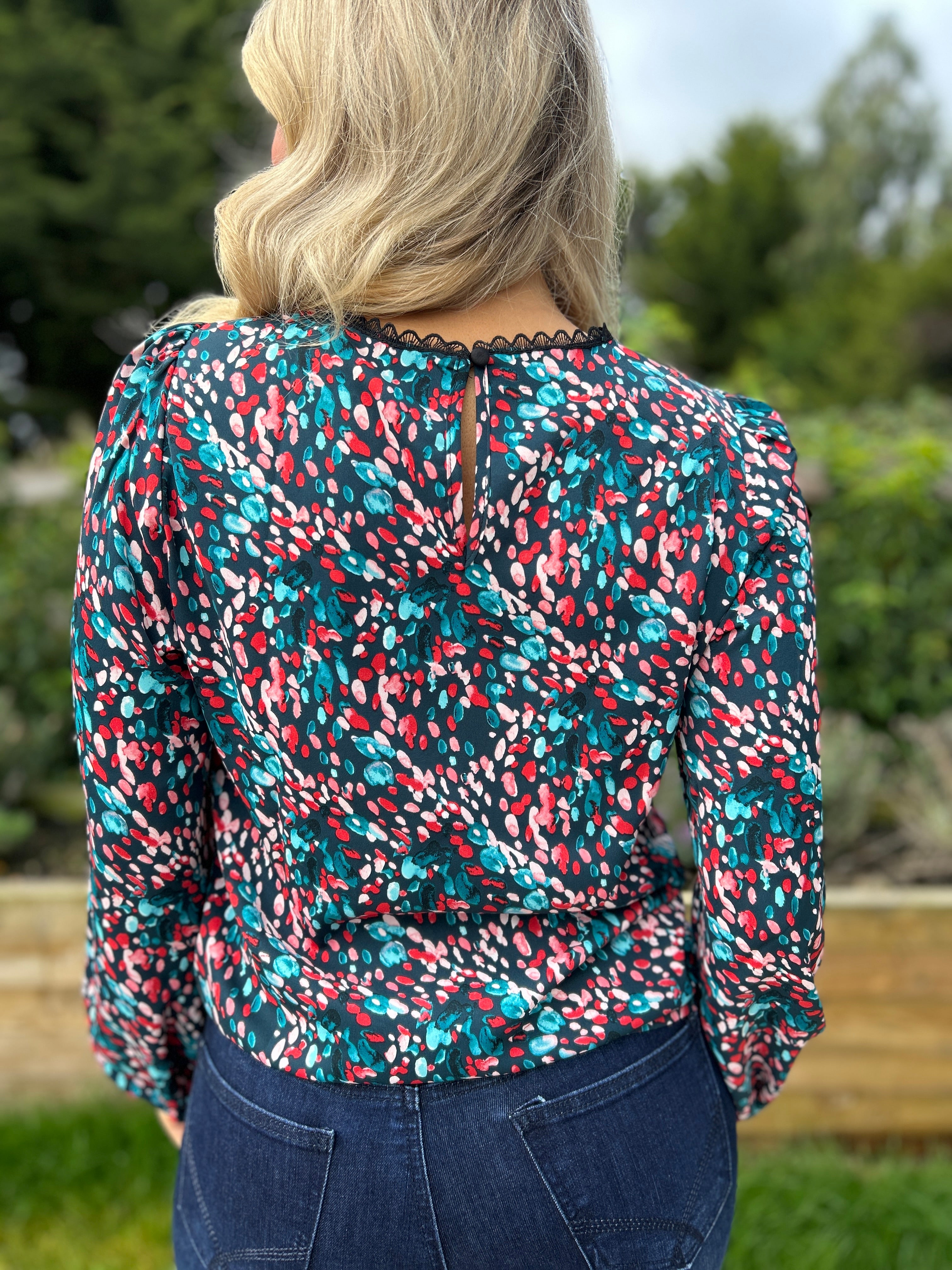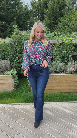 The Sade Top in teal showcases a refined floral design with an elongated neckline and gracefully extended sleeves, perfect for versatile styling. Its breathable fabric ensures comfort throughout the day, while the vibrant pattern adds a subtle feminine touch. Ideal for pairing with jeans or skirts, this blouse effortlessly adapts from casual daywear to elegant evening ensembles.
