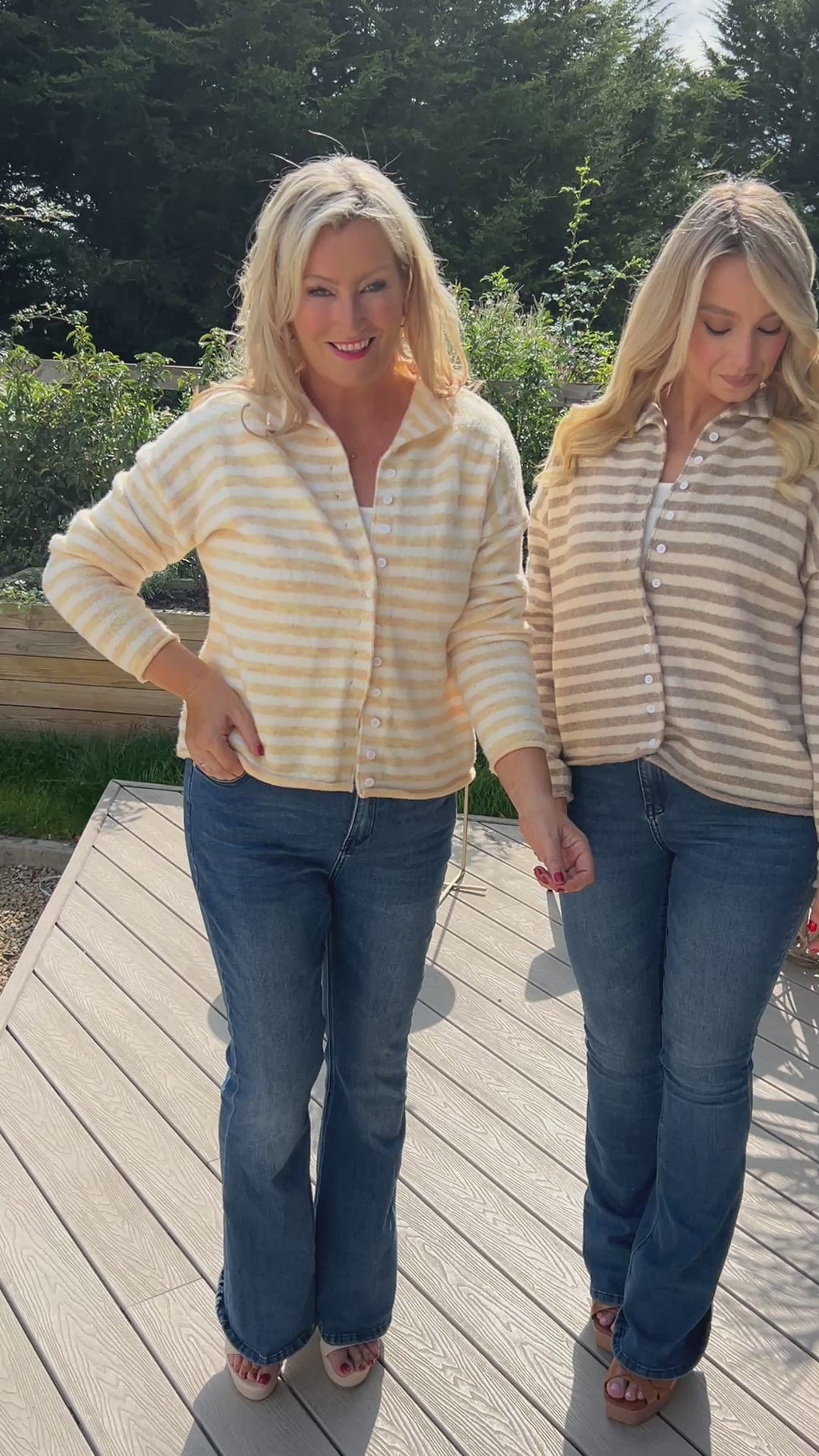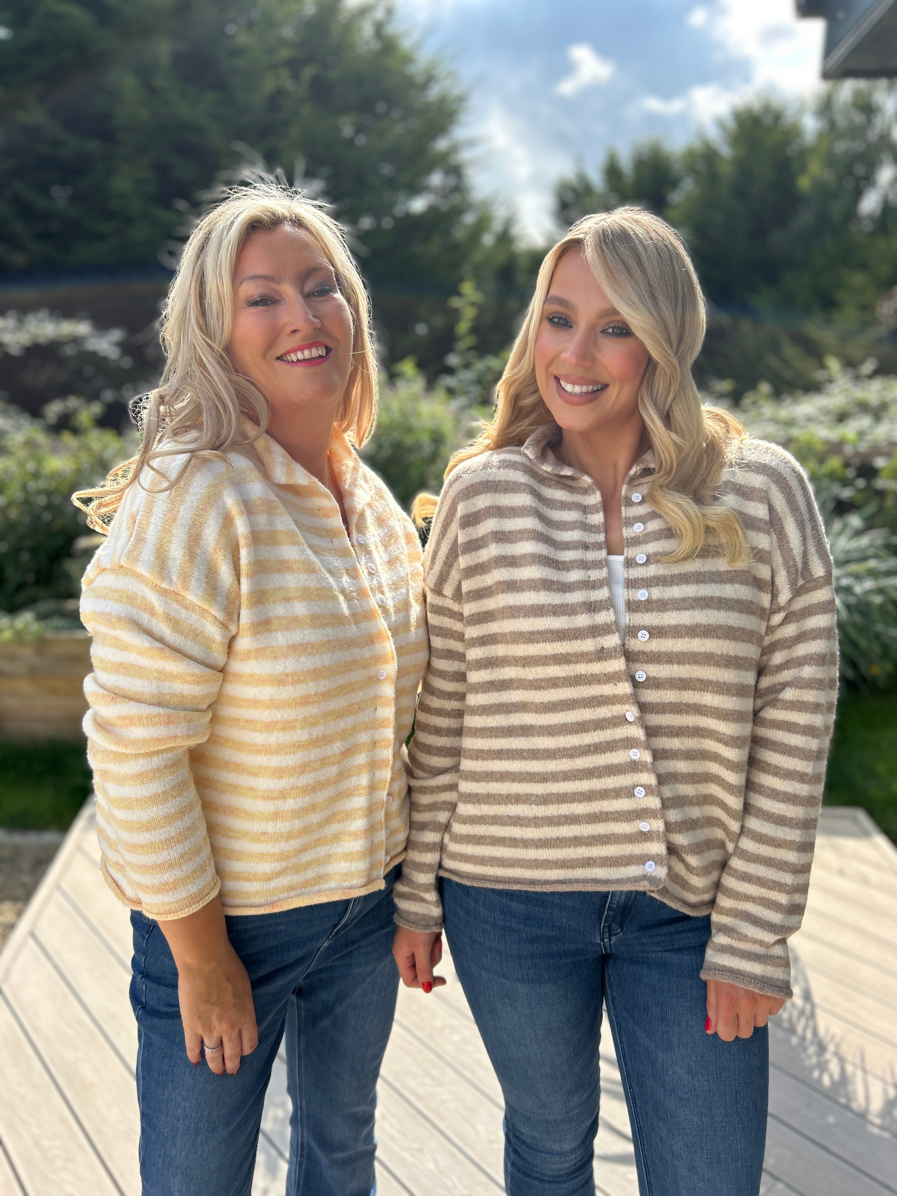 The Bettie Cardi is your go-to layer for effortless, laid-back style. Knitted in soft, cosy yarn with a neutral beige-and-cream stripe, it’s as comfortable as it is versatile. The relaxed fit, button-through front, and fold-over collar give it a touch of retro charm, while the slightly cropped length makes it perfect for pairing with high-waisted jeans, shorts, or skirts. Whether you’re throwing it on over a tee for coffee runs or styling it for a weekend getaway, Bettie has that easy, lived-in feel you’ll keep reaching for.