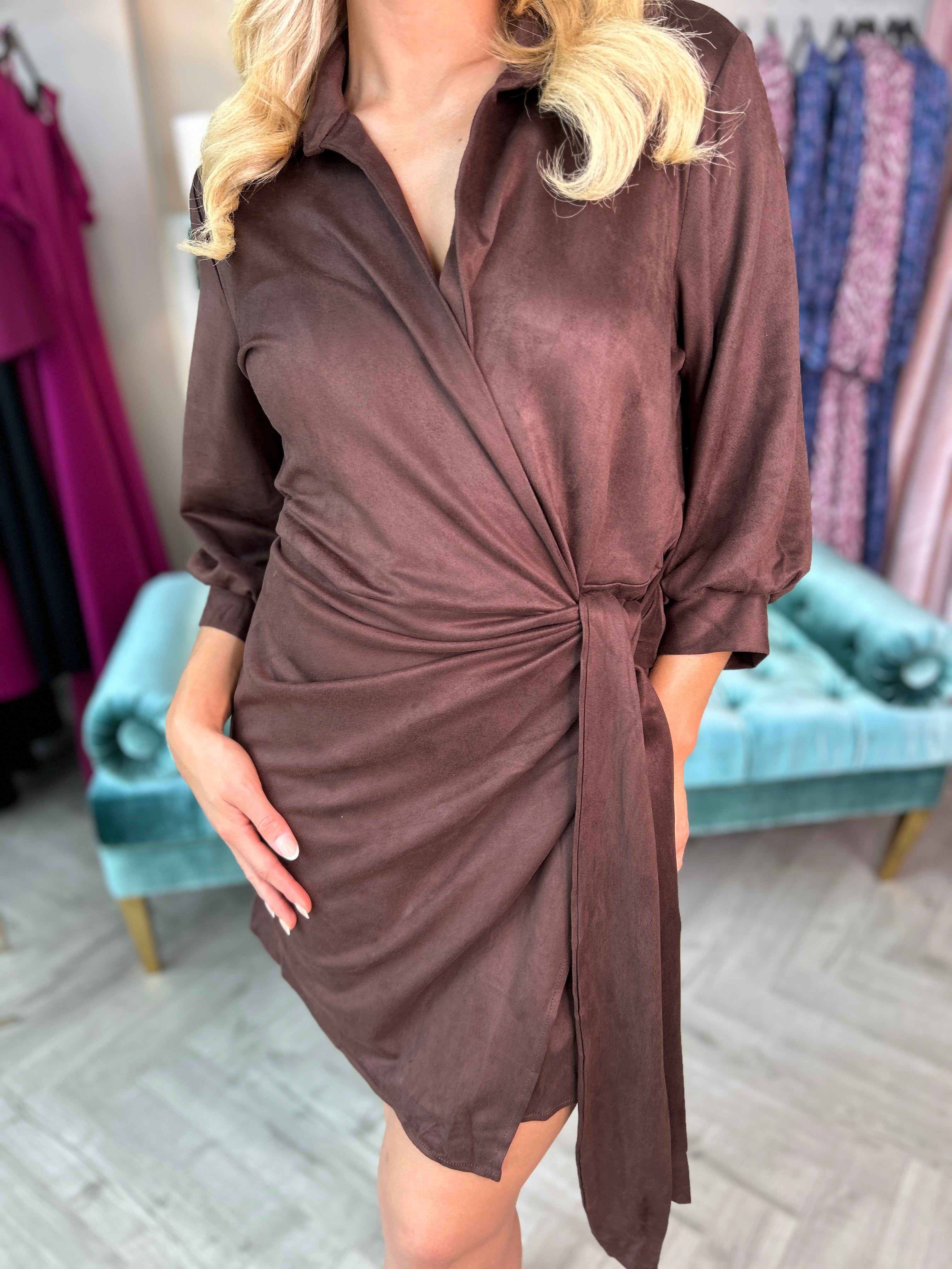 Crafted from soft faux suede, the Kira Suede Dress offers a refined autumn-winter wardrobe essential. Its classic shirt collar and hidden snap fastening combine with an elasticated back waist for tailored comfort. The 3/4 cuffed sleeves and false wrap skirt with a tie waist create a flattering silhouette. Versatile and elegant, this dress easily transitions from daytime casual with boots to evening sophistication with heels and accessories.