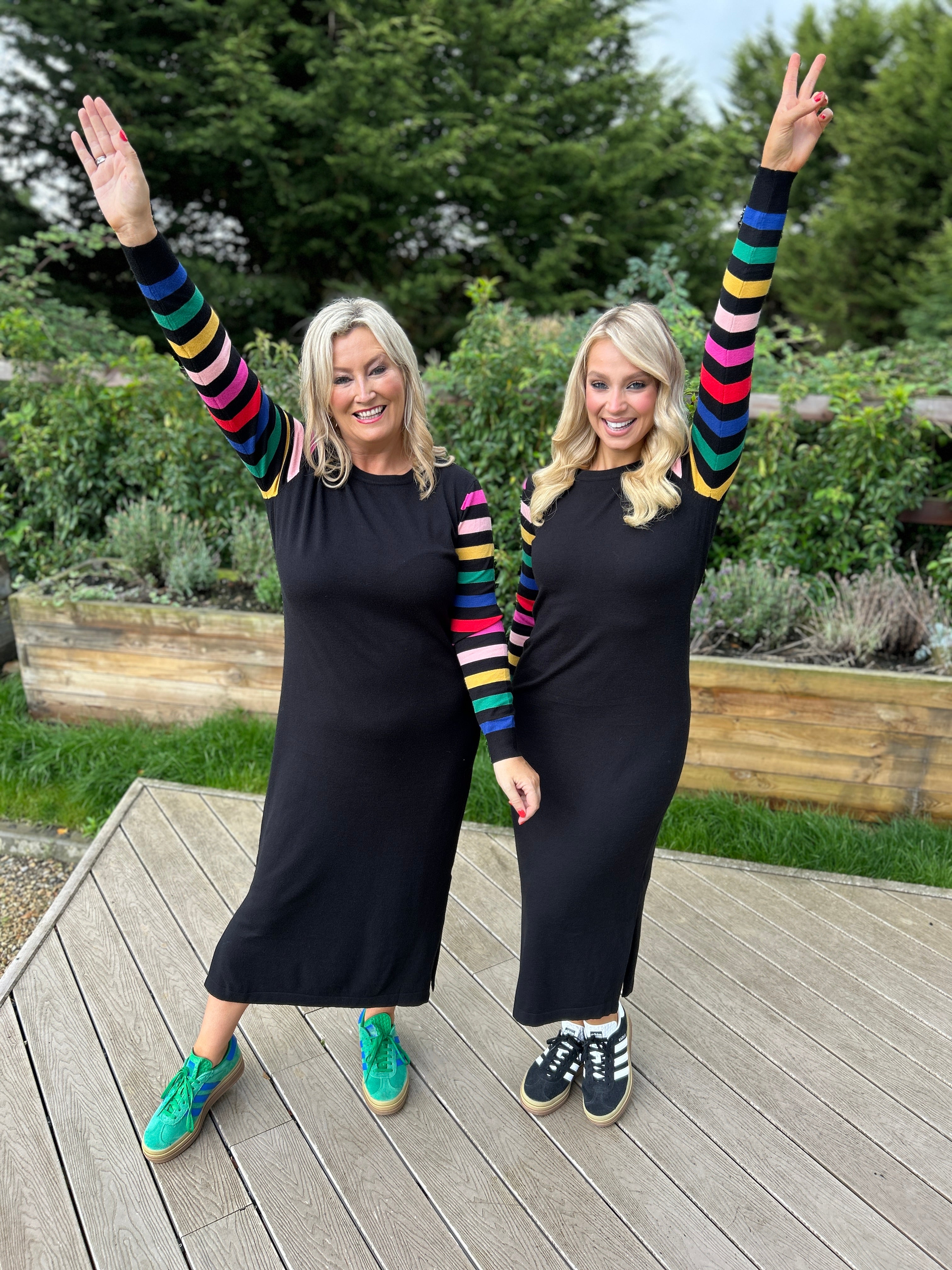 A chic knit with a playful twist – this Sugarhill Brighton Fitted Knitted Dress is the perfect piece for both everyday wear and occasion styling. Designed with a sleek black body, it’s elevated by bold rainbow-striped long sleeves, bringing colour and personality to a classic silhouette. The rounded neckline, side split hem, and midi length (falling just below the knee) create a flattering, comfortable fit.