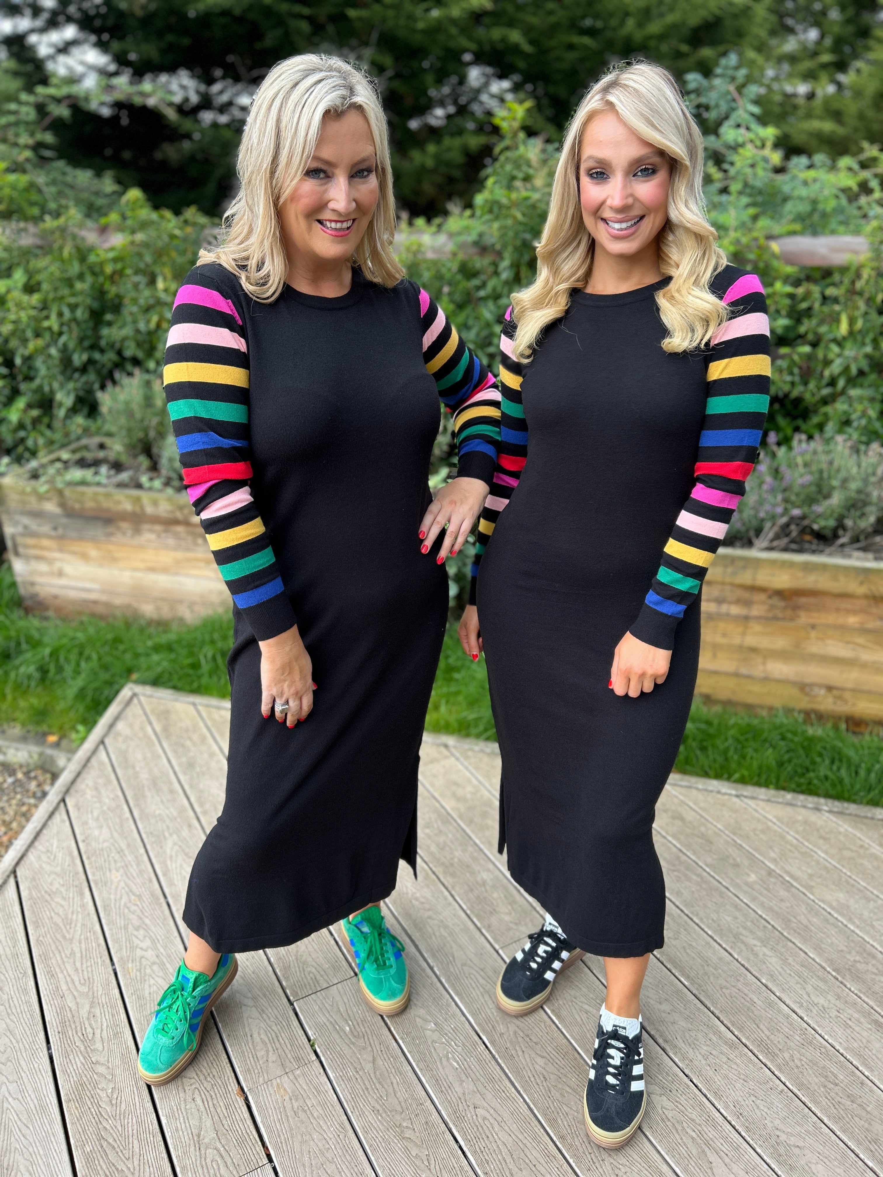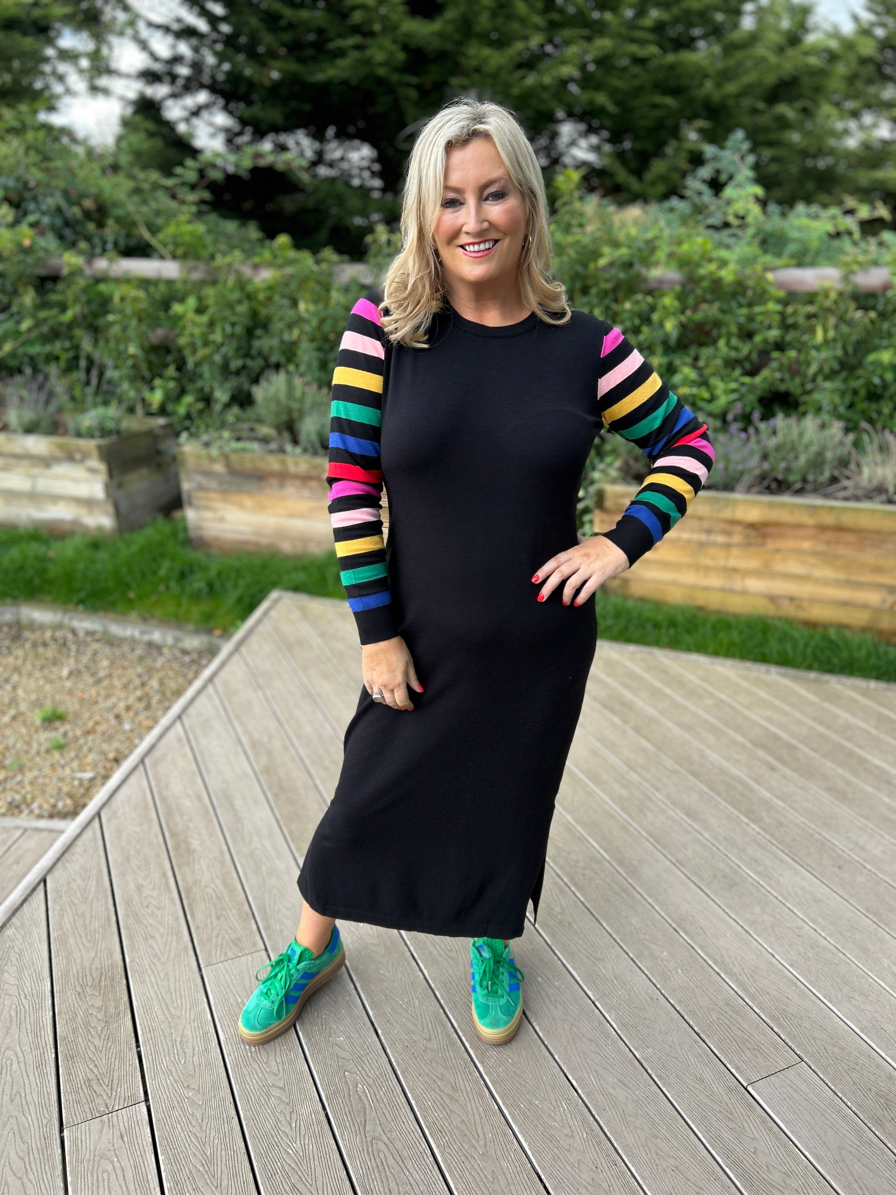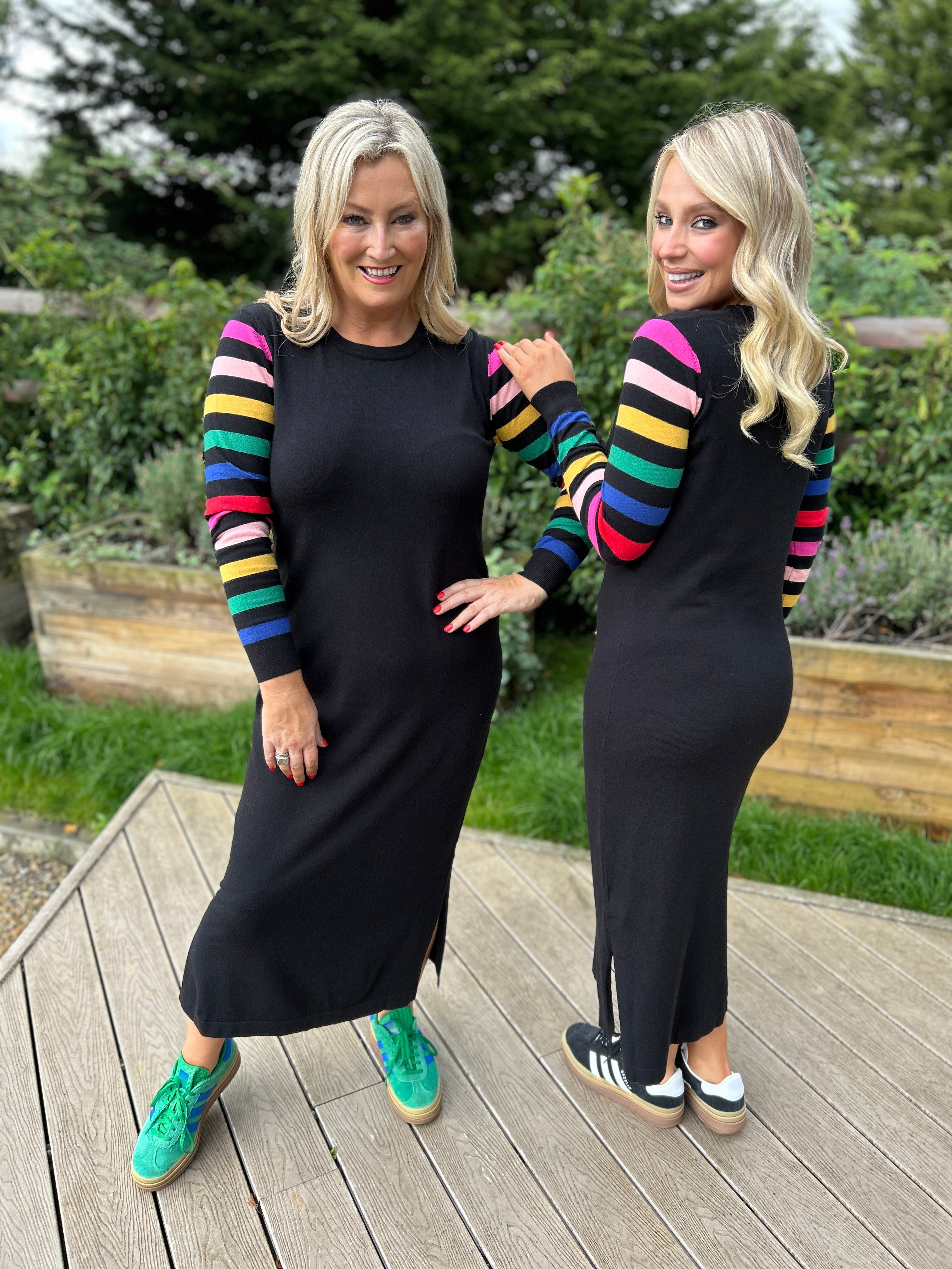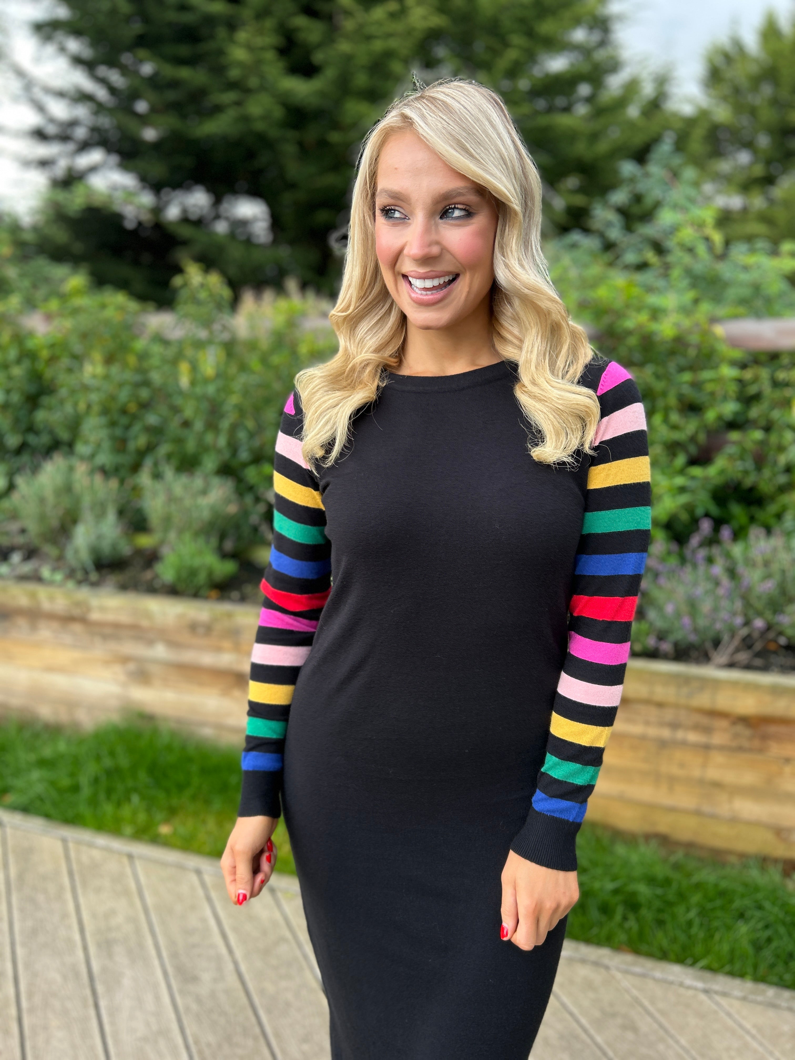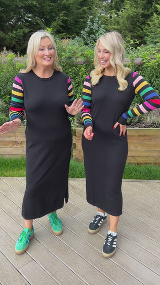 Sugarhill Brighton Black Knitted Midi Dress with Rainbow Sleeves