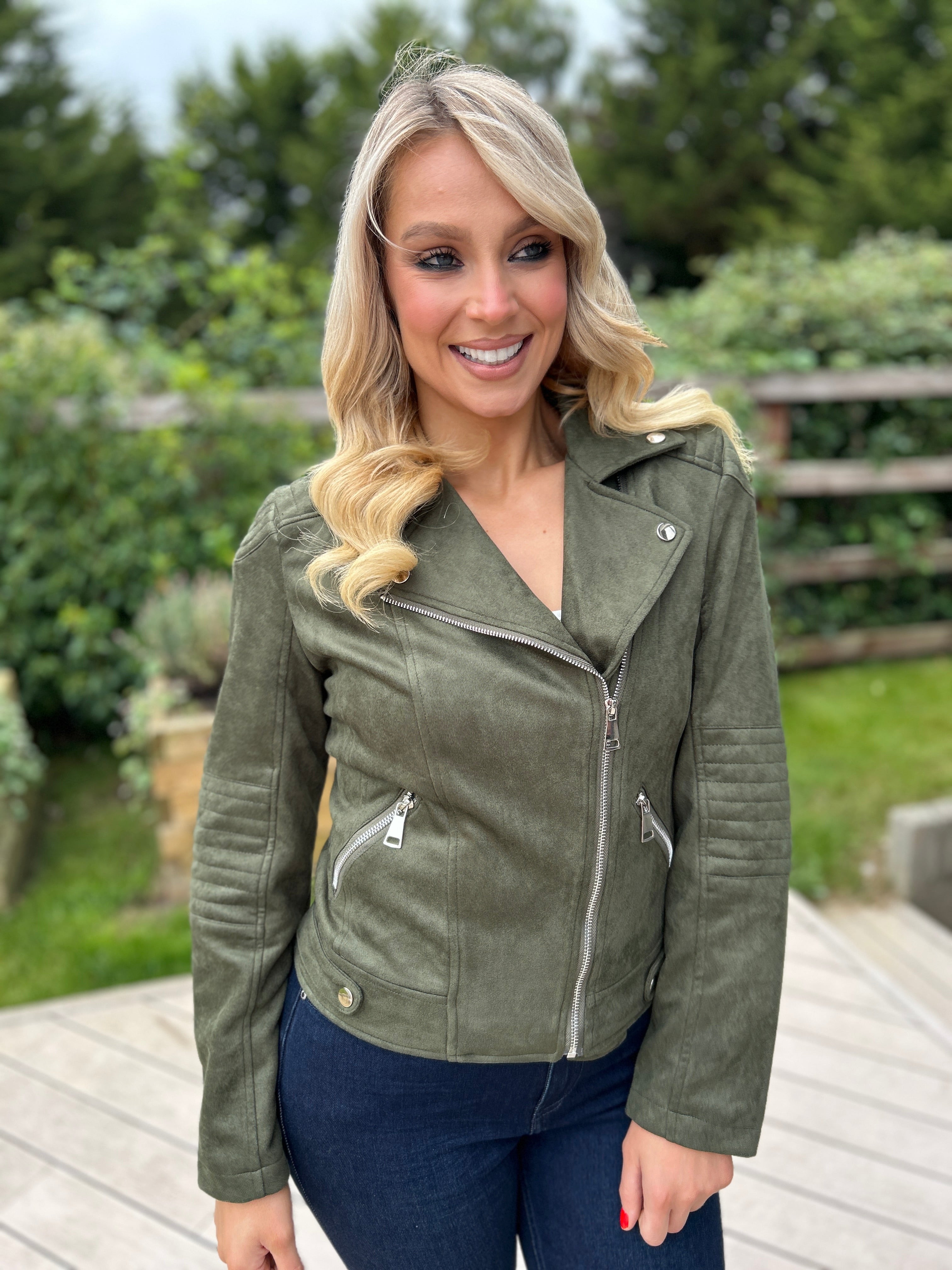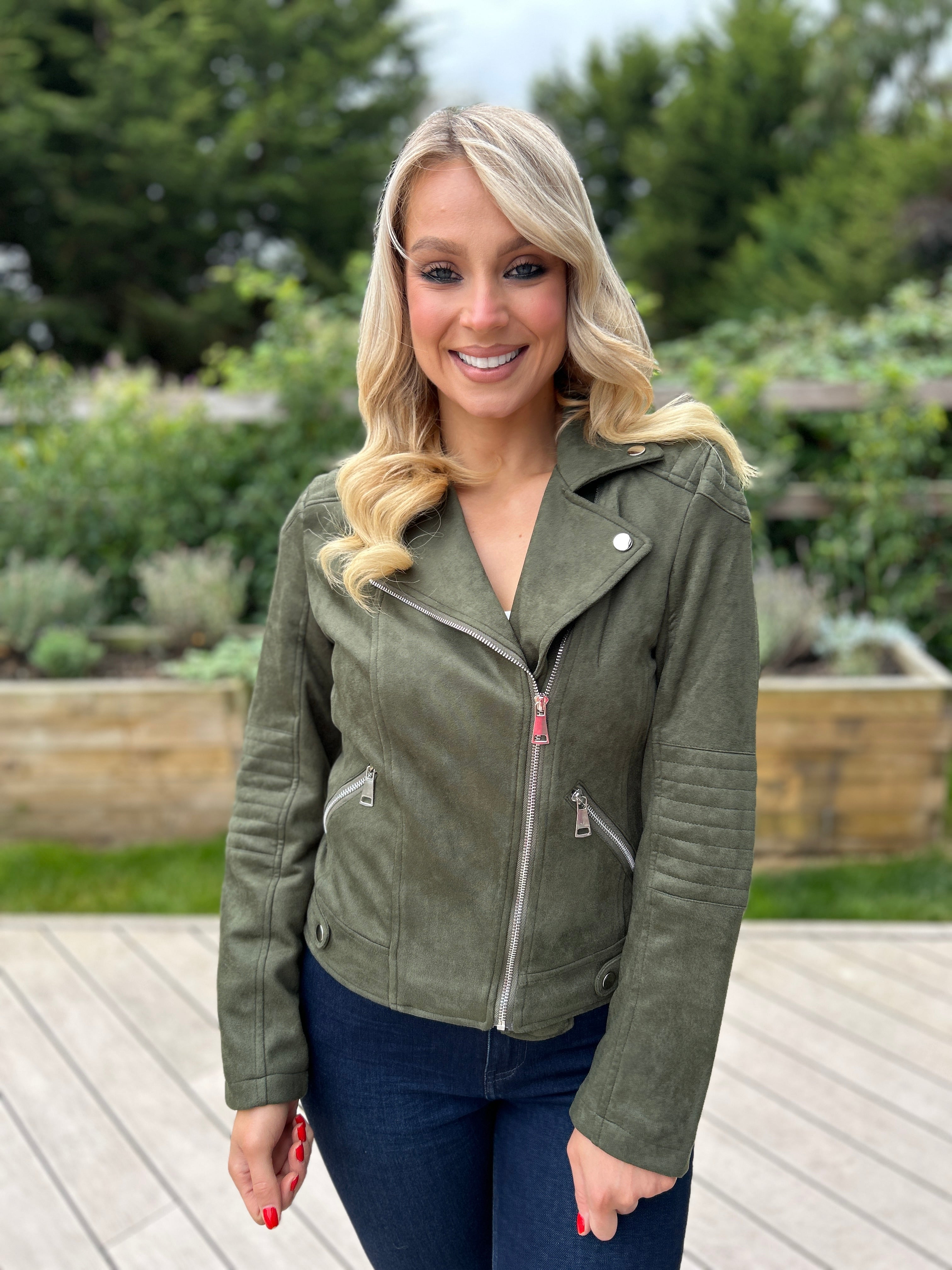 A timeless wardrobe staple with a modern edge, the Brandi Suede Biker Jacket is crafted from soft faux suede for a luxe feel and comfortable fit. Designed with classic biker details, it features an asymmetric zip front, structured lapels, and tailored seams that flatter every silhouette.
