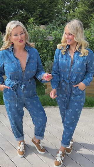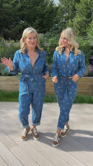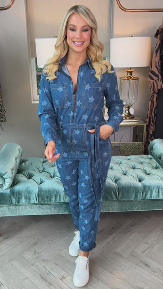 The Anwen Jumpsuit is a retro-inspired one-piece with a modern, tailored edge. Cut in a classic boilersuit shape, it features a structured shirt-style upper with full sleeves, an exposed front zip, and a tie waist for a flattering fit. Side pockets add practicality, while the straight-leg trousers balance comfort with a sleek silhouette. Made from soft blue denim, the design is elevated with repeating bleached star motifs against a deep indigo base — channeling vintage Americana charm with a contemporary twist.