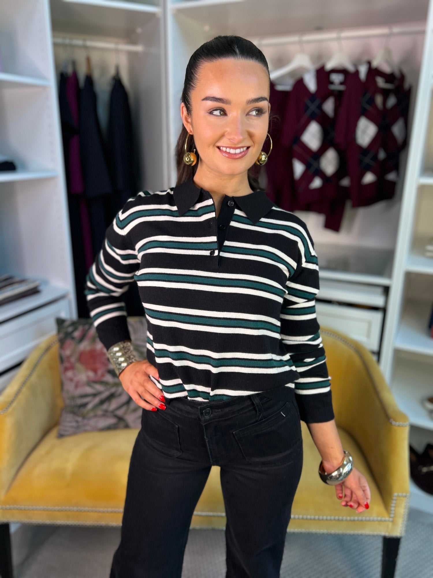 Perfect for those smart casual occasions, the Erin Button Top can easily be styled up or down. Pair it with your favorite high-waisted trousers and loafers for a day at the office, or switch to skinny jeans and ankle boots for a relaxed yet refined weekend look. Its fine knit ensures comfort all day long, while the contrasting stripes add a pop of color and character to any outfit.