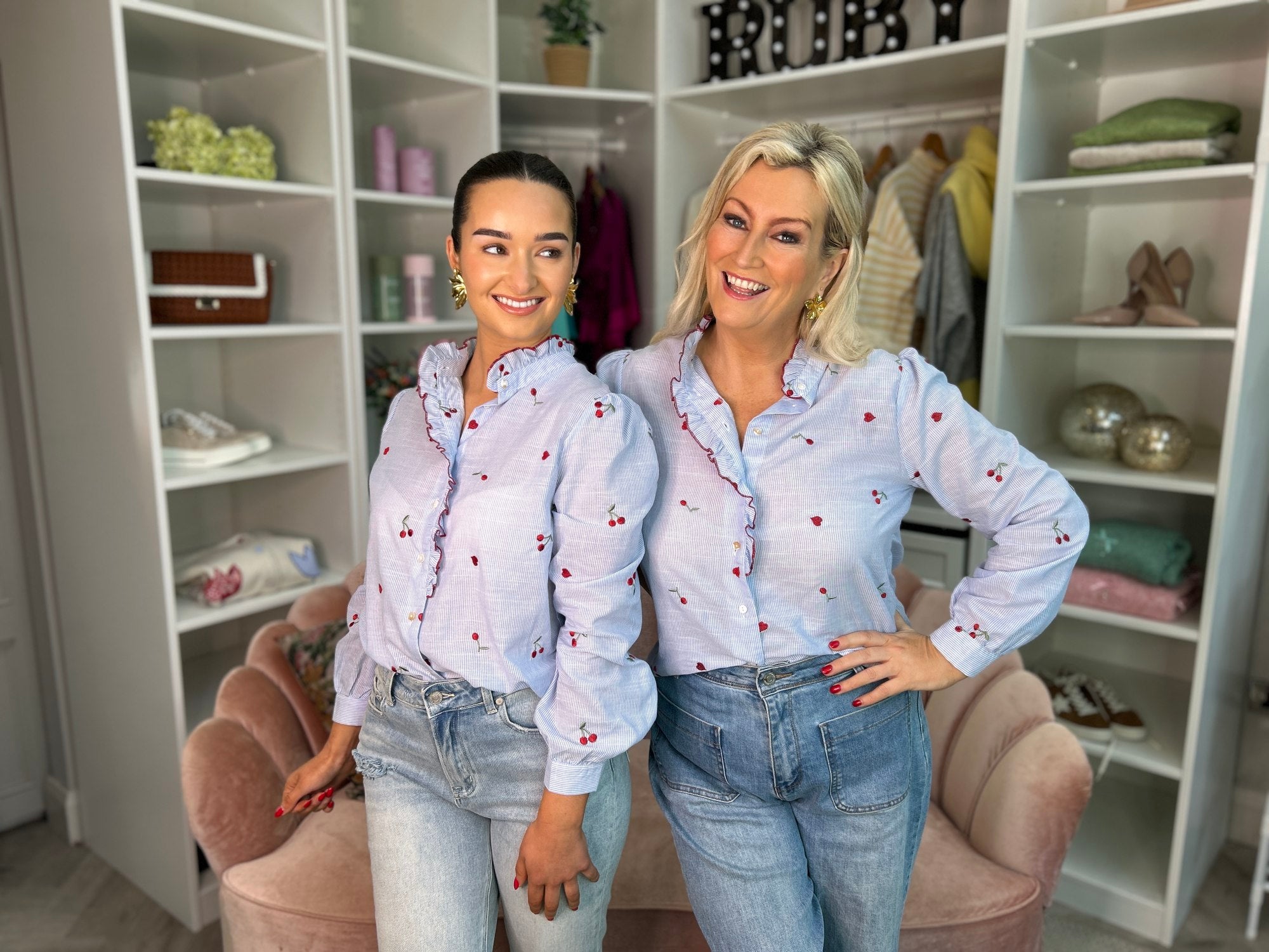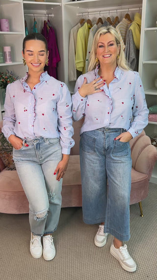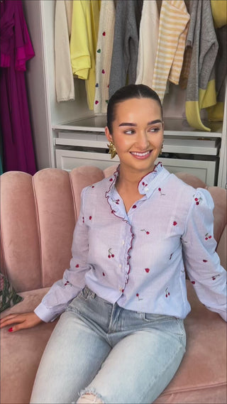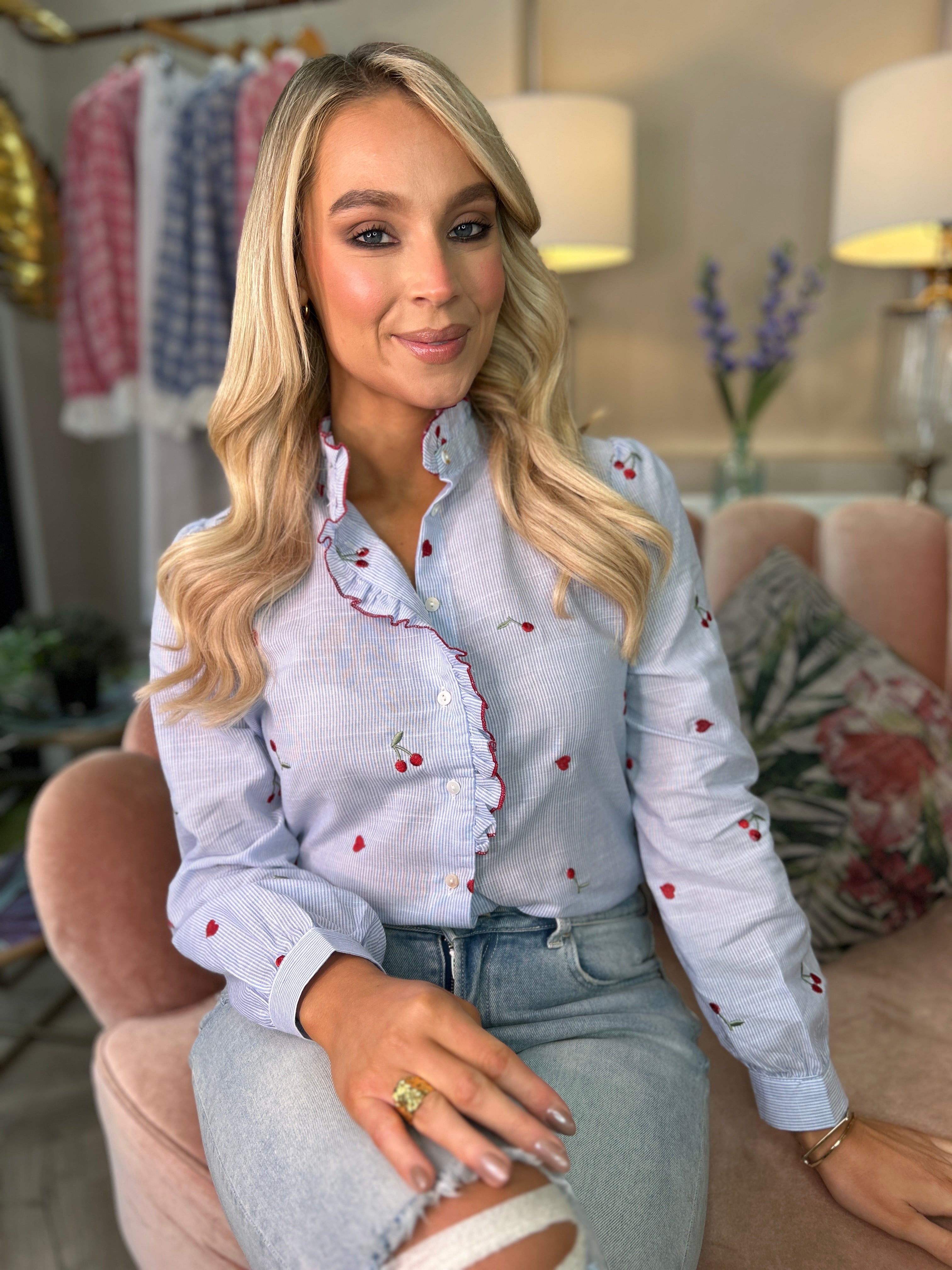 Introducing the Cora Shirt a captivating blend of playful charm and sophisticated style priced at just €39.00. This exquisite blue shirt is adorned with a delightful cherry motif, guaranteed to add a burst of joy to your wardrobe. The design features a distinctive ruffle collar with elegant piping that gracefully extends halfway down the shirt.