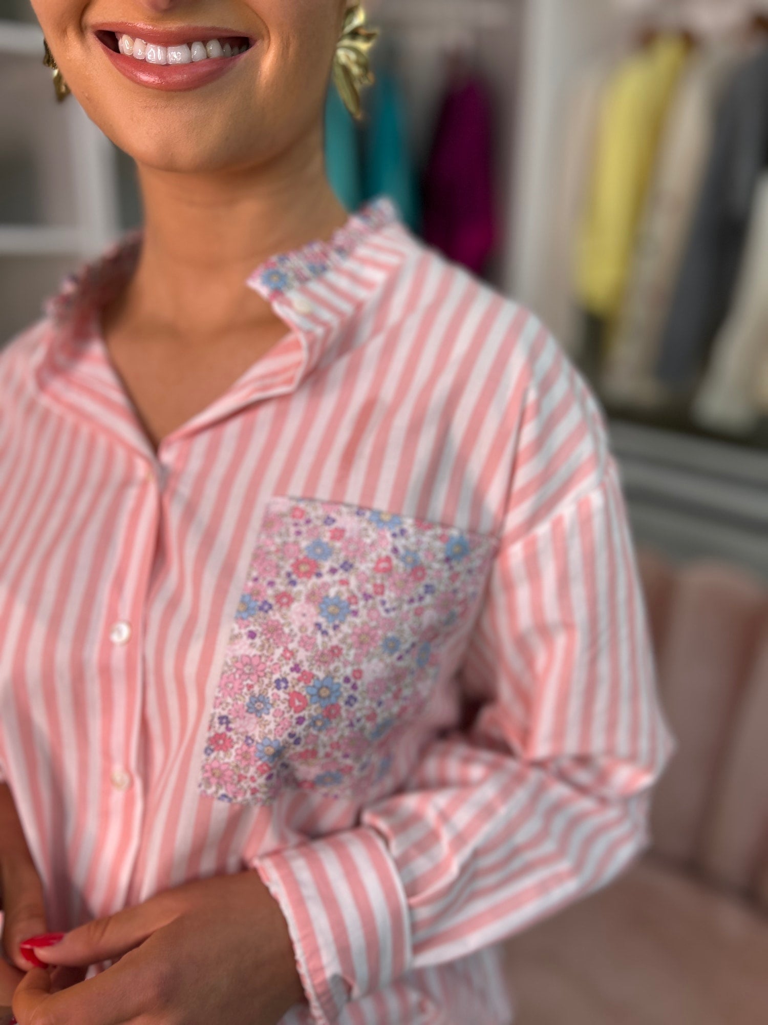 Introduce an element of playful sophistication to your wardrobe with the Ivy Stripe Shirt. This shirt features a classic stripe pattern that's effortlessly elevated by a charming floral pocket detail. The ruffle collar and sleeves add a touch of elegance making it a unique piece that stands out.