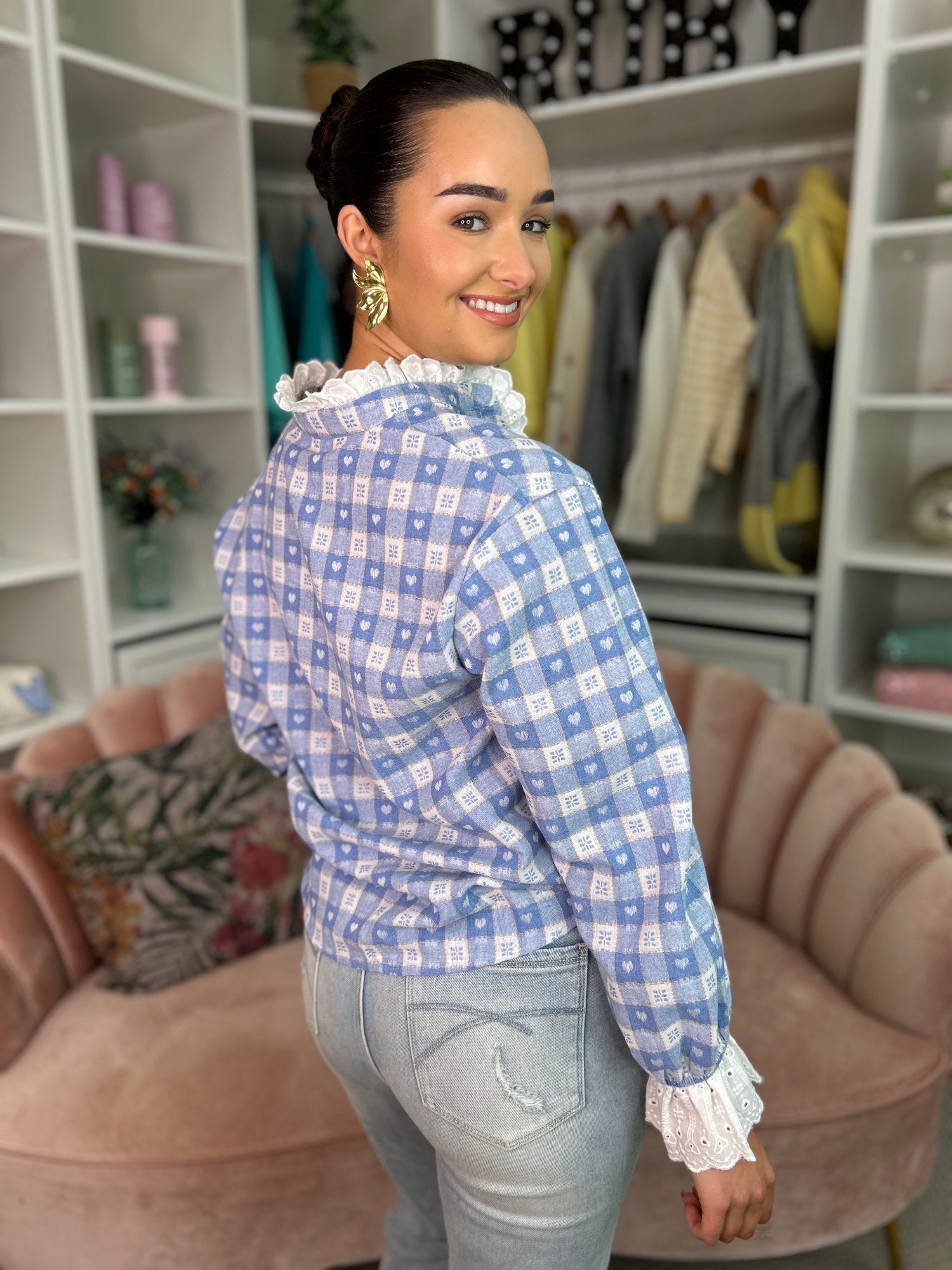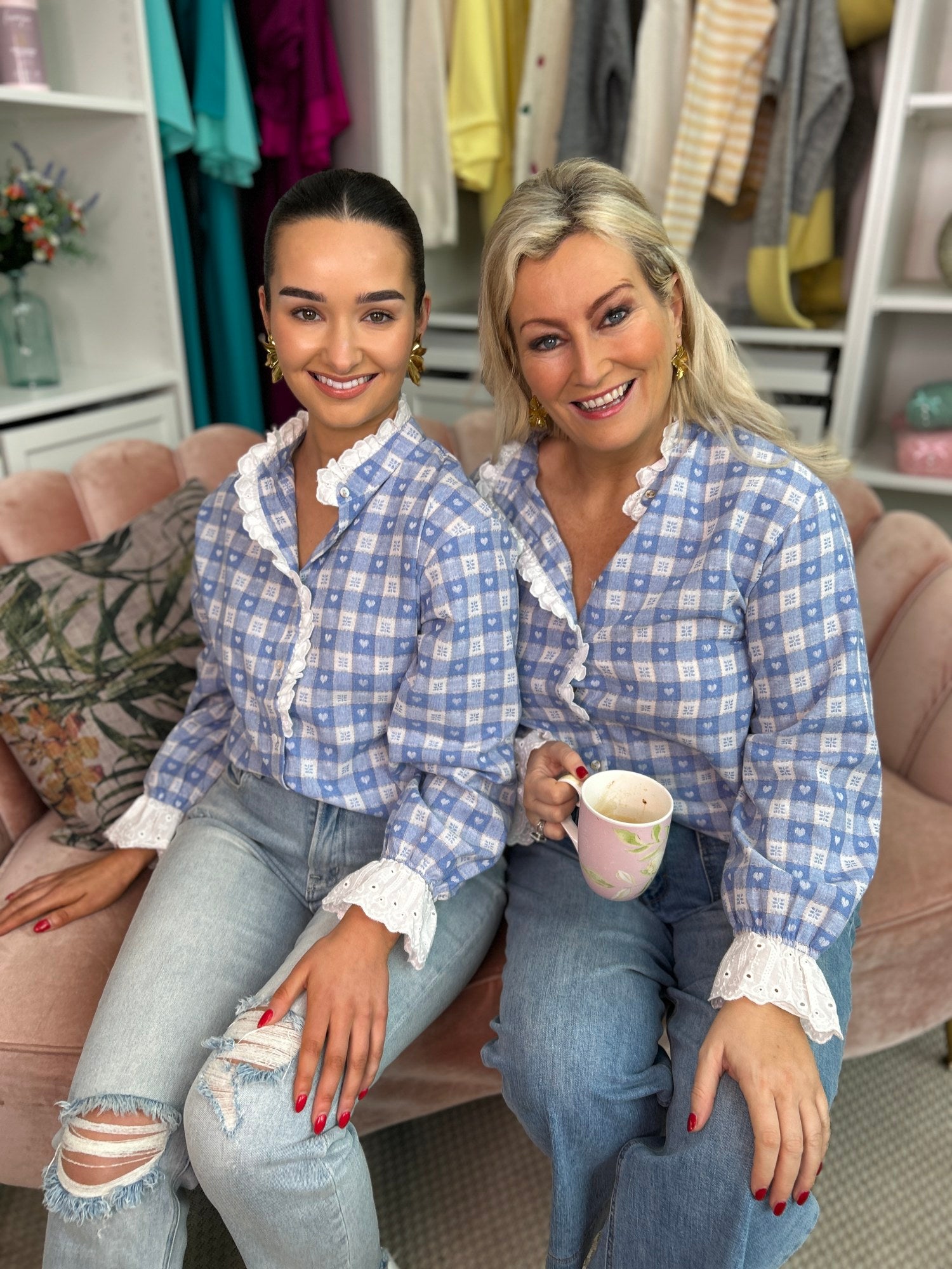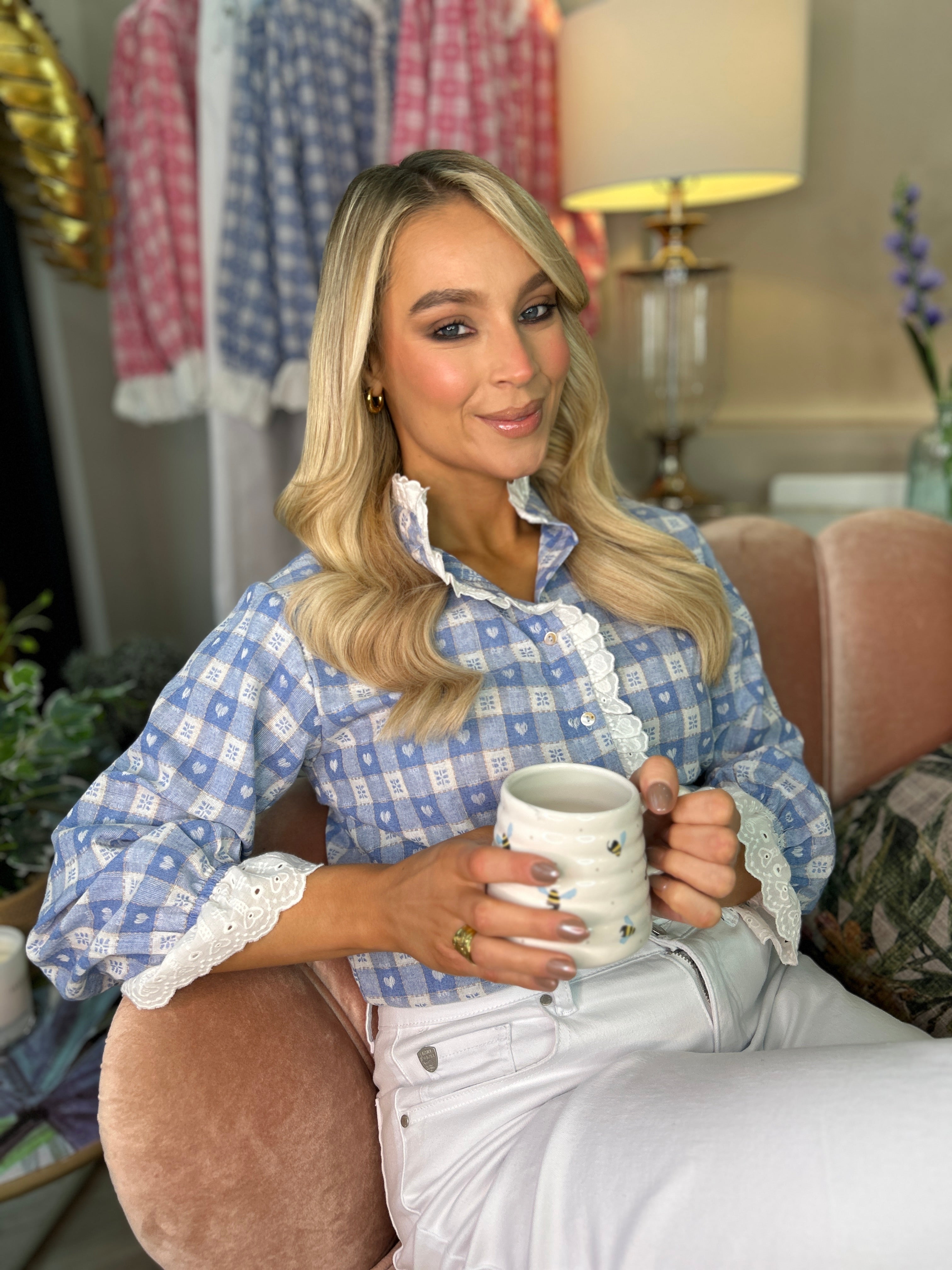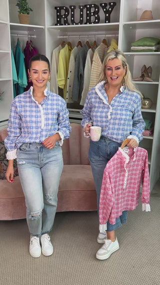 Introducing the Maisie Shirt, a refreshing blend of casual charm and sophisticated flair priced at €35.00. This blue check shirt is accentuated with delightful white ruffle details on the neck and cascading halfway down the front, offering a unique twist on classic design.