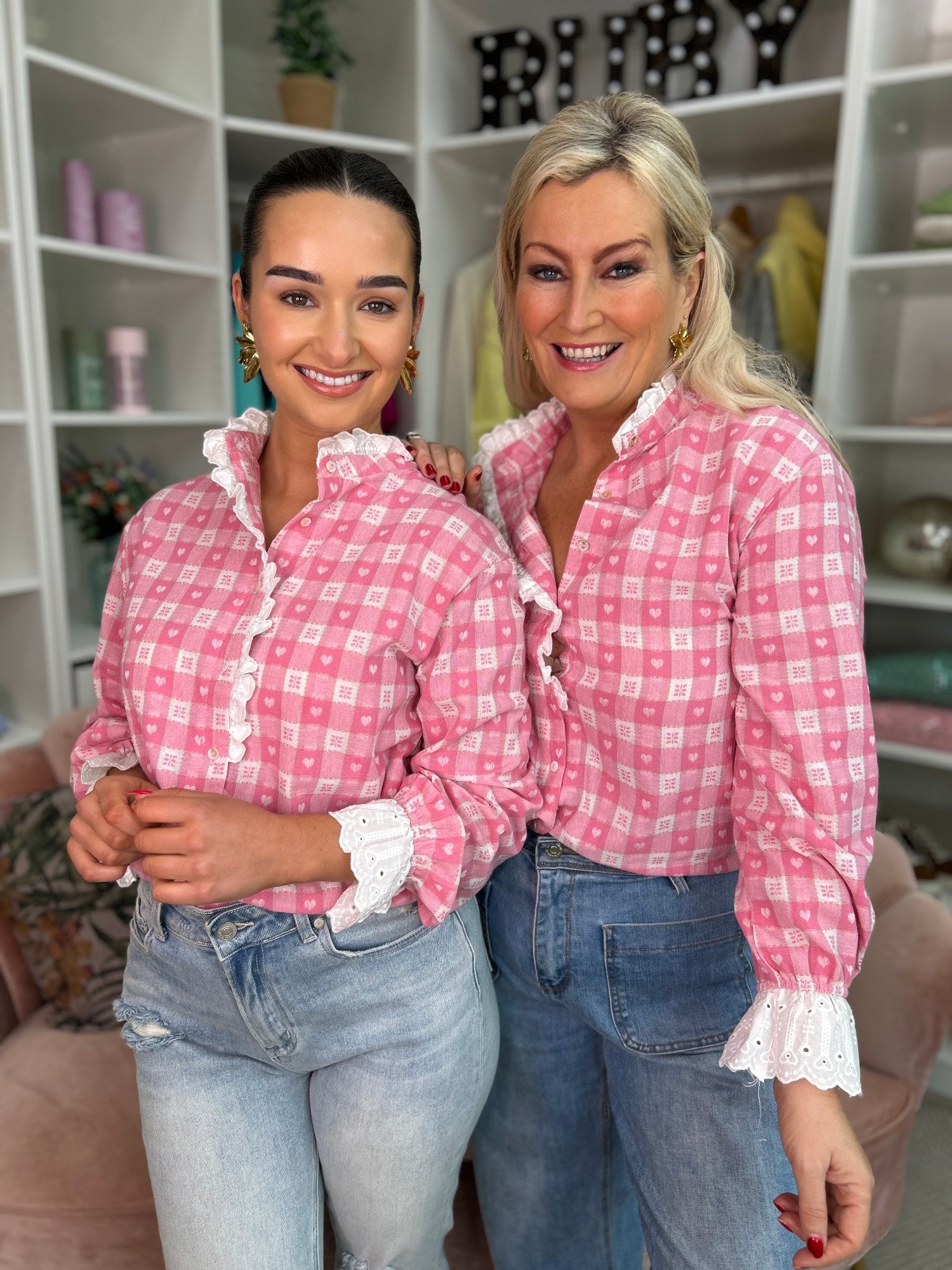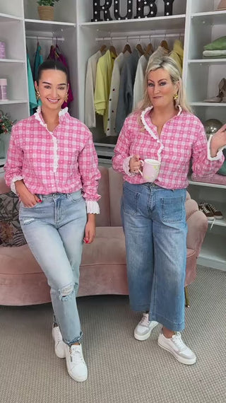 Introducing the Riley Shirt a stunning addition to your wardrobe that combines classic design with a twist of fun. Priced at €35.00, this check shirt delights with its unique white ruffle detail that gracefully lines the neck and cascades halfway down the front. Crafted with the utmost care, it promises both quality and comfort for any occasion.