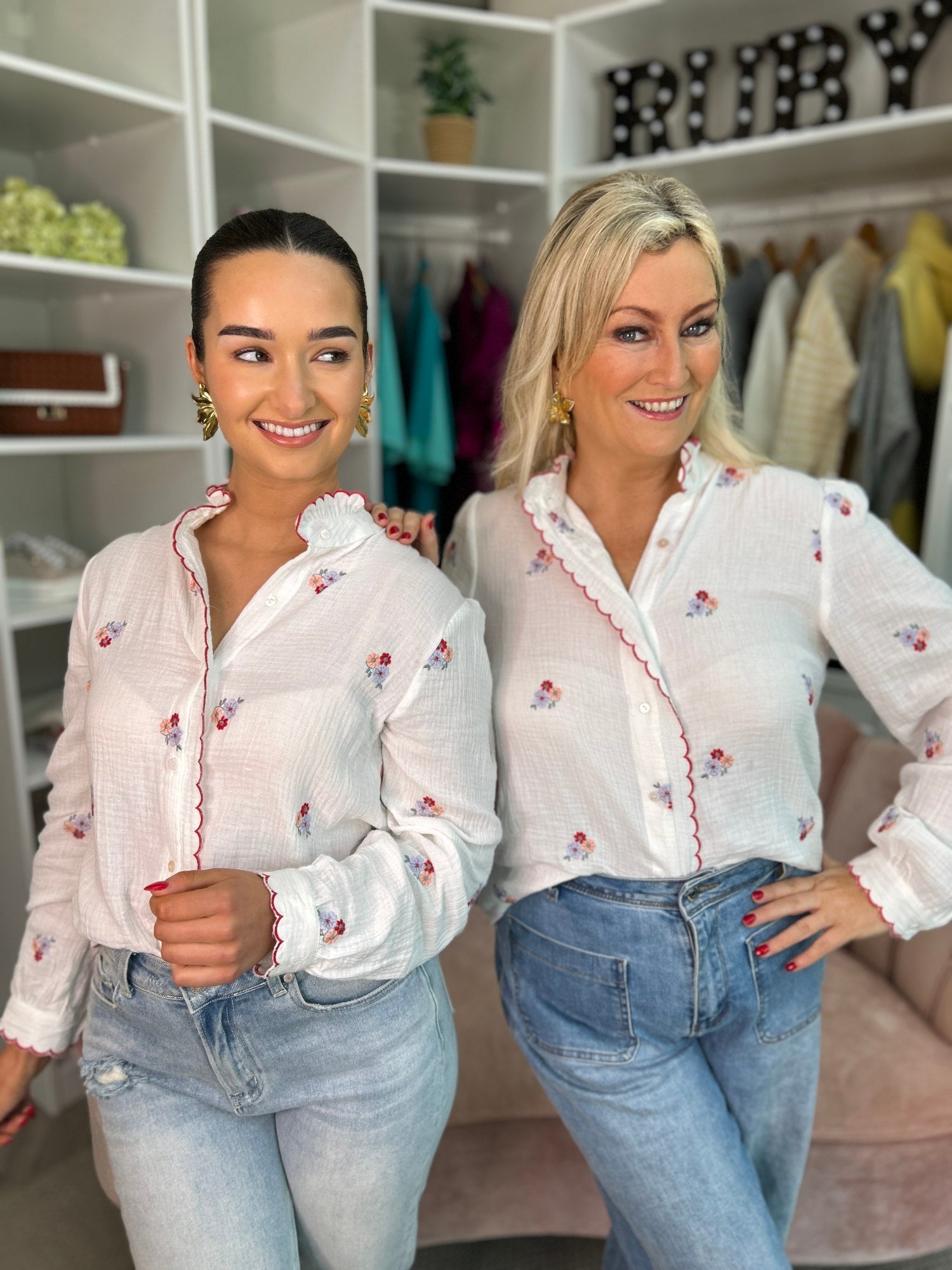 The Rose Shirt is a must-have addition to your wardrobe that brings a touch of floral elegance to any outfit. Priced at €39.00, this white shirt is adorned with a charming floral motif, adding a subtle yet sophisticated splash of color to your ensemble. The red piping around the neckline and down the front of the shirt provides a stunning contrast, making it a standout piece that's sure to catch the eye.