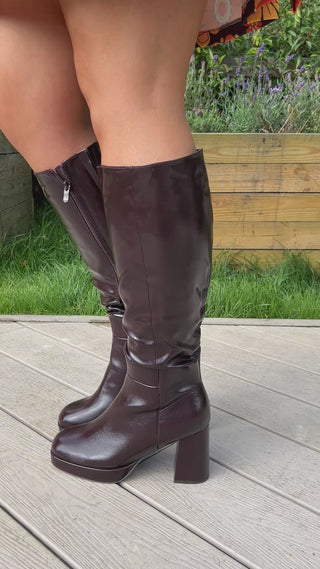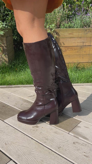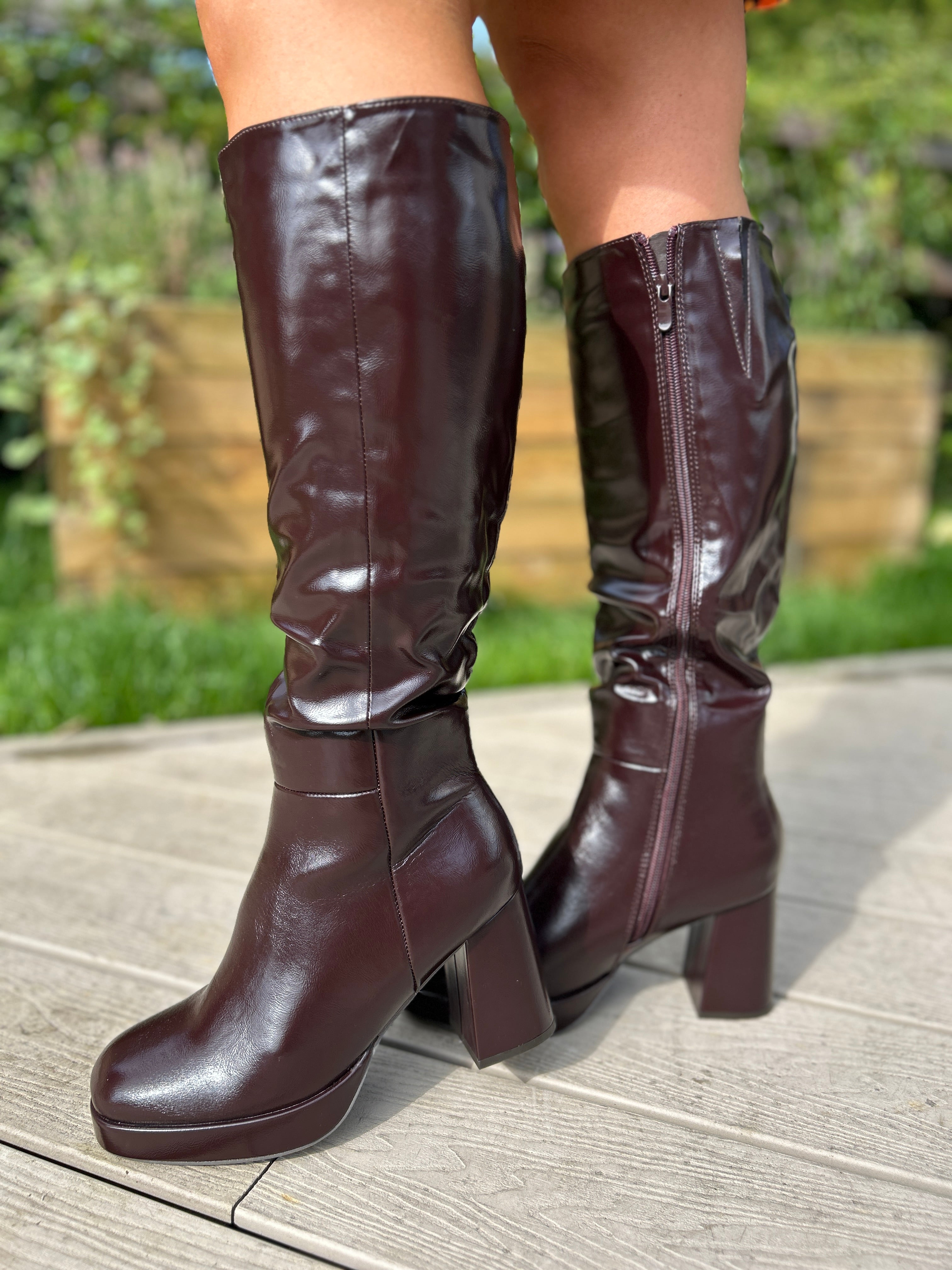 Step into vintage-inspired confidence with the Babette Boots – your new go-to for making bold moves in style. Crafted in a rich, glossy burgundy finish, these knee-high beauties bring serious 70s energy with a modern twist.