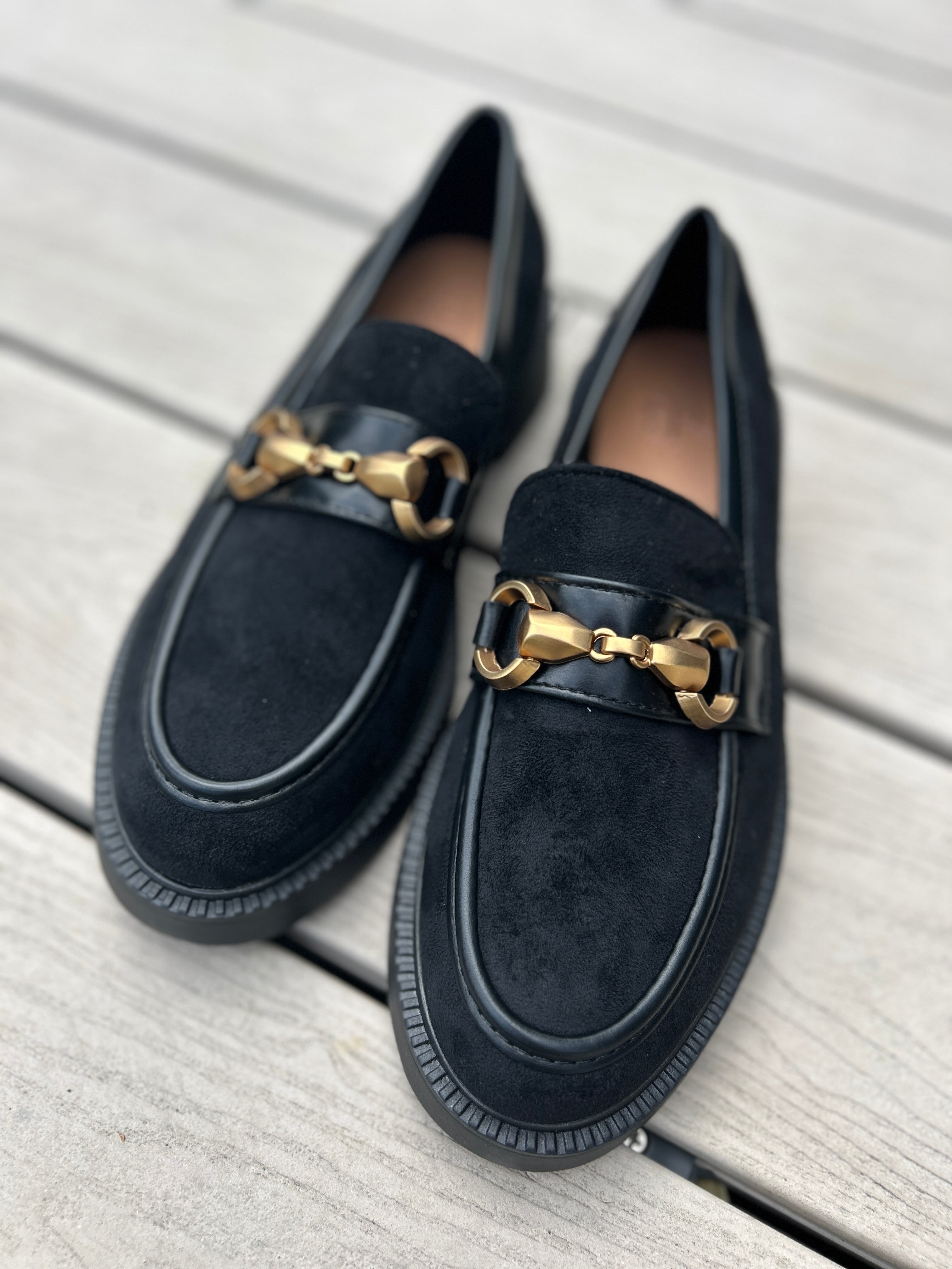 Step up your smart-casual game with these Luxe Suede Loafers in a classic black hue. Crafted from plush suede with smooth leather trim, they feature a striking gold horsebit detail that adds a touch of polish and timeless sophistication.