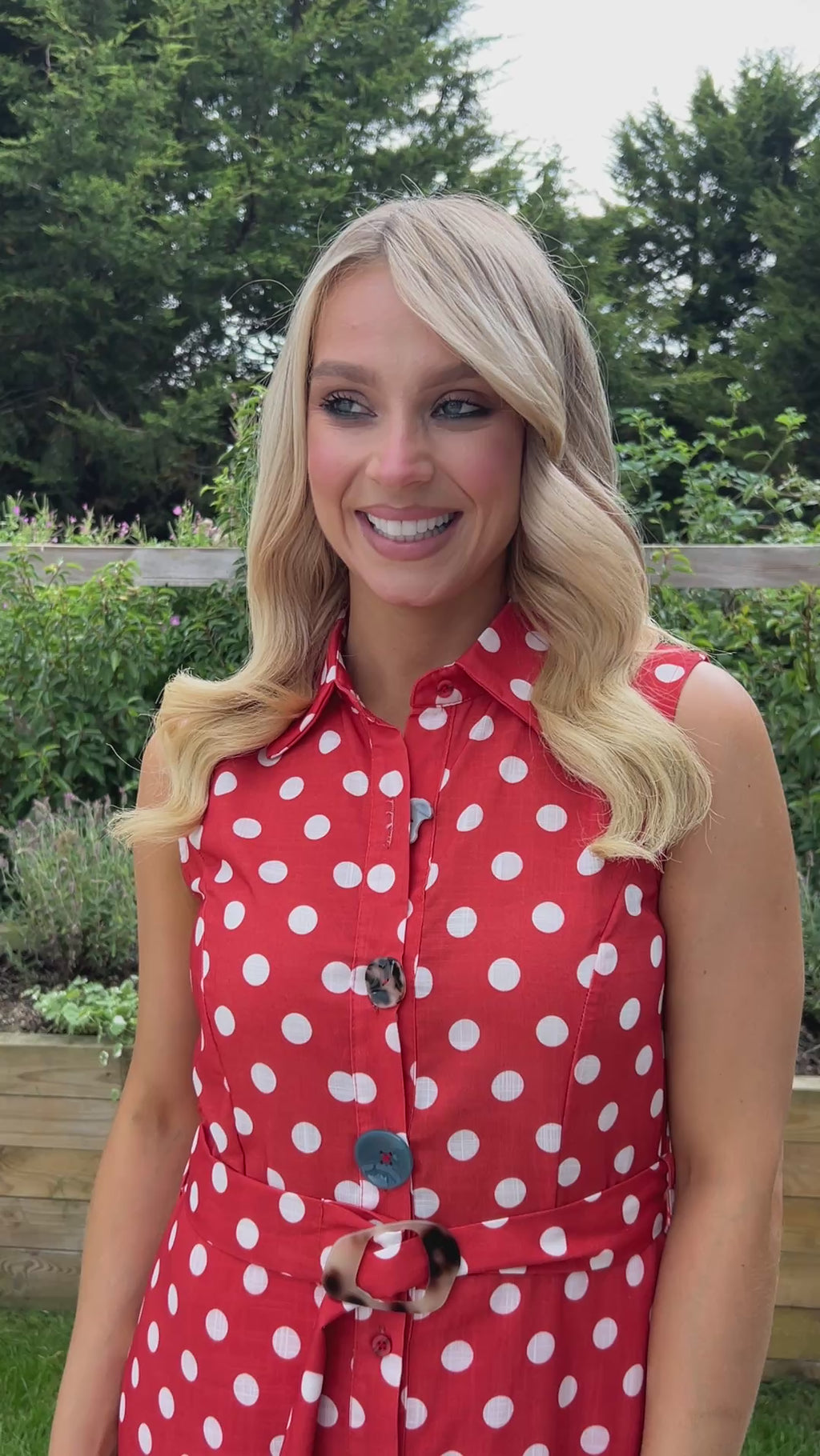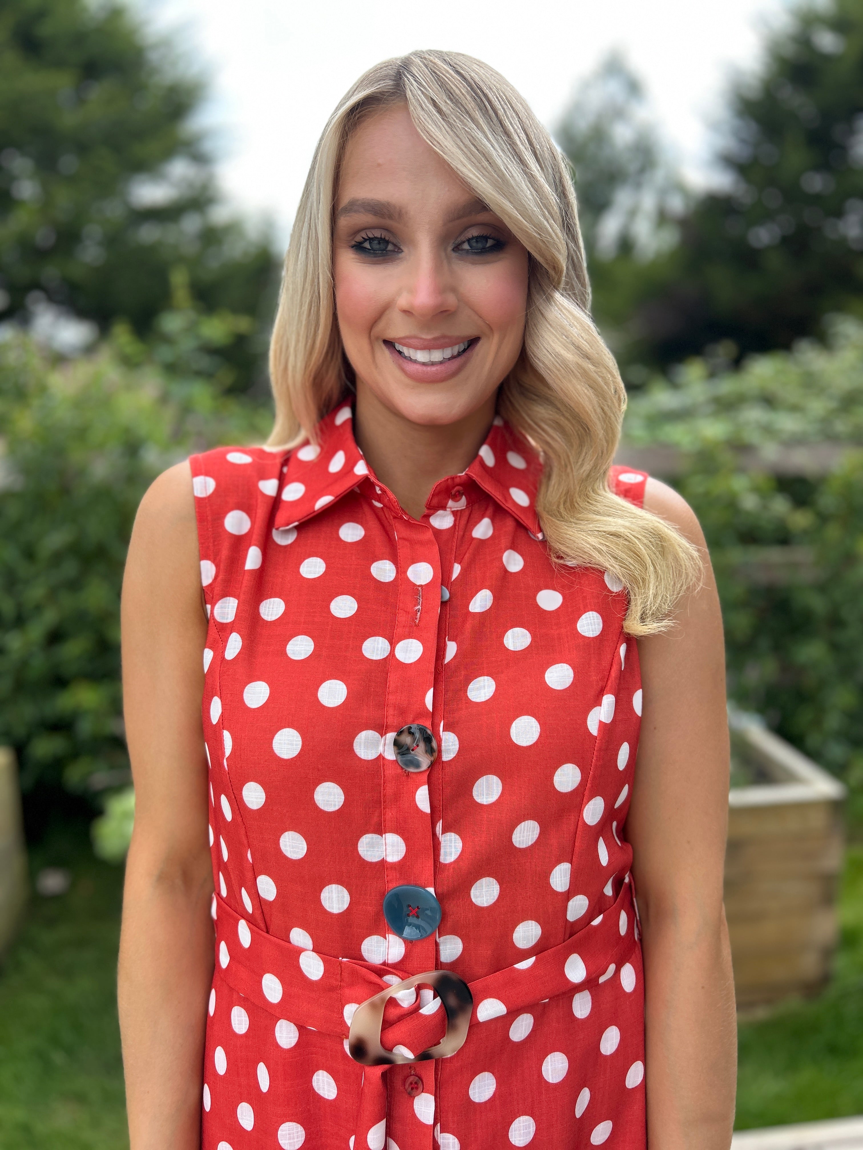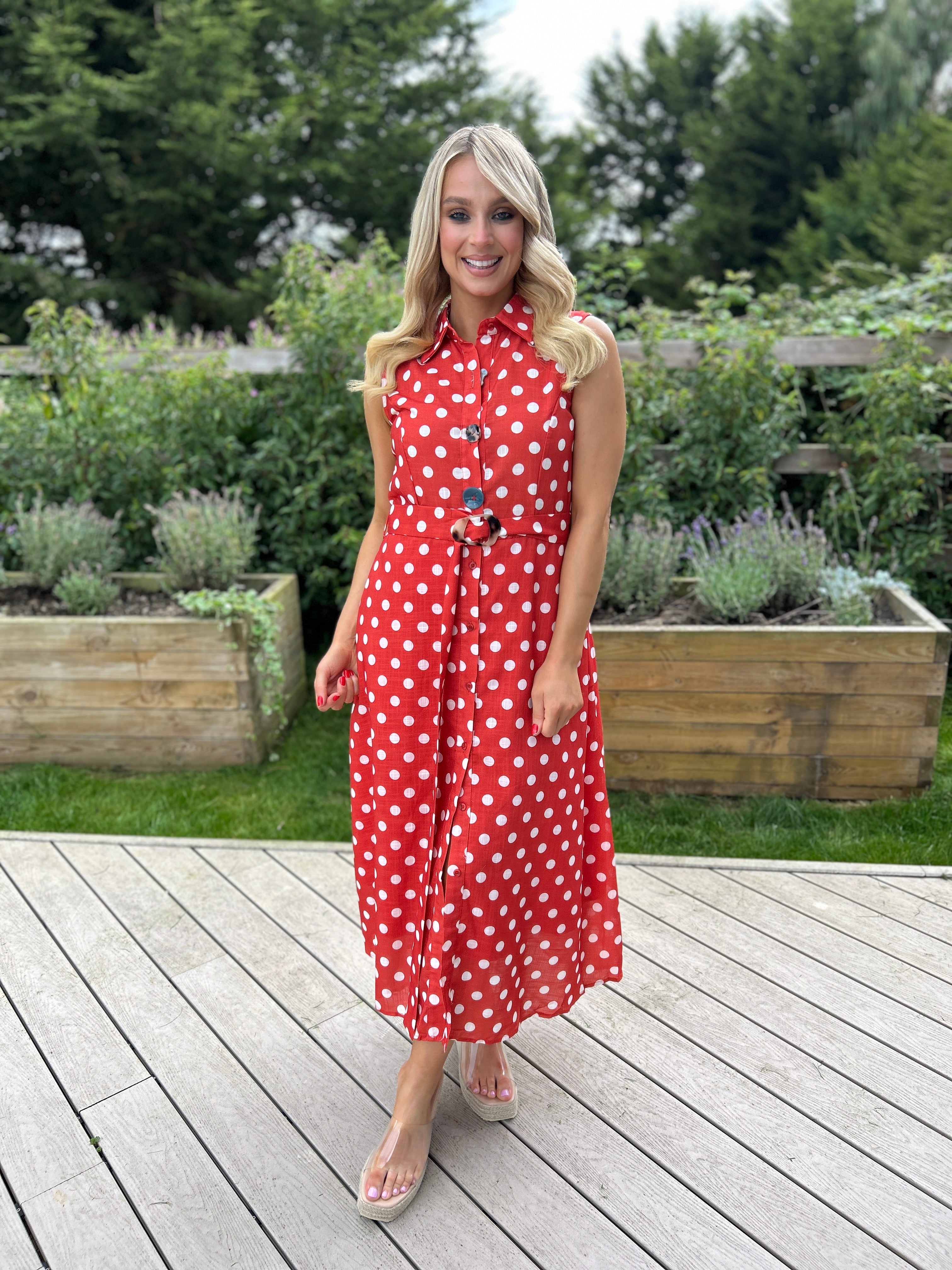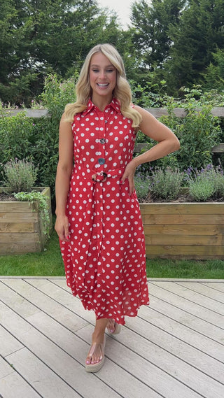 Turn heads and twirl with joy in the Dolli Dress, a sleeveless shirt dress with a playful vintage twist. Featuring a bold red base with classic white polka dots, this midi-length beauty is designed to flatter with a tie waist and full button-down front.