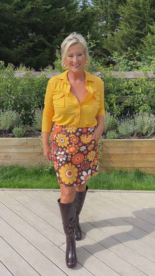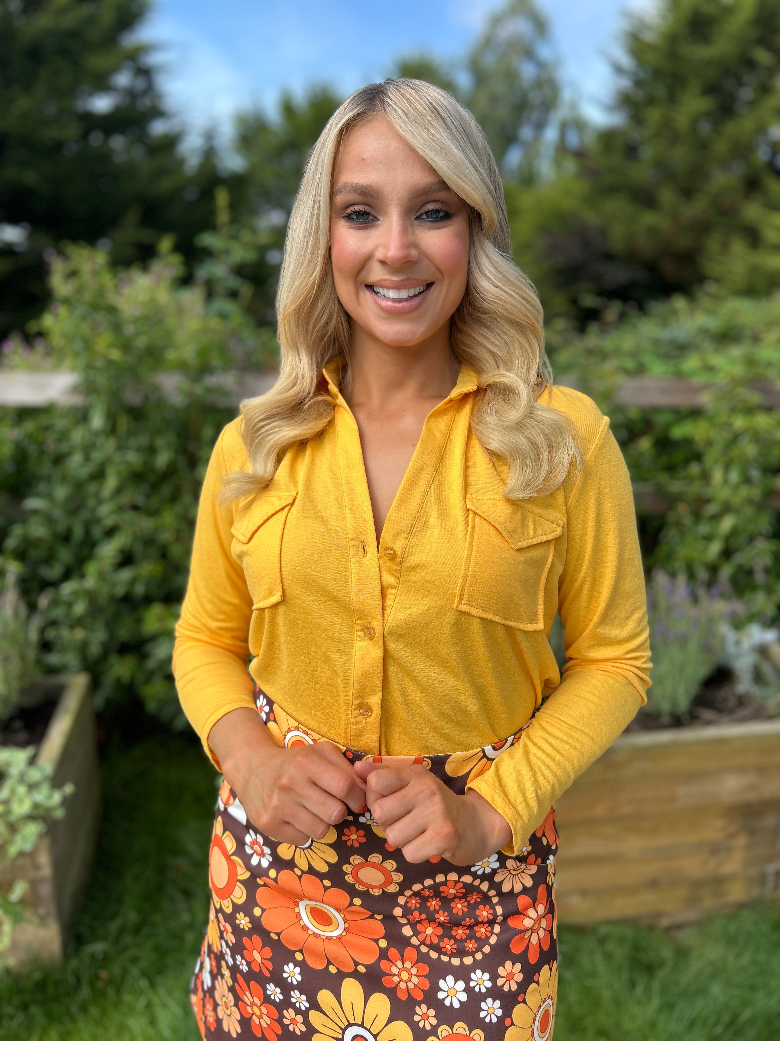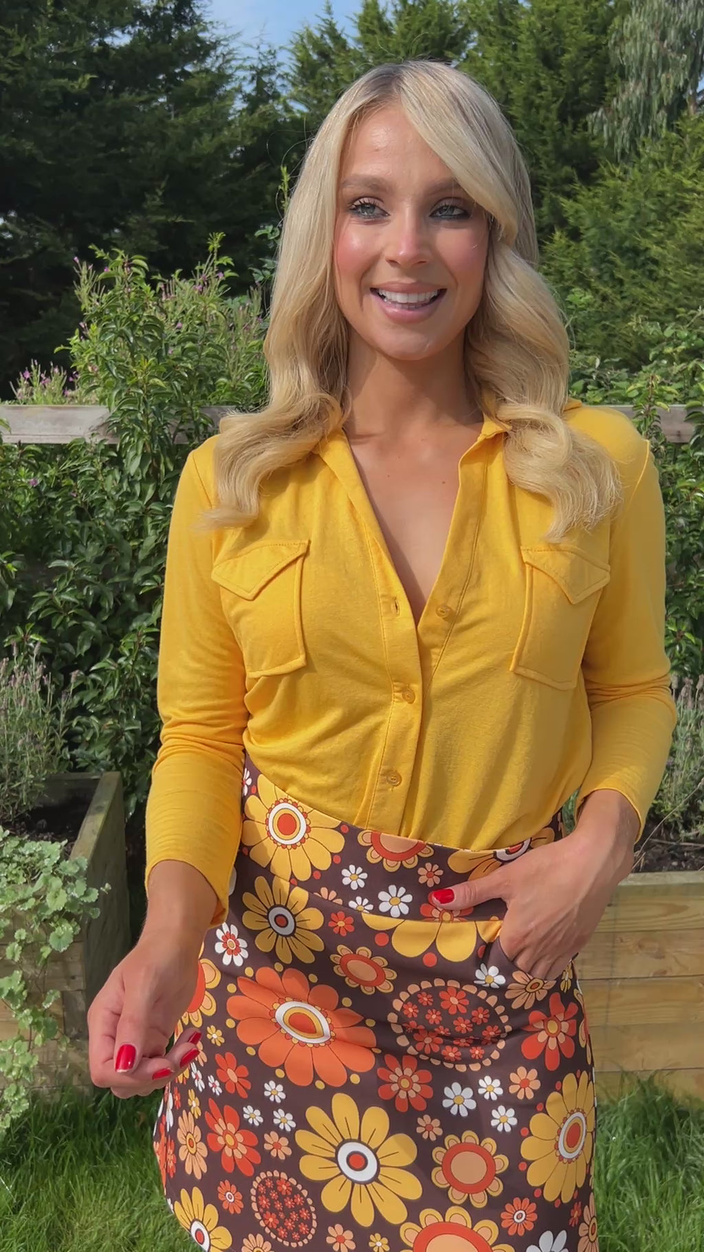 Say hello to retro charm with a pop of modern sunshine! The Daphne top is a feel-good staple in a bold mustard hue that instantly lifts your look. Crafted from a soft, stretch-infused fabric, it features classic button-up styling, patch pockets, and a flattering slim fit that tucks beautifully into high-waisted skirts or denim.