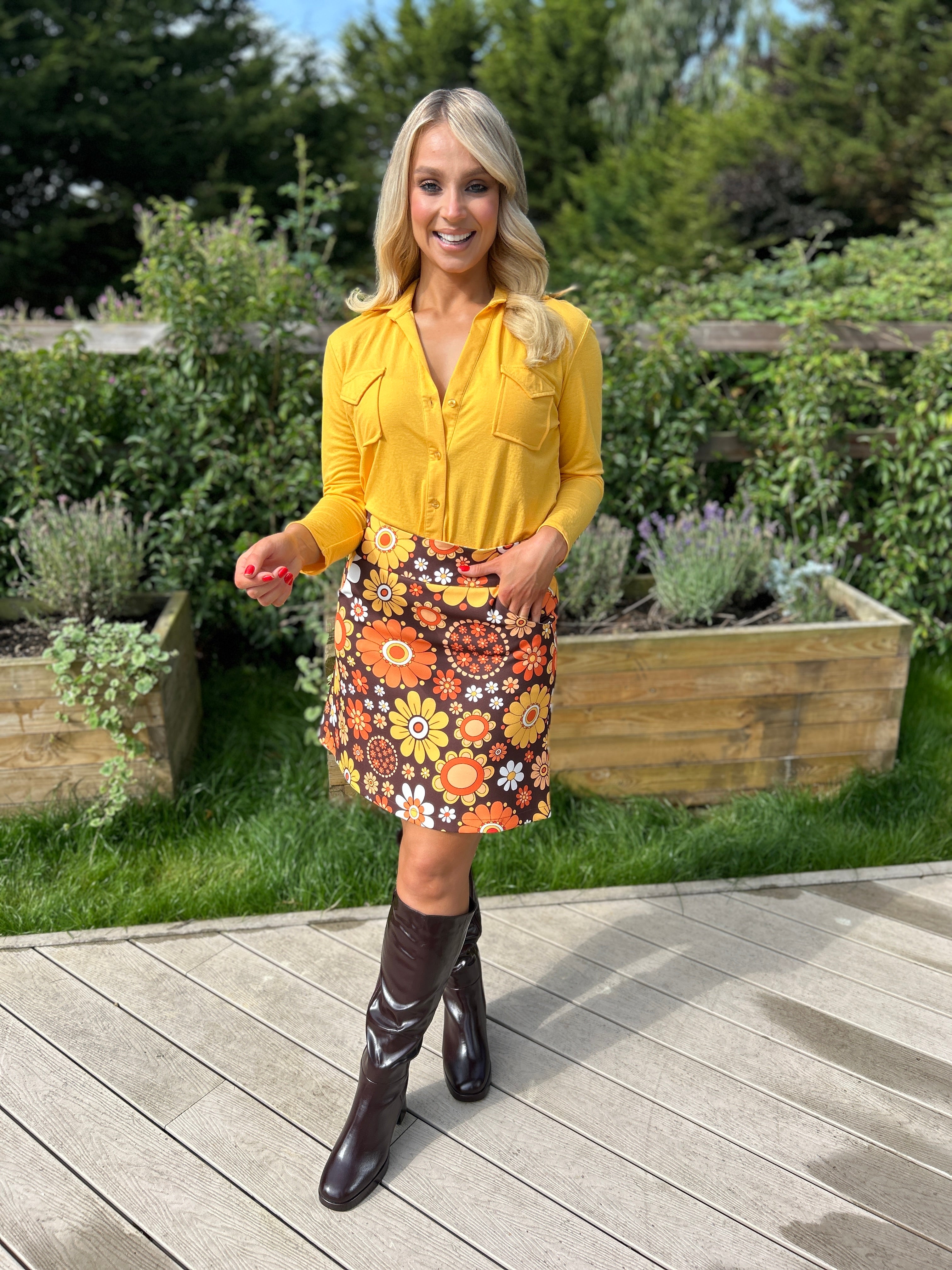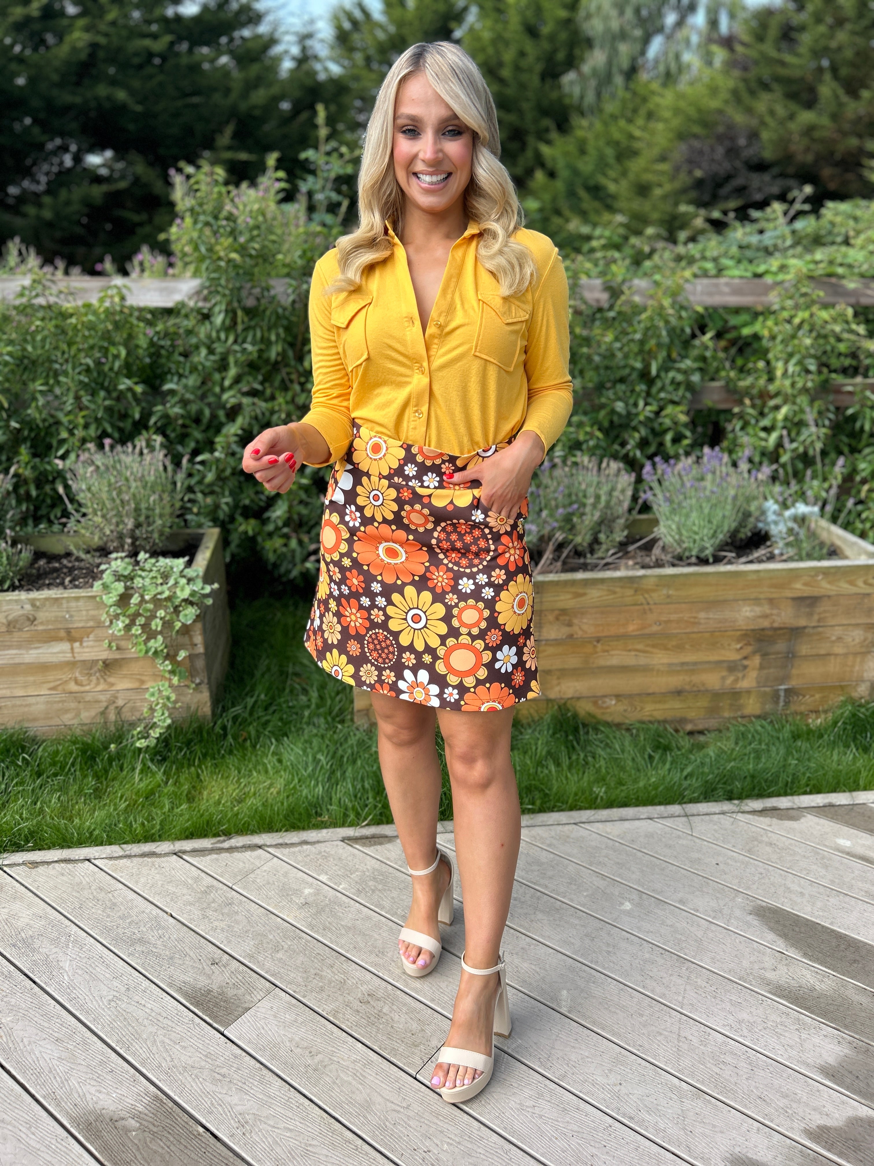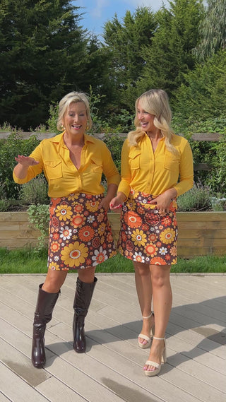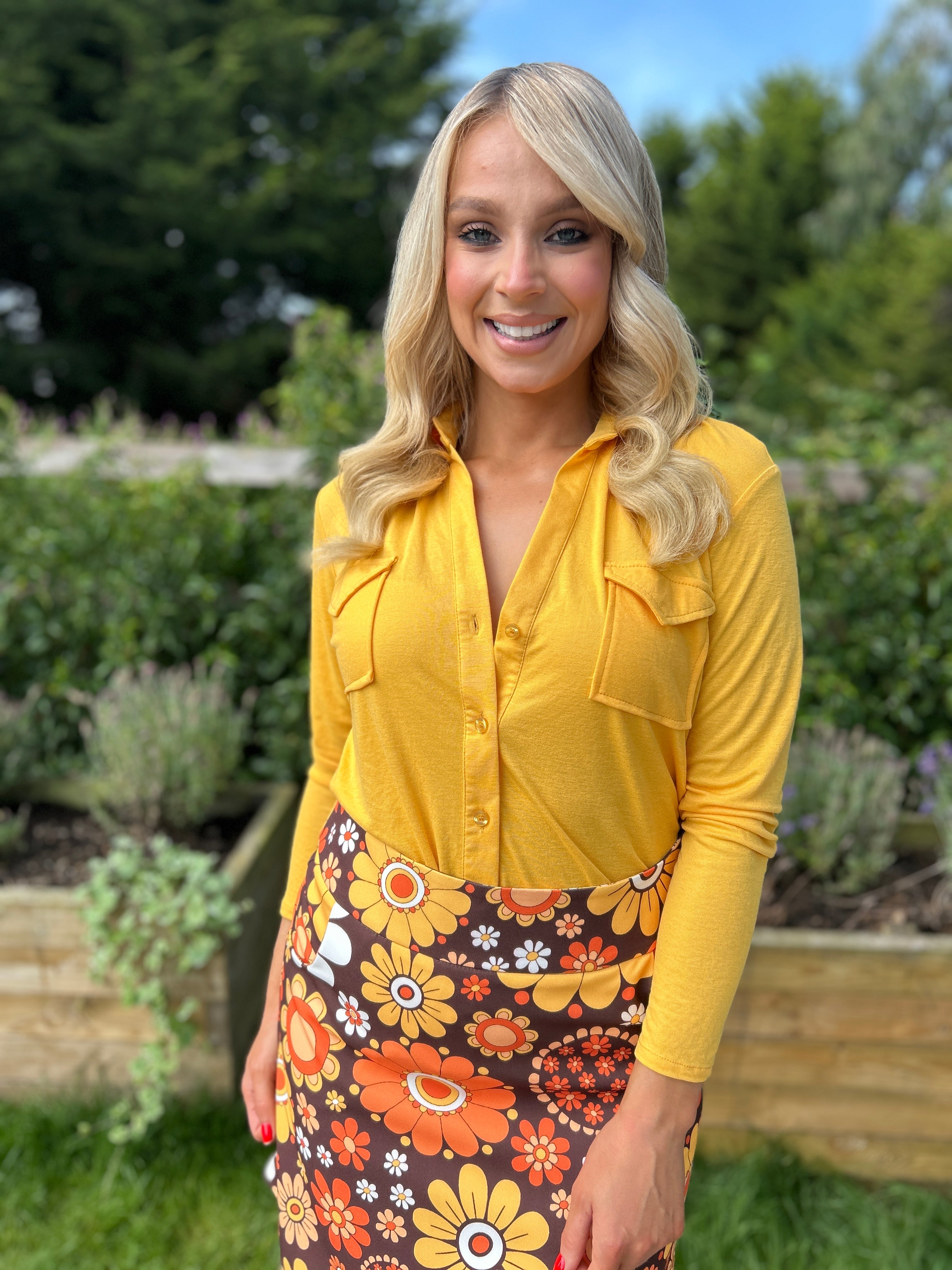 Say hello to retro charm with a pop of modern sunshine! The Daphne top is a feel-good staple in a bold mustard hue that instantly lifts your look. Crafted from a soft, stretch-infused fabric, it features classic button-up styling, patch pockets, and a flattering slim fit that tucks beautifully into high-waisted skirts or denim.