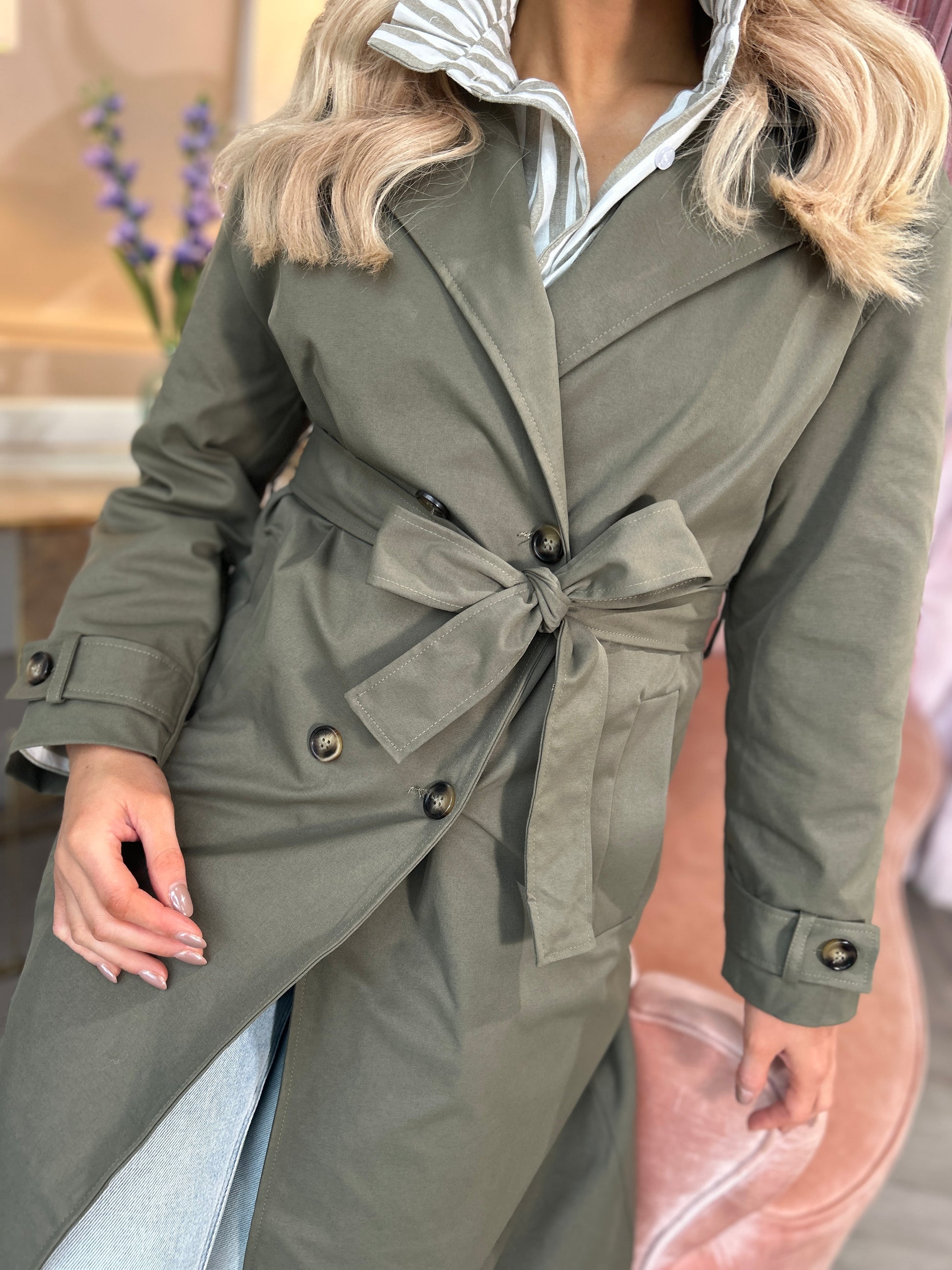 Meet your new wardrobe staple: the Addison Trench Coat in on-trend khaki, Crafted with attention to detail, this trench coat boasts a classic silhouette with a modern twist, featuring a belted waist to define your figure and a sophisticated lapel that adds a touch of elegance to any look.
