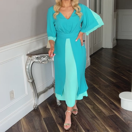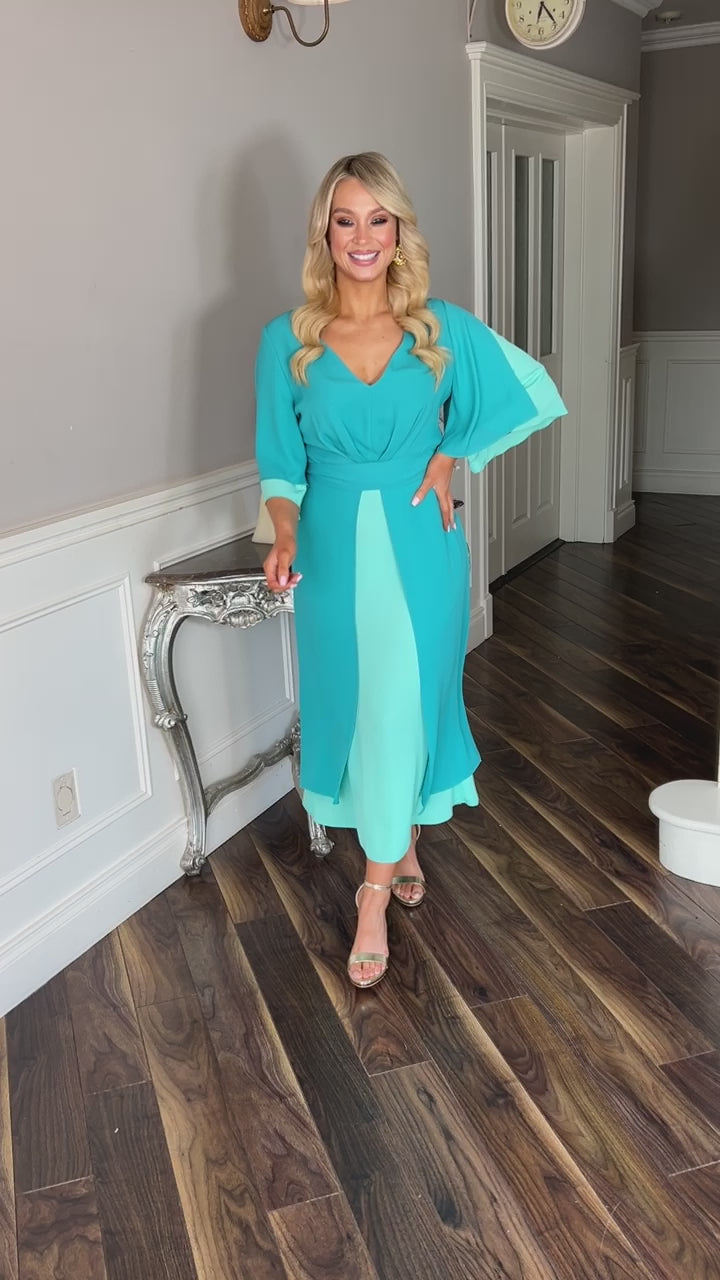 Indulge in sophistication and grace with our Arabella Turquoise Dress. Crafted with a chiffon overlay fabric, this occasion dress exudes luxury. The v neck and half sleeve add delicate touches, while the zip to the back ensures a perfect fit. In a majestic shade of turquoise, this midi length dress will elevate your style.