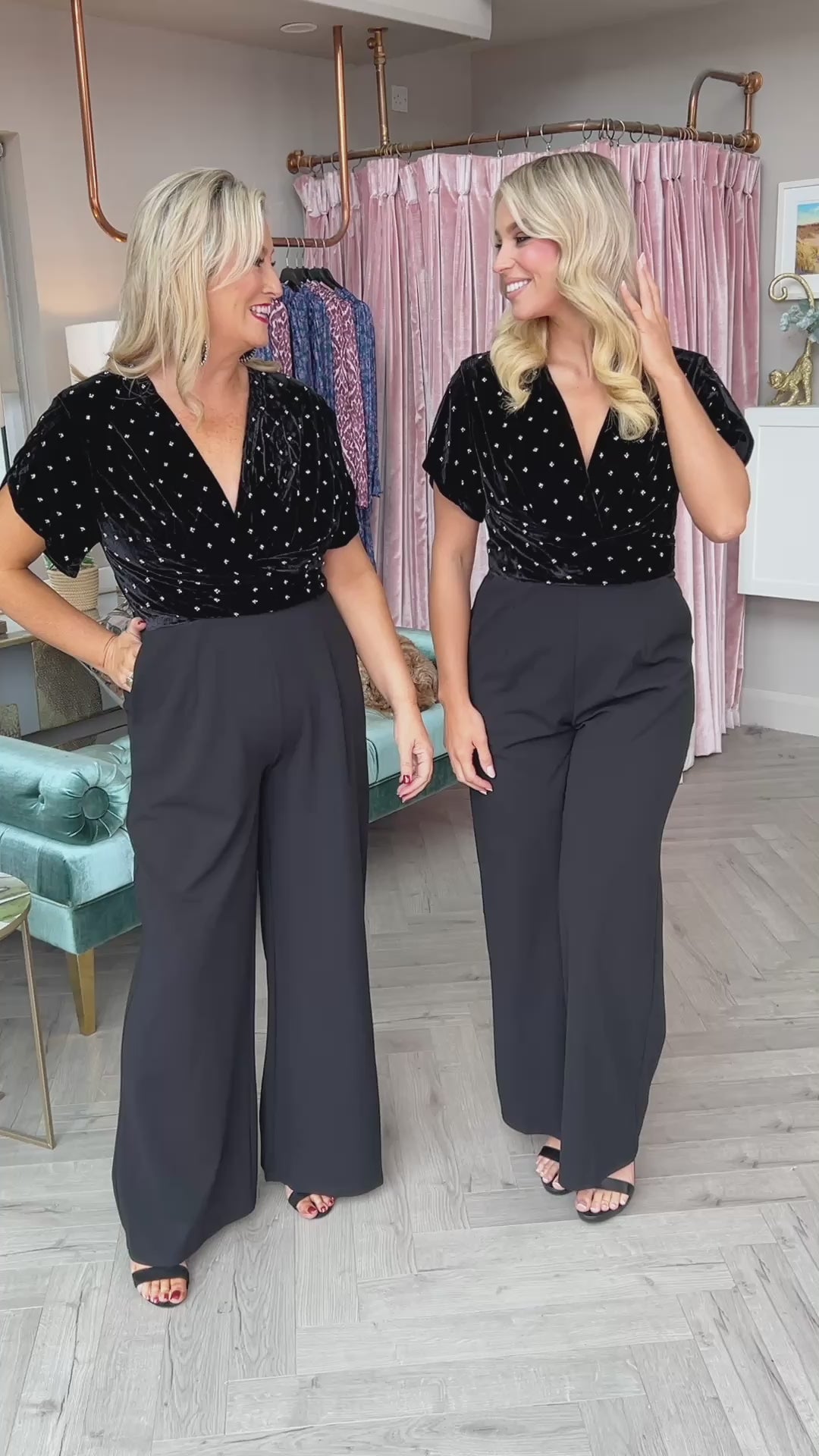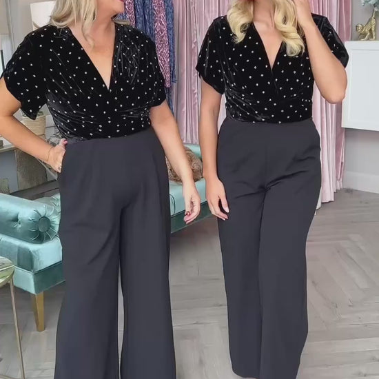 Step into effortless glamour with the Bridgette Jumpsuit. This show-stopping piece features a luxe velvet wrap bodice adorned with diamanté embellishments, paired with sleek wide-leg trousers for a perfectly balanced silhouette. Designed with comfort and style in mind, it also includes functional side pockets for a practical touch. The ultimate day-to-night outfit, ideal for party season, black-tie events, or a chic evening out.