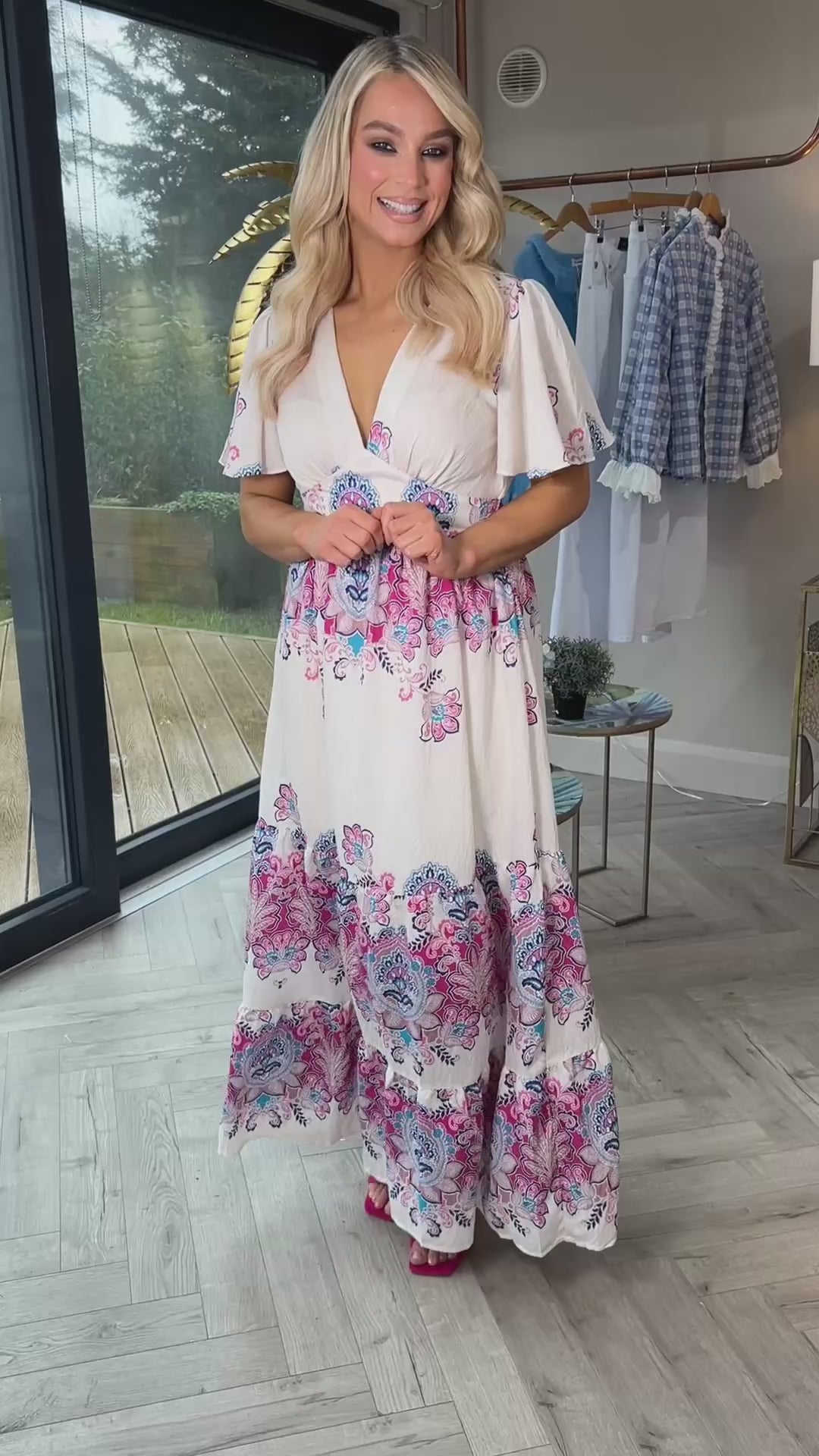 A staff favourite, the Claudia Boho Print Dress is a stunning addition to your wardrobe that balances effortless elegance with a touch of whimsy. Priced at €49.00, this v-neck midi dress features a captivating floral pattern with hints of blue and pink, making it a perfect piece for any summer occasion. The pretty, feminine floaty sleeves add a delicate touch to the overall design, ensuring you look graceful wherever you go.