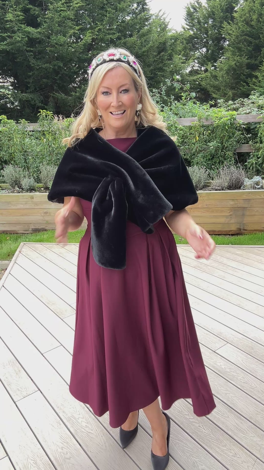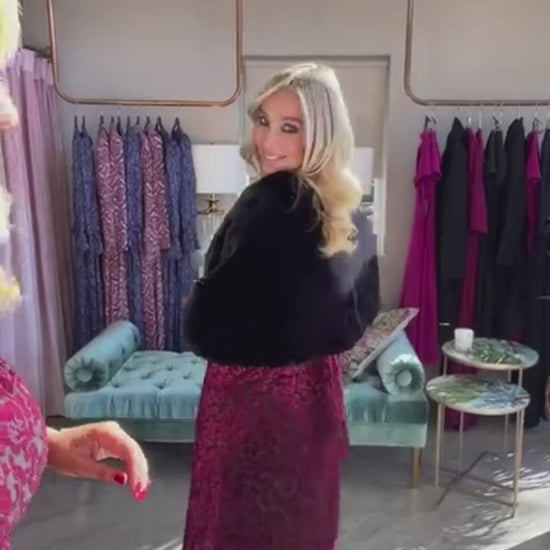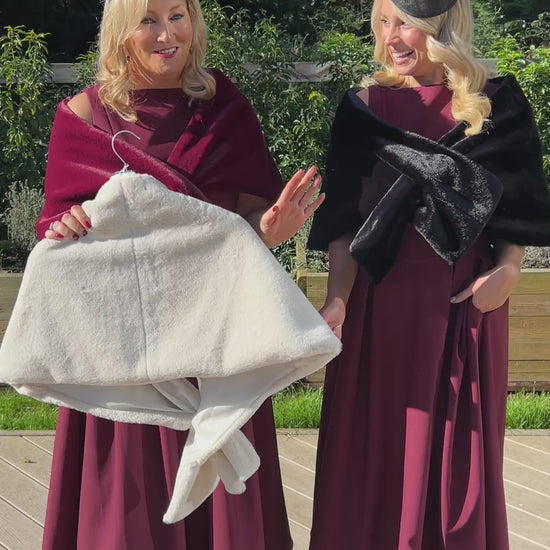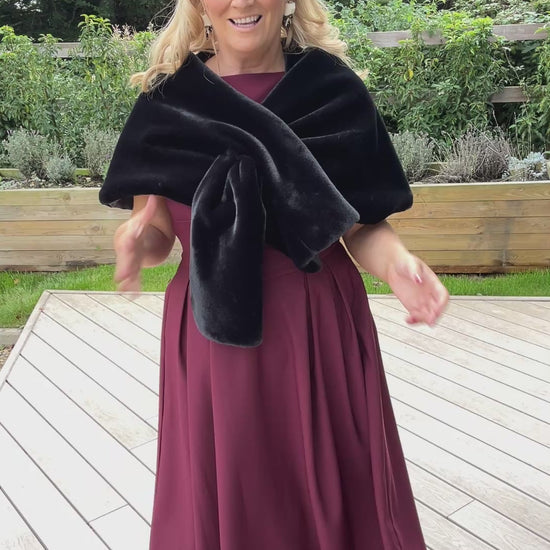 Elevate your elegance with this black faux fur stole, crafted from luxuriously soft faux fur and finished with a smooth satin lining. Perfect for adding a refined touch to your evening wear or special occasions, it offers warmth and style without compromising on comfort. A timeless accessory designed to enhance your sophisticated wardrobe.