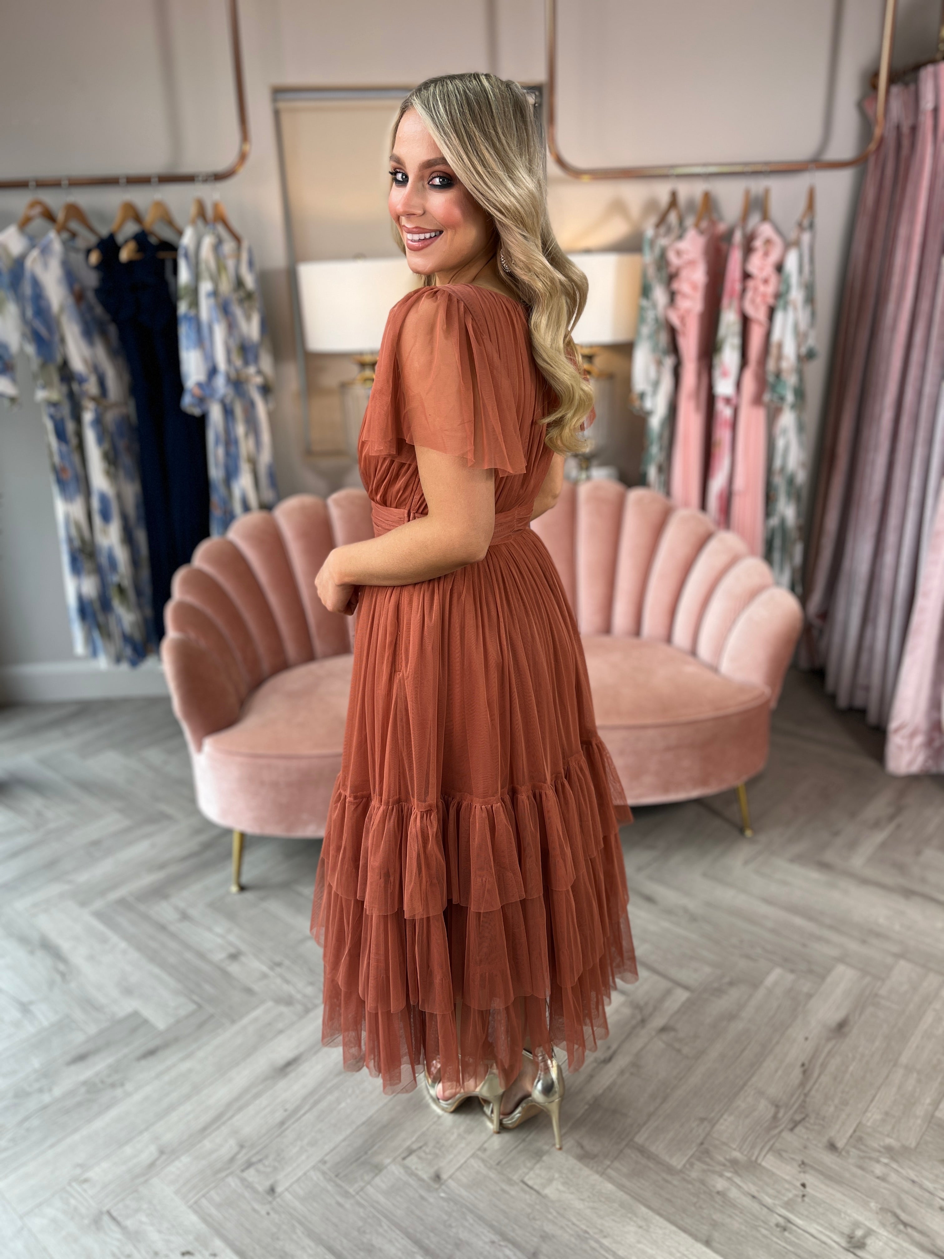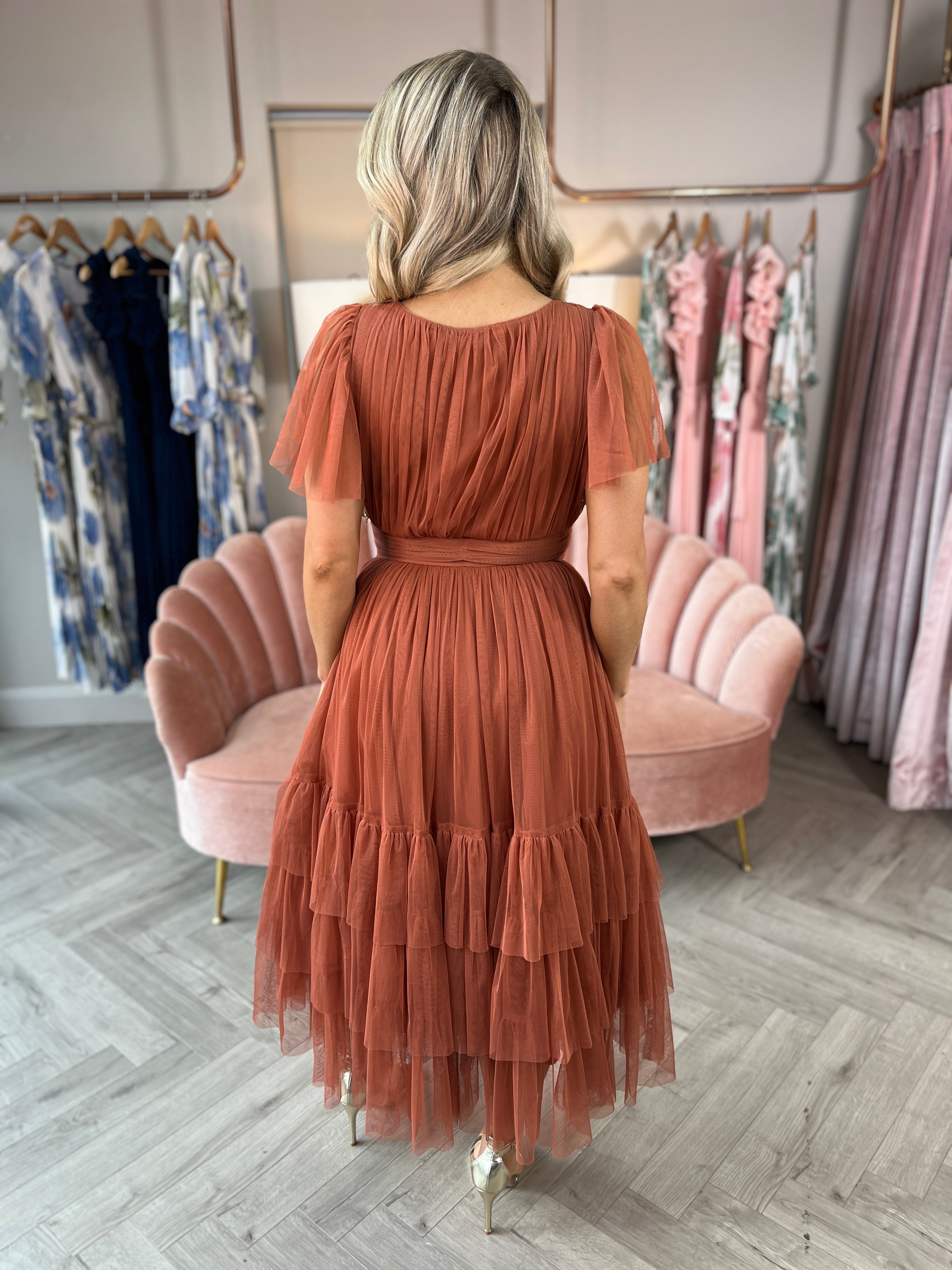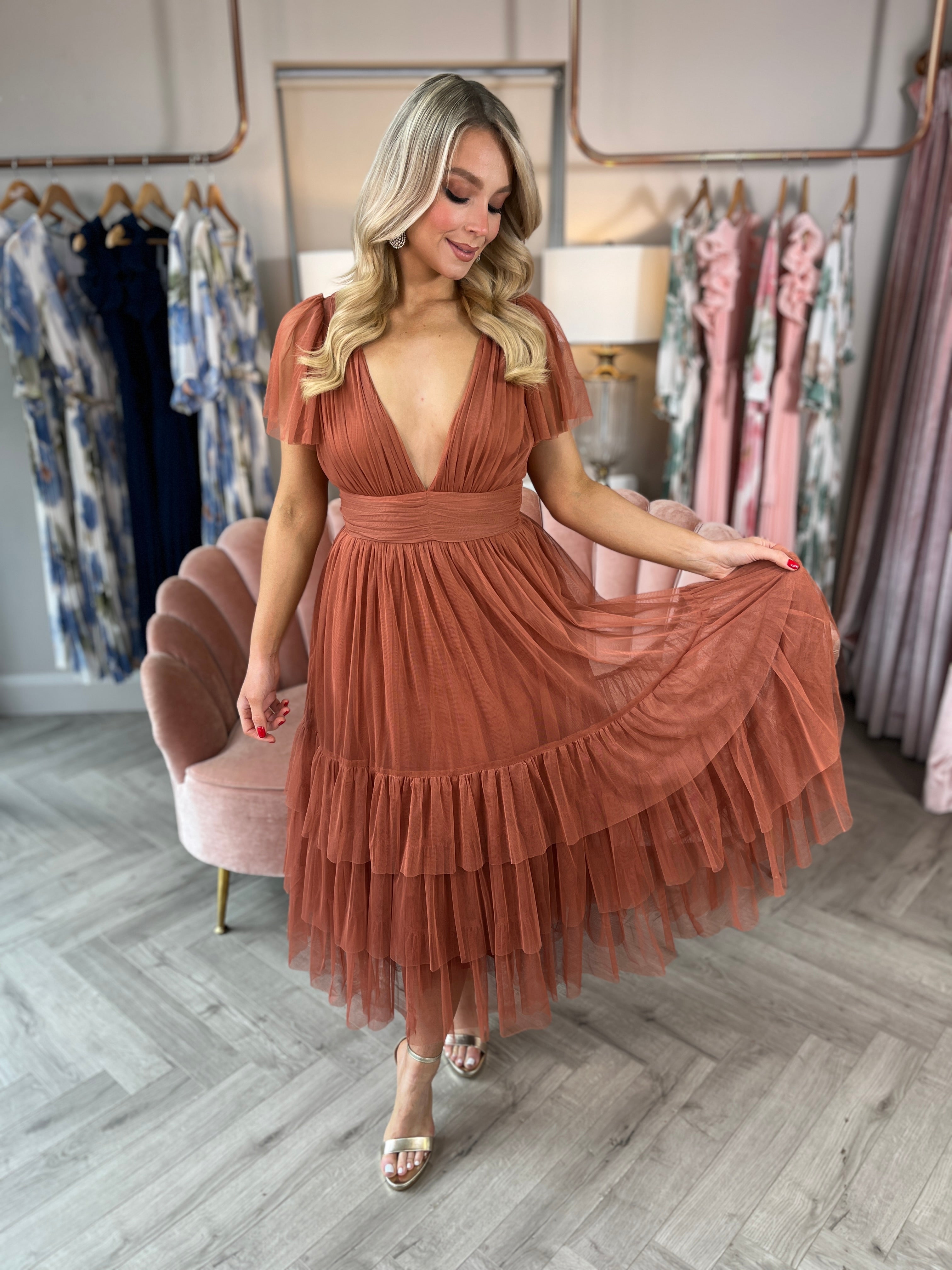 Elevate your style with our Madeline Midi Dress in a gorgeous brick colour! This dress features a flattering plunge neckline, a midi length, and a tiered skirt for a stunning and unique look, this dress will make you stand out with its elegant and chic design.
