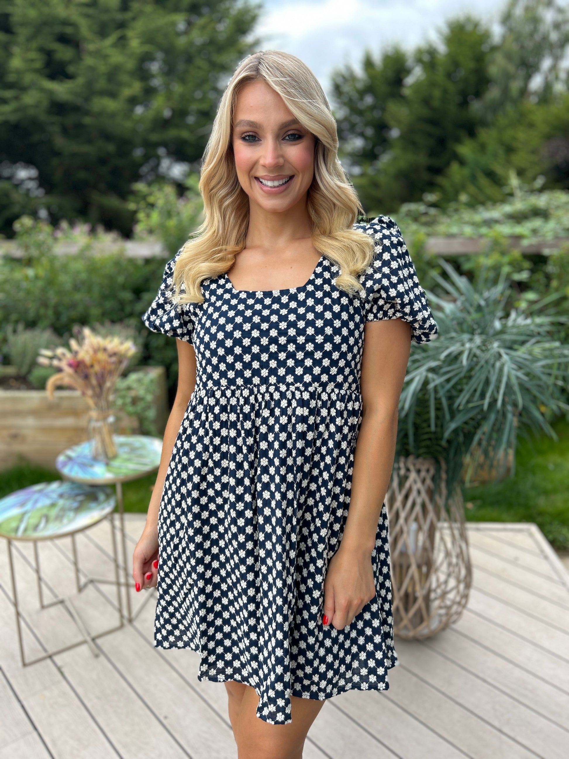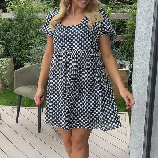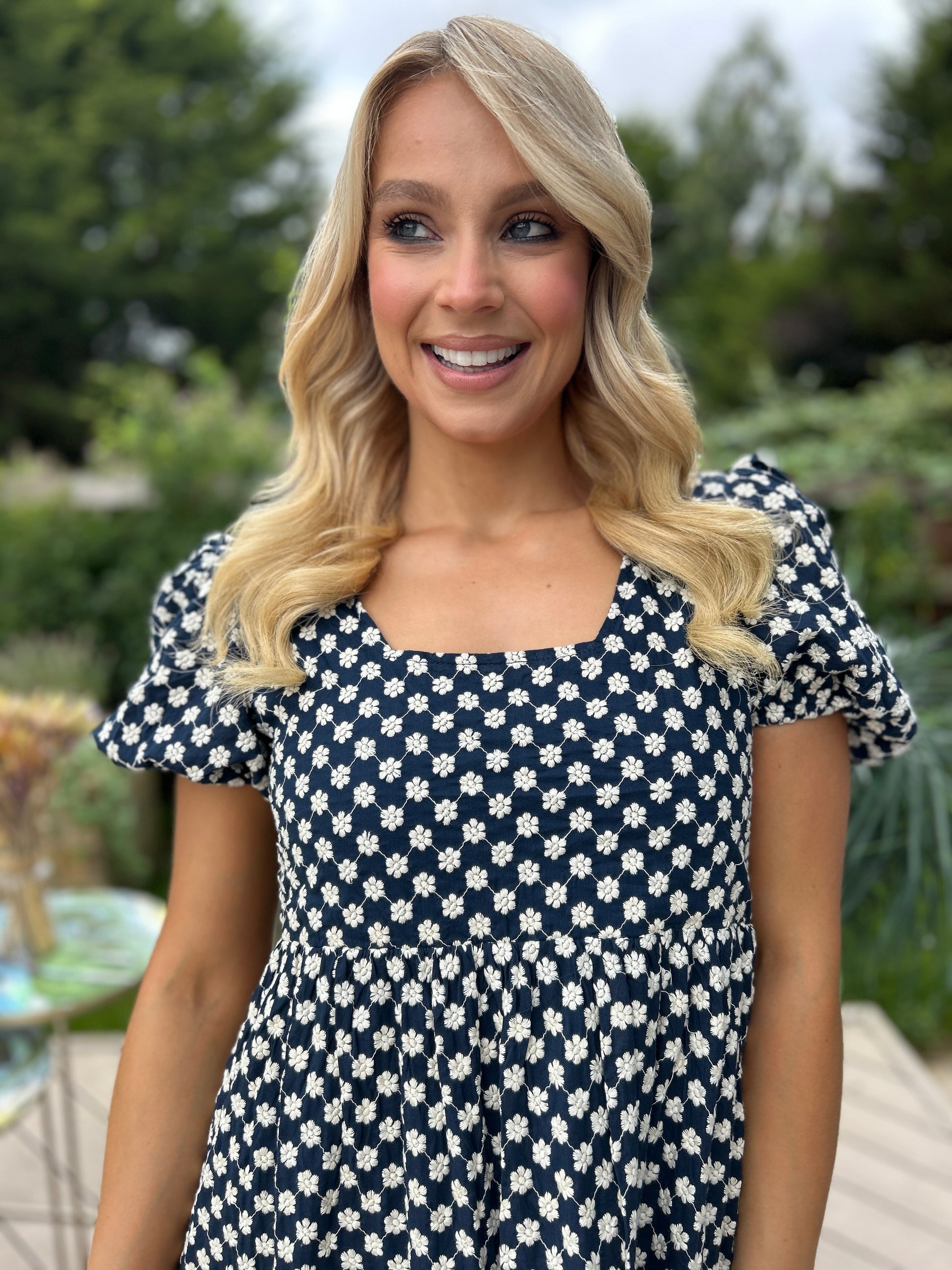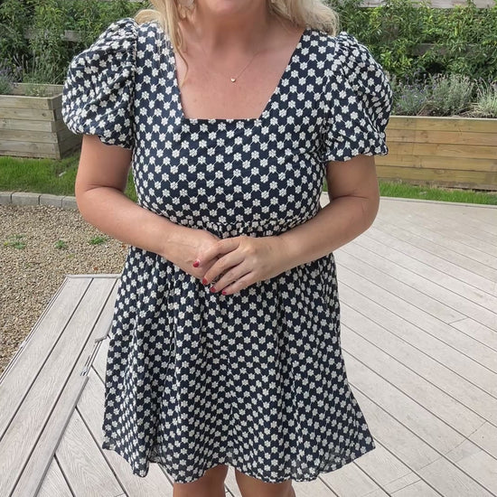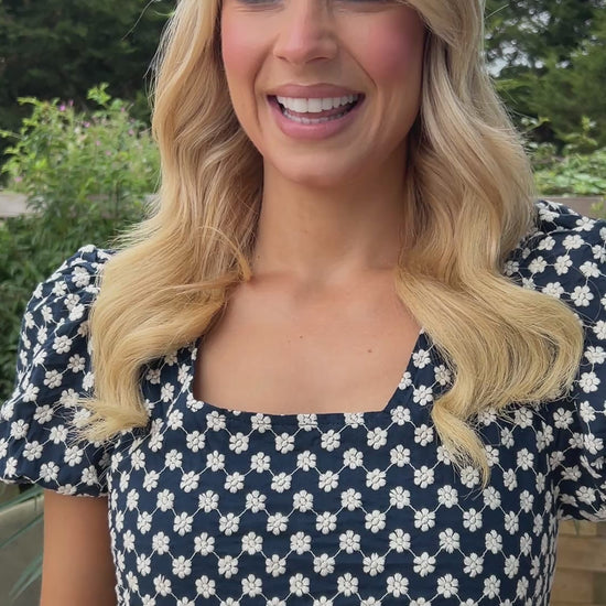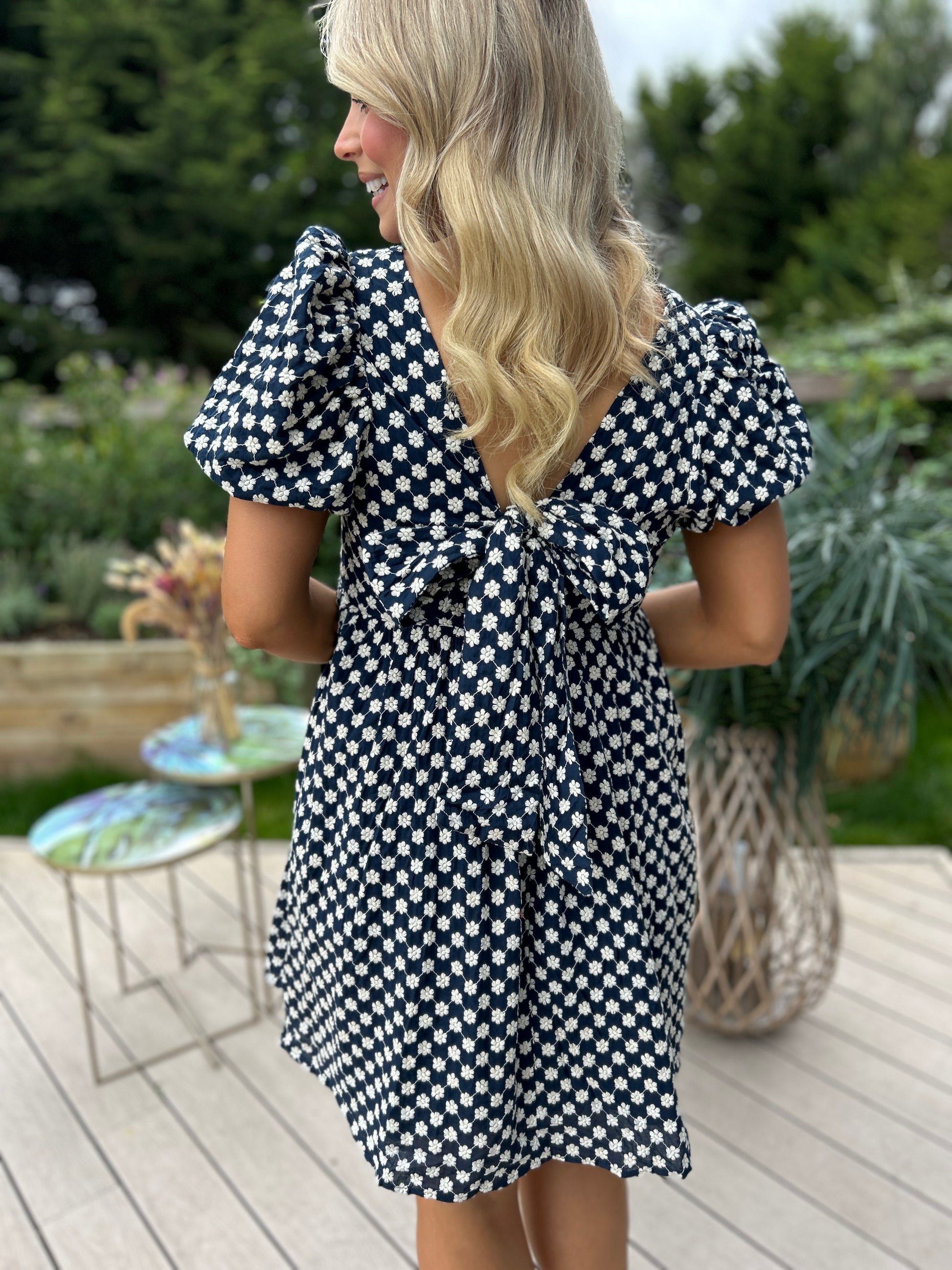 Sweet yet sophisticated, the Paige Dress is all about charming details. Crafted from a beautifully heavy embroidered fabric, it features a chic bow-tie back with a subtle cut-out, giving it a playful twist. Short puff sleeves and a lined finish keep it both elegant and comfortable — the perfect dress for special occasions or daytime chic.