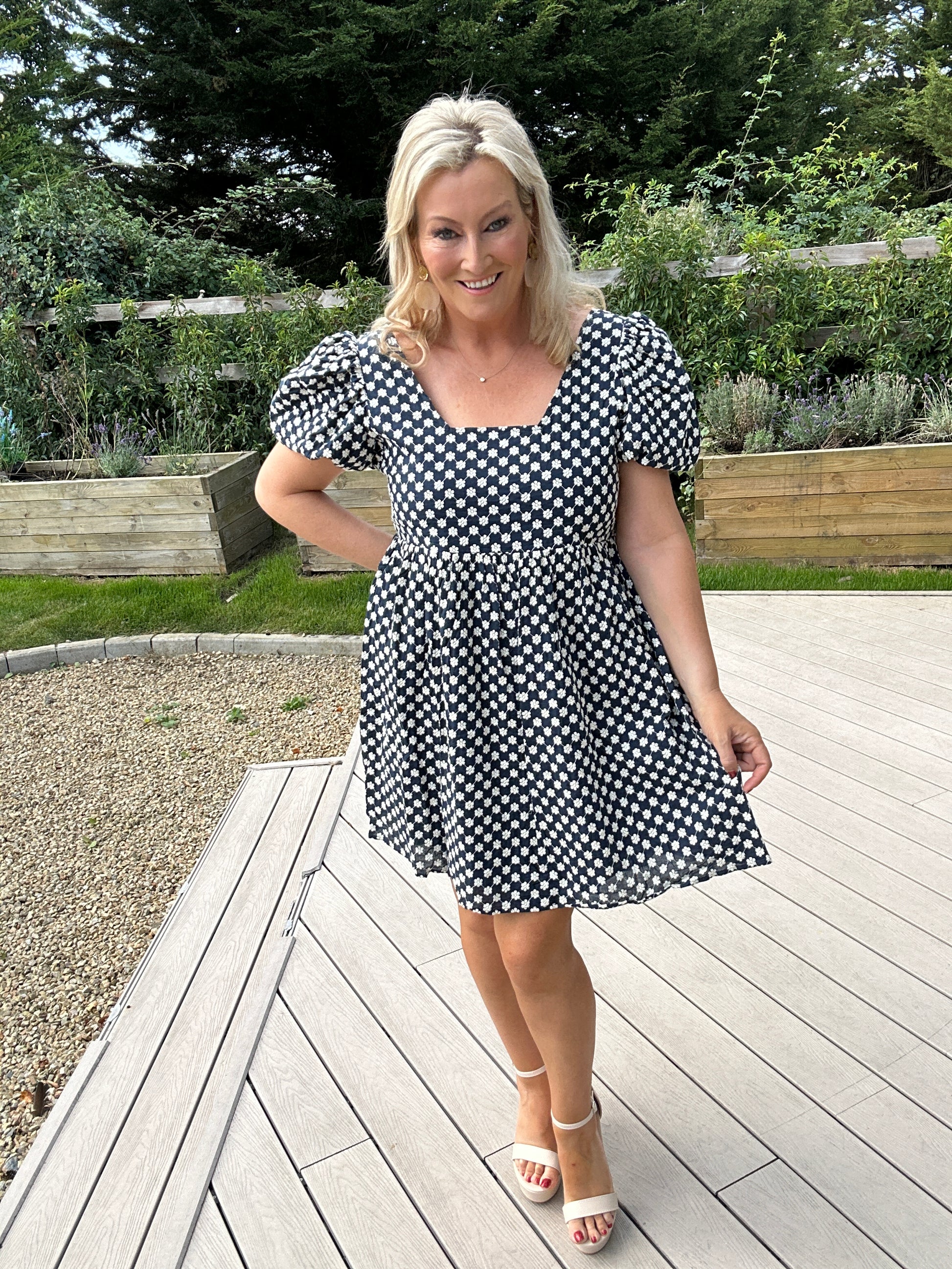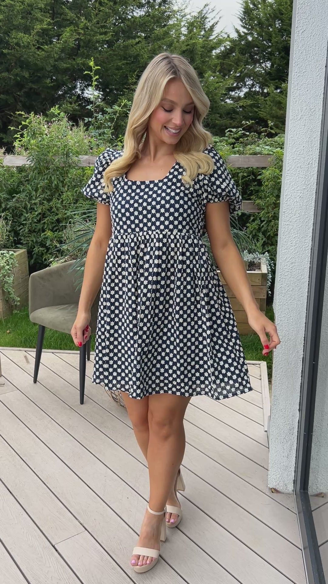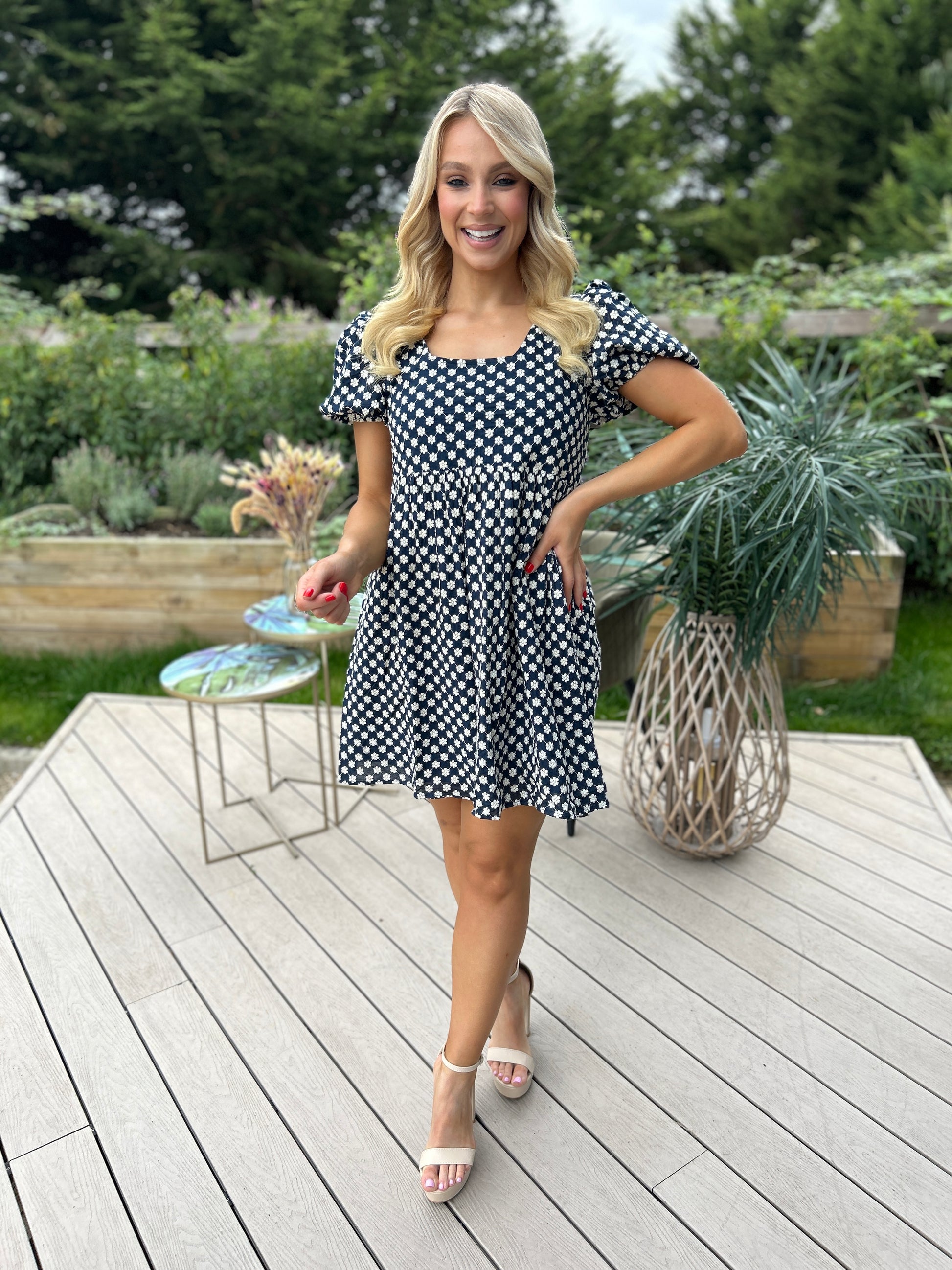 Sweet yet sophisticated, the Paige Dress is all about charming details. Crafted from a beautifully heavy embroidered fabric, it features a chic bow-tie back with a subtle cut-out, giving it a playful twist. Short puff sleeves and a lined finish keep it both elegant and comfortable — the perfect dress for special occasions or daytime chic.