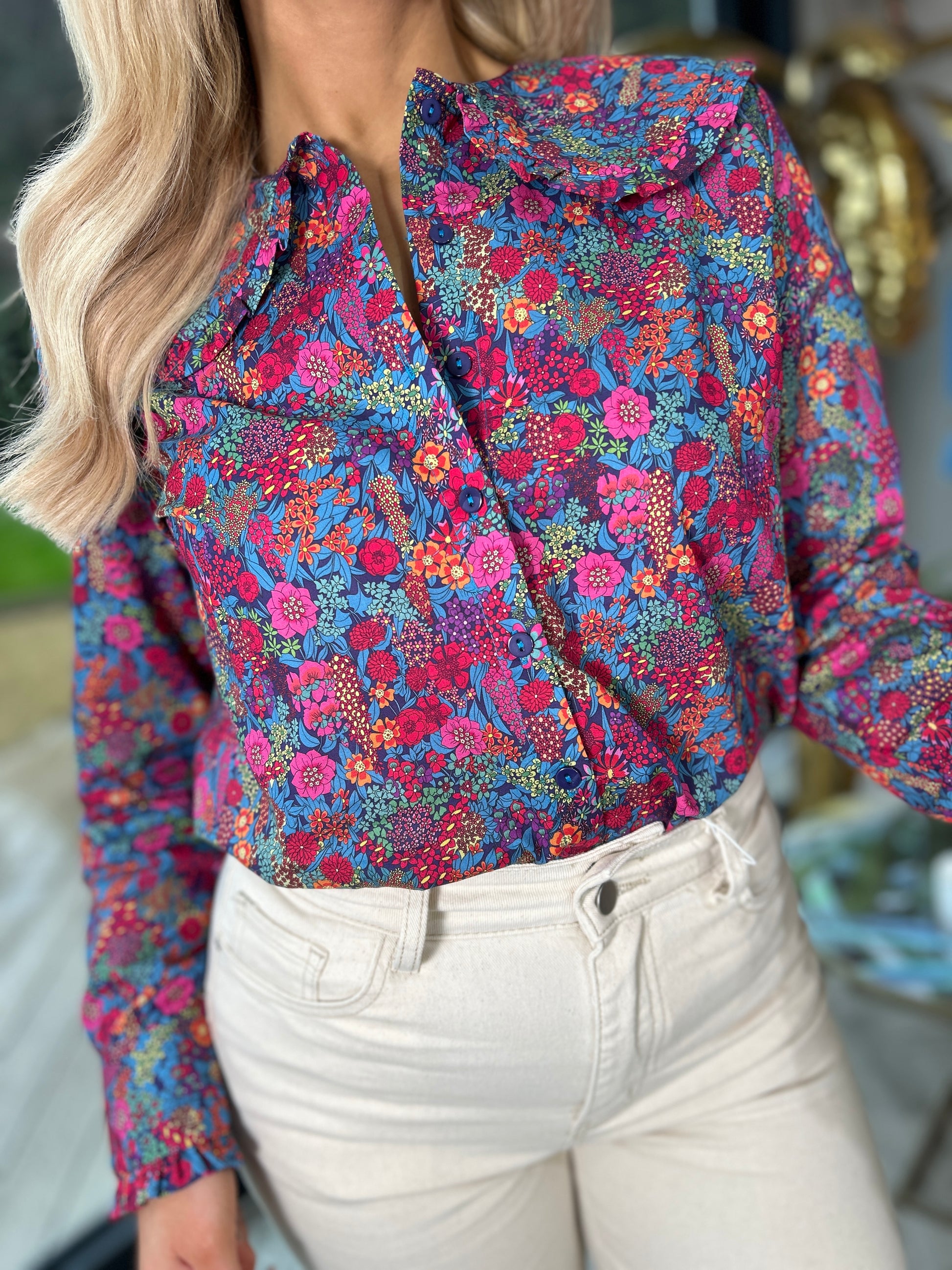 Perfectly pairing with high-waisted jeans and trainers for a relaxed weekend vibe, this blouse also transitions seamlessly into your workwear wardrobe. Tuck it into your favourite trousers or a sleek skirt, slip on some ballet pumps, and you're office-ready with a comfy yet polished look. The PoppyPrint Shirt isn't just a piece of clothing; it's a versatile staple that will refresh your wardrobe with its charming print and timeless design.