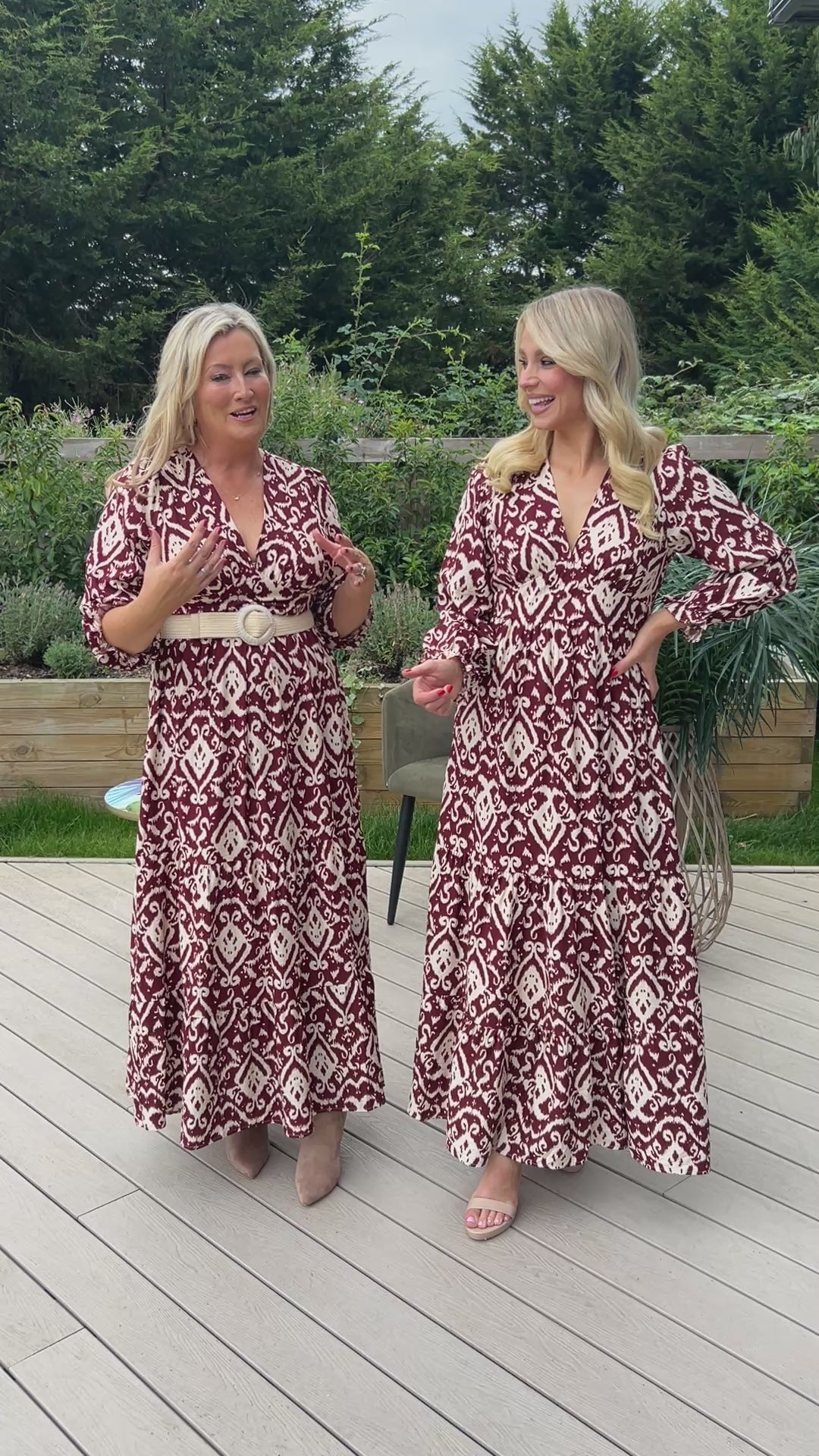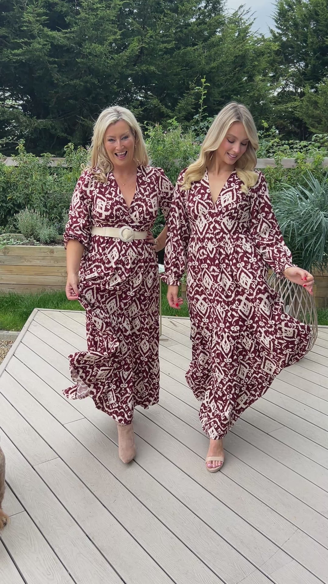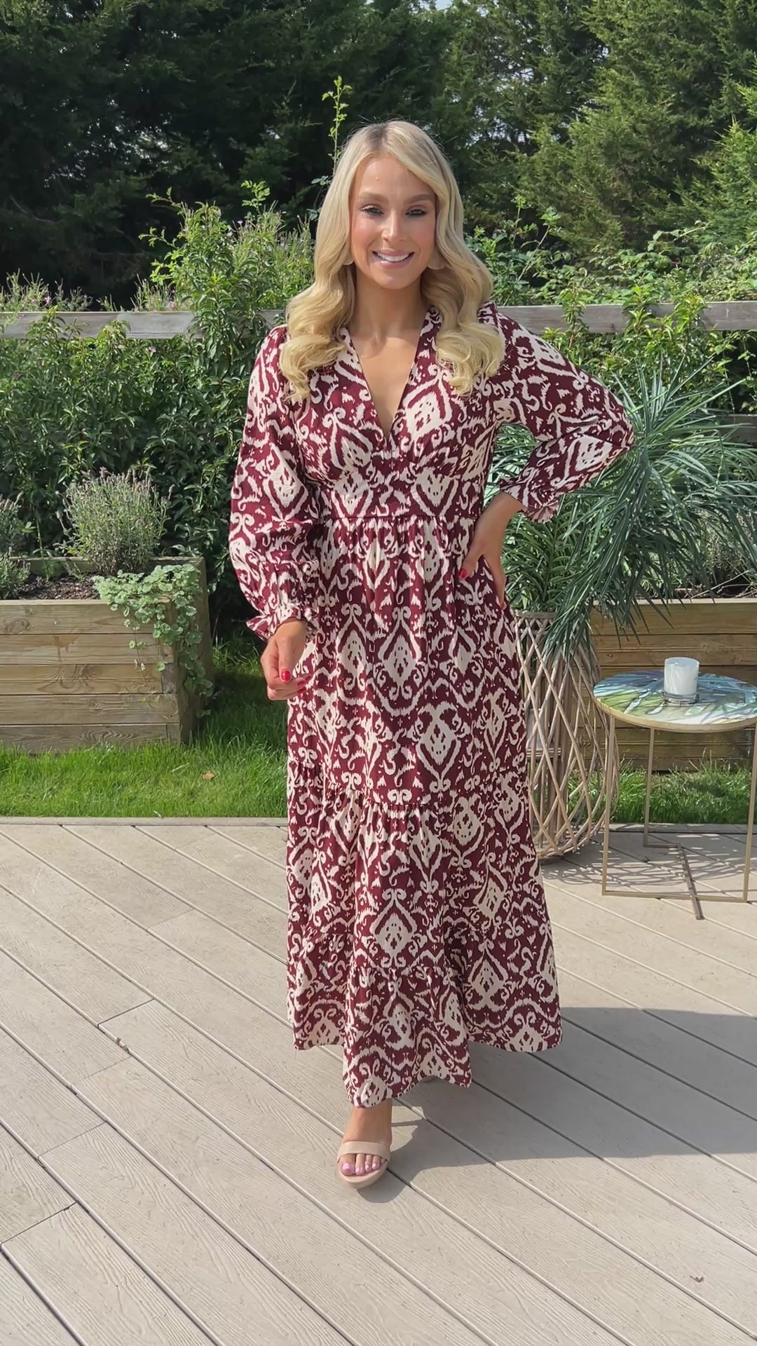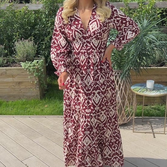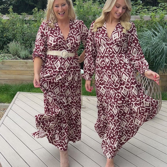 The Sira Dress in Bordeaux is an effortlessly elegant maxi designed for timeless style and all-day comfort. Crafted in a rich wine hue with an eye-catching ivory ikat print, it features a flattering V-neckline, button-through bodice, and softly gathered waist for a graceful, feminine silhouette. The long sleeves and flowing skirt make it perfect for transitional dressing, while the lightweight fabric drapes beautifully with every step.
