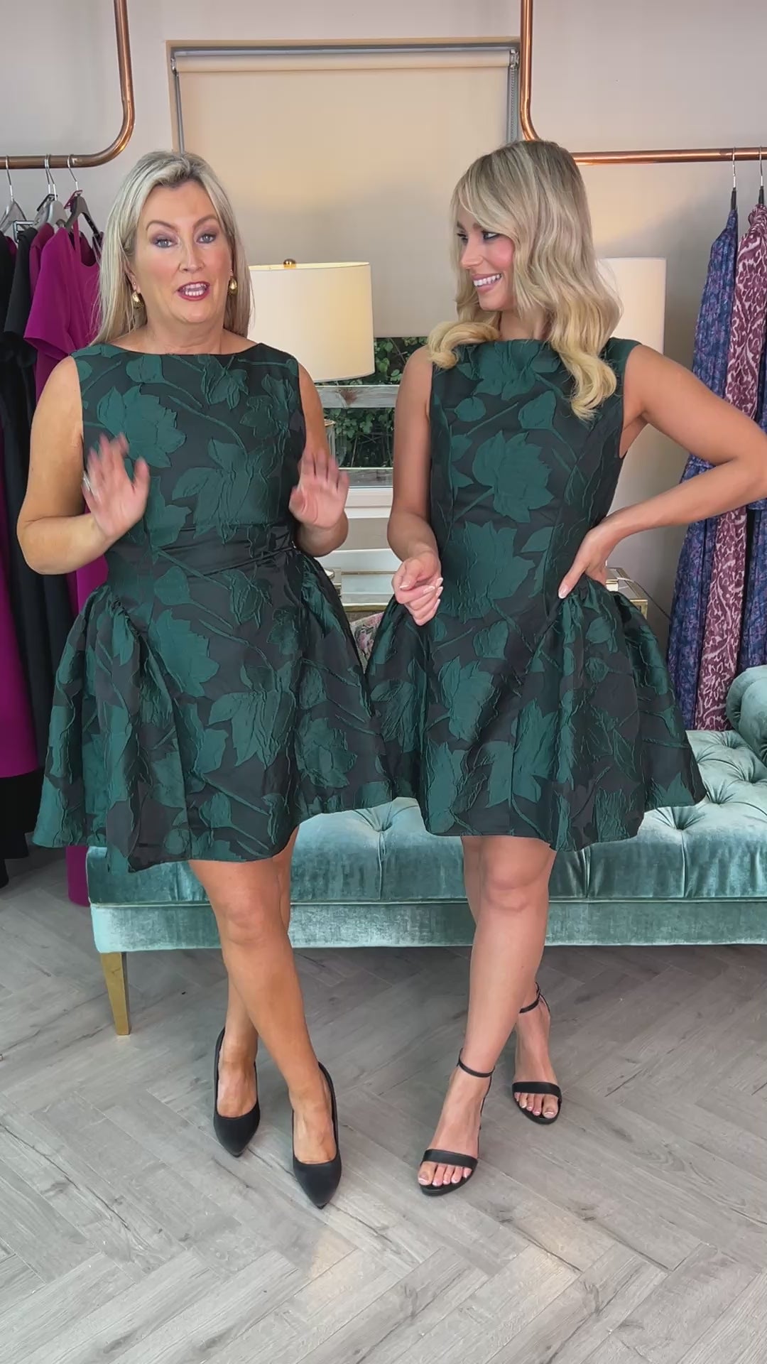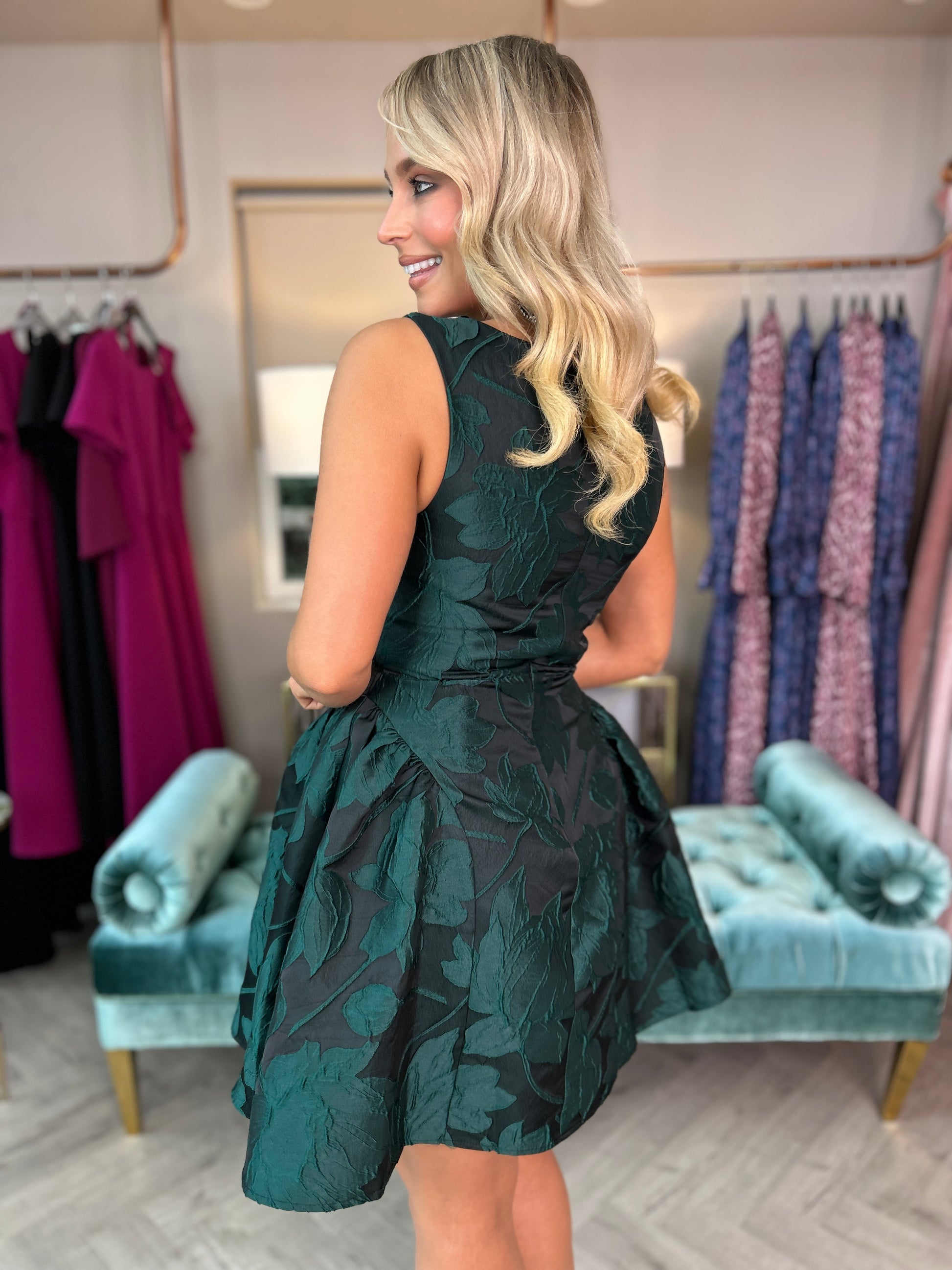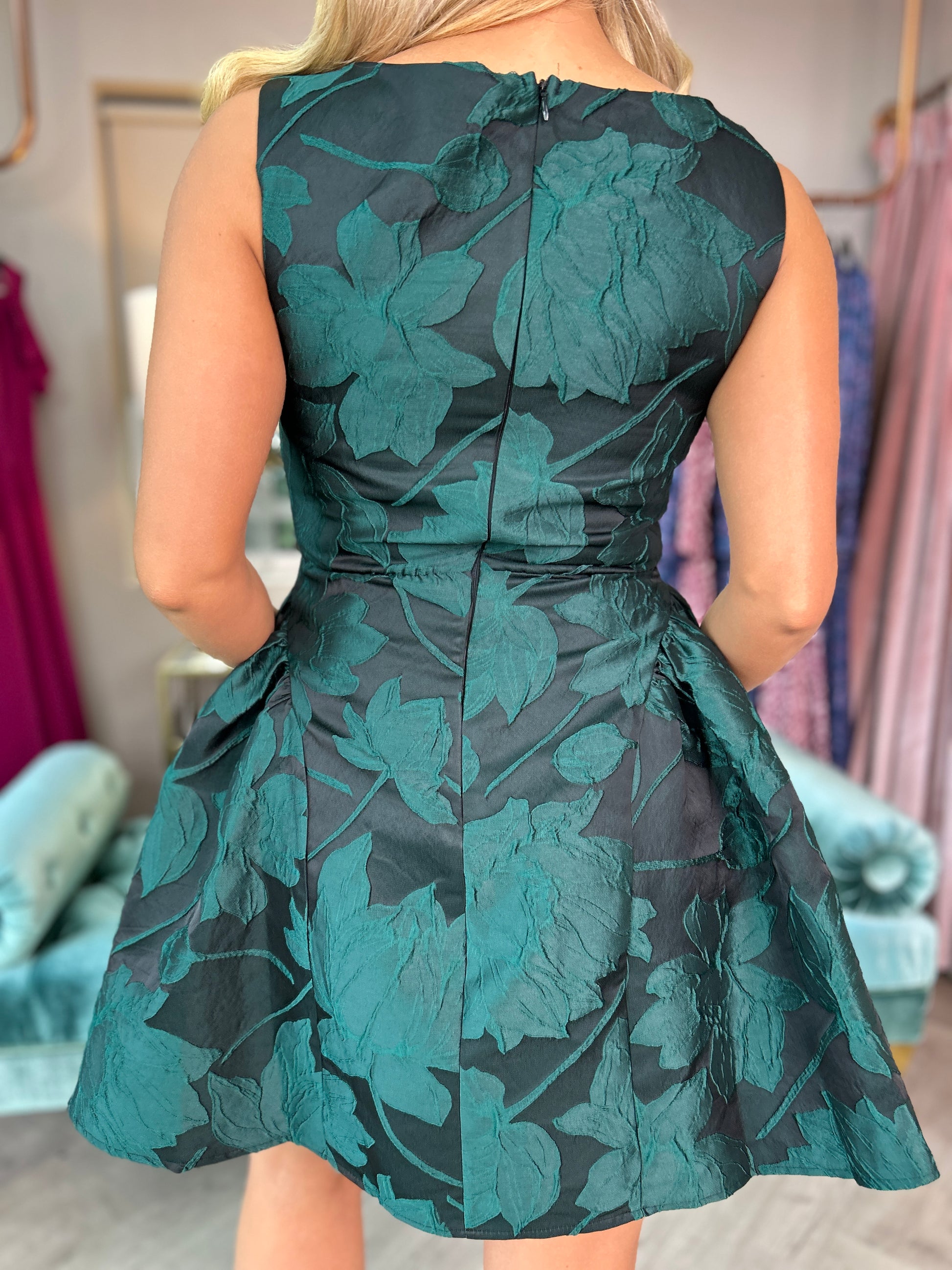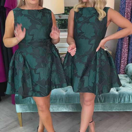 The Suri Jacquard Mini Dress showcases refined elegance with its mini puff skirt and boat neck design, creating a graceful silhouette. Featuring a back zip closure for a neat fit, this dress exudes sophistication for any occasion. For the perfect fit, consider sizing up if you are between sizes.