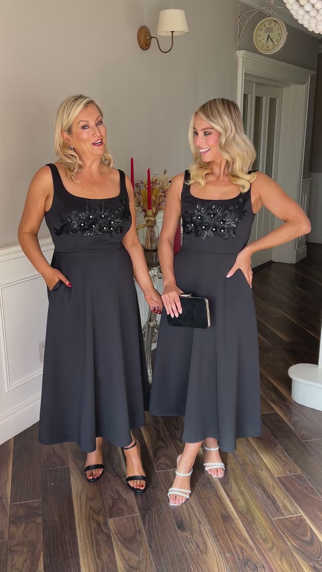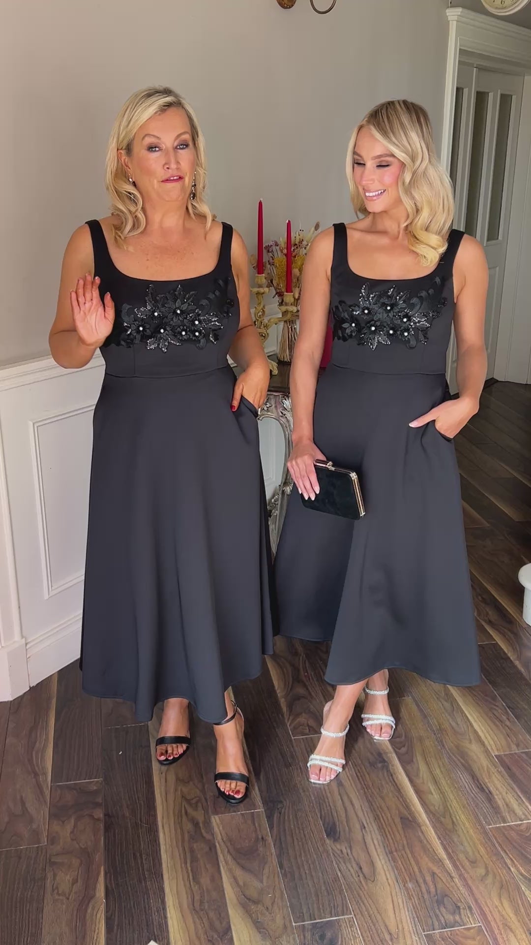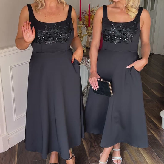 The Syrena Midi Dress features a soft scoop neckline complemented by elegant applique detailing on the bust, creating a refined silhouette. Its flattering A-line shape enhances movement while discreet pockets add practical sophistication. Perfect for occasions where timeless style meets effortless grace.