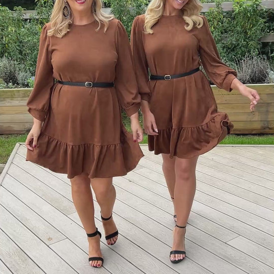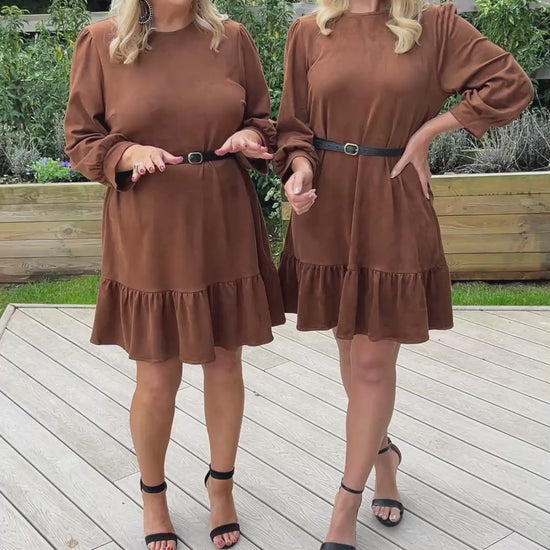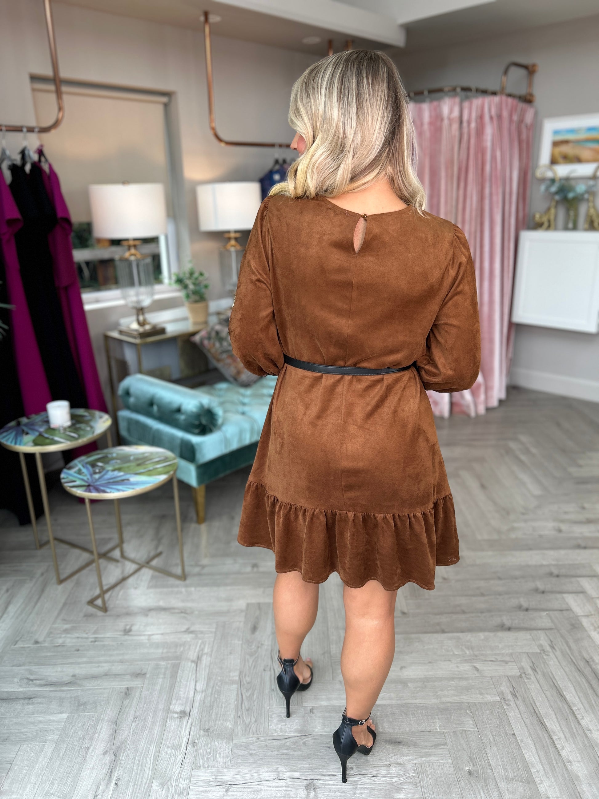 Tan Faux Suede Frill Hem Belted Mini Dress