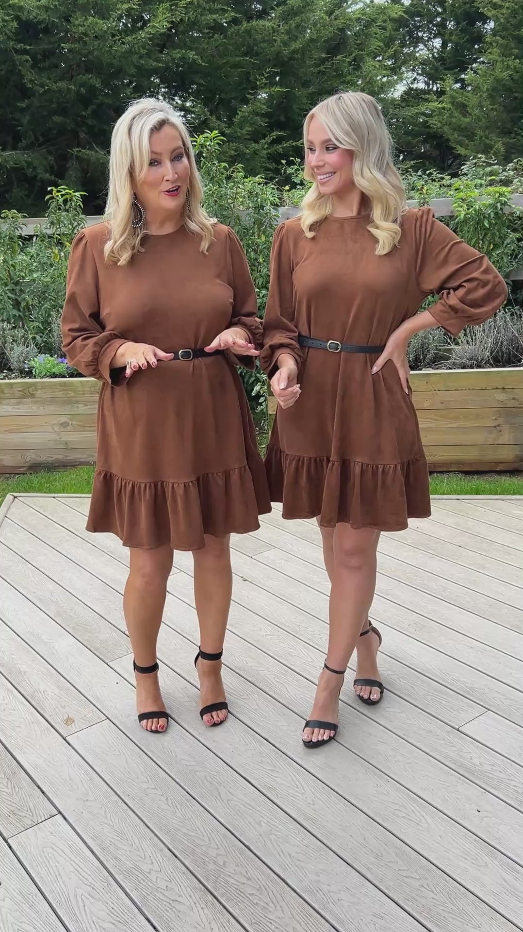 Chic, versatile, and oh-so-soft – our Tan Faux Suede Belted Mini Dress is a must-have for your day-to-night wardrobe. Crafted from butter-soft faux suede fabric, it features 3/4 length sleeves, a classic round neckline, back loop closure, and a playful frill hem skirt. The look is cinched with a sleek black faux leather belt, creating a flattering silhouette that transitions effortlessly from casual to dressy.