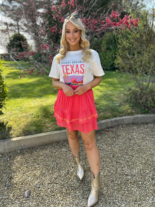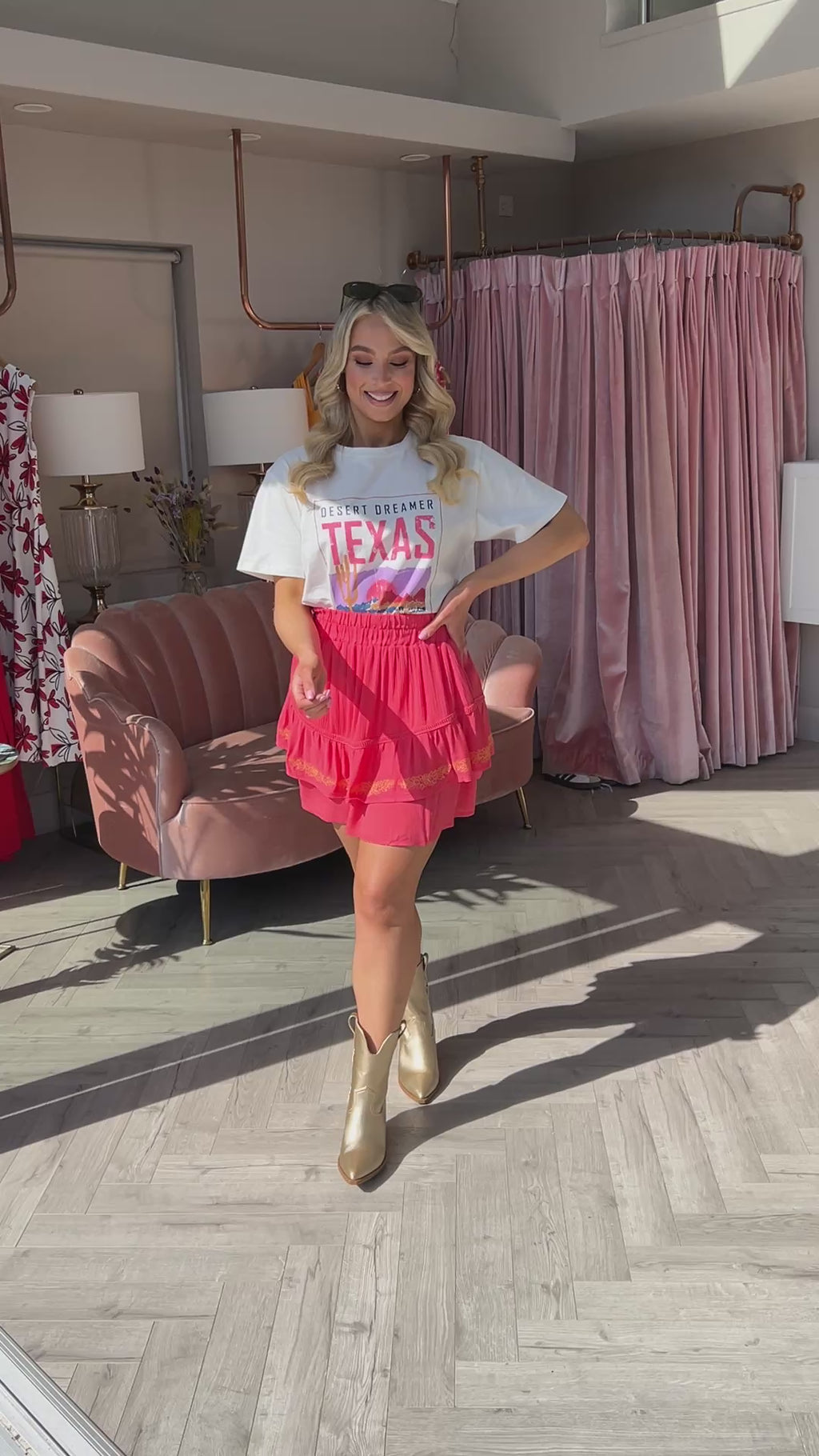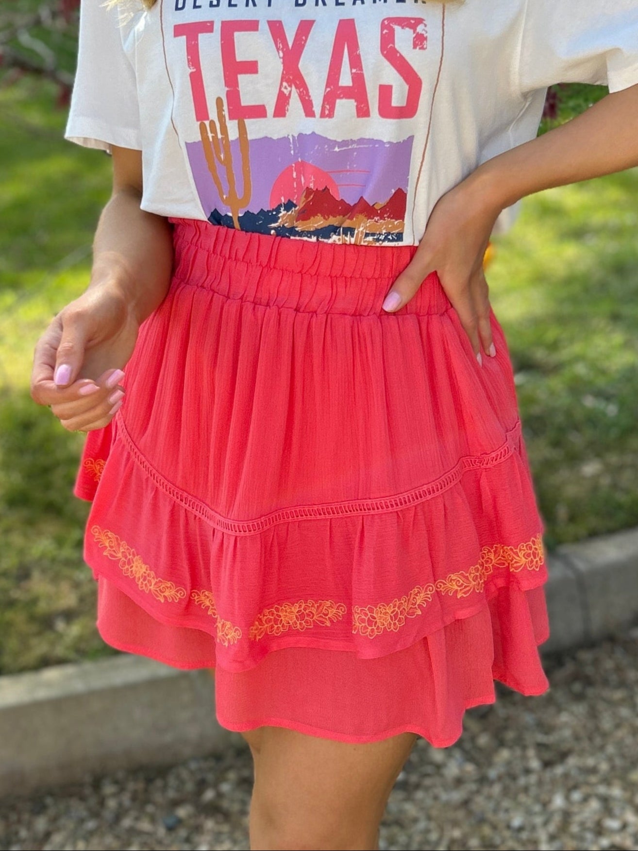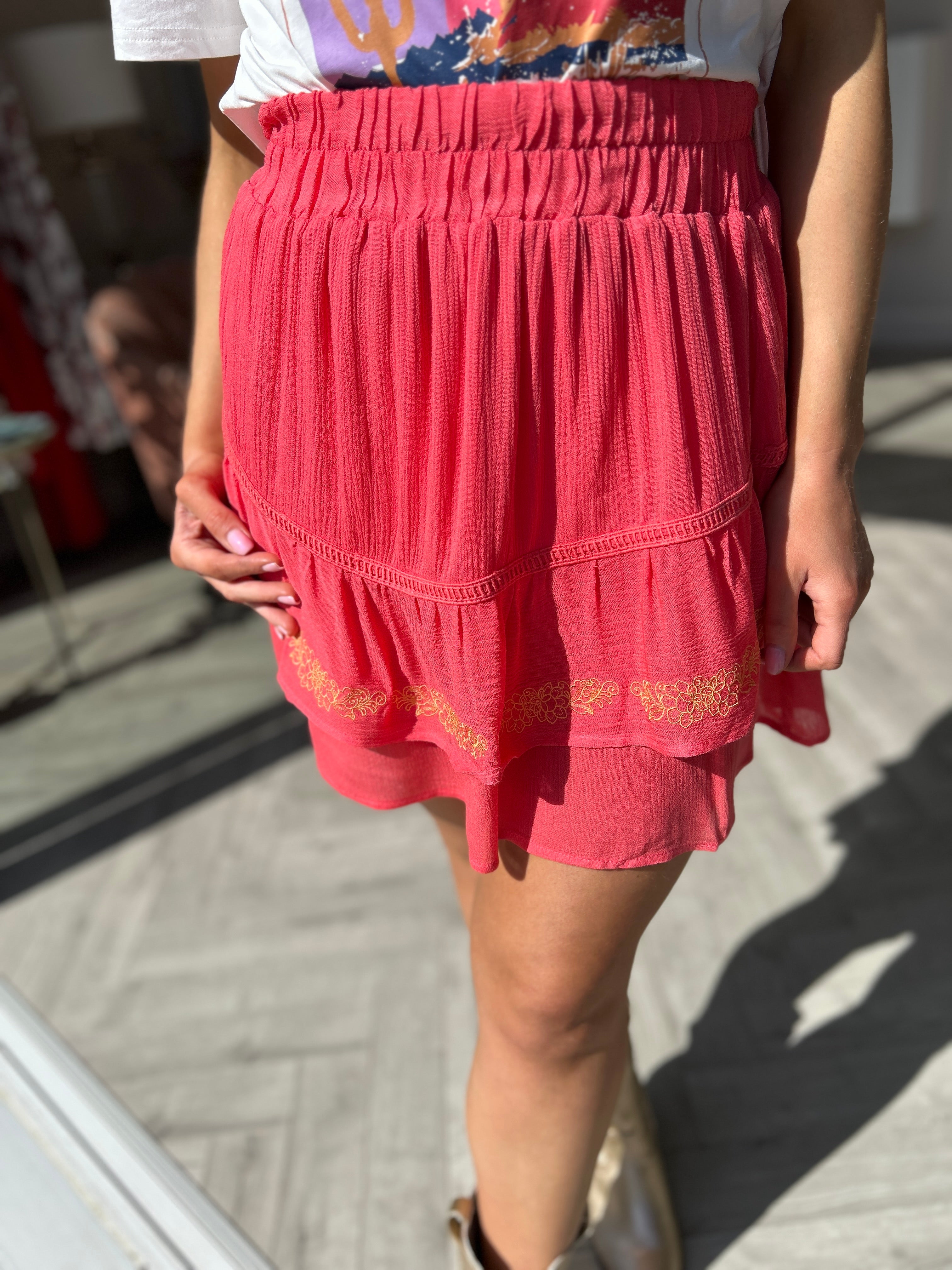 Embrace carefree summer vibes with the Willa Skirt in a radiant sunkissed coral hue. Crafted from lightweight embroidered border print, this tiered mini skirt brings playful movement and effortless charm to your warm-weather wardrobe. The elasticated waist and soft lining ensure comfort all day long—perfect for everything from beach strolls to music festivals. ☀️🌸