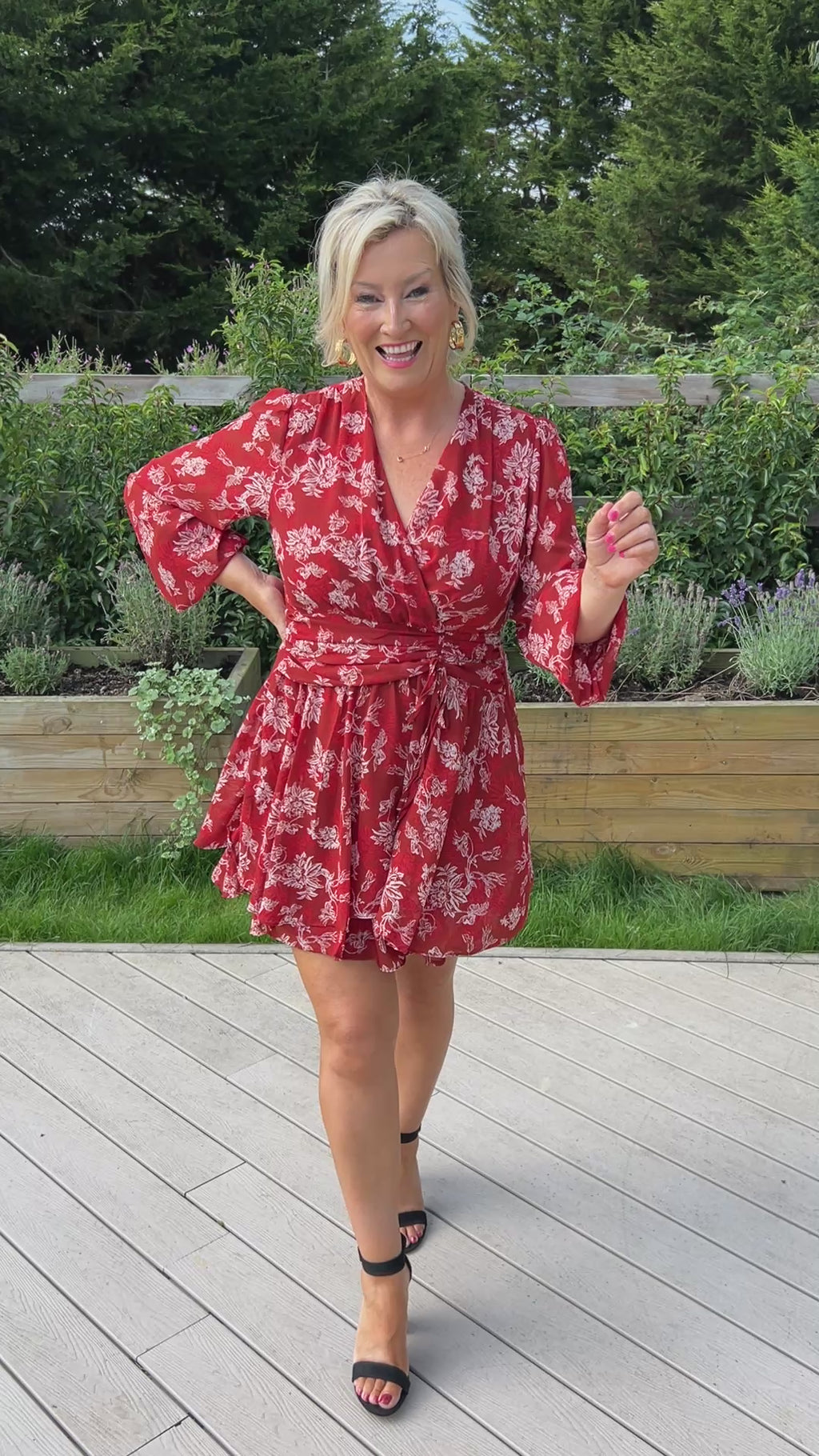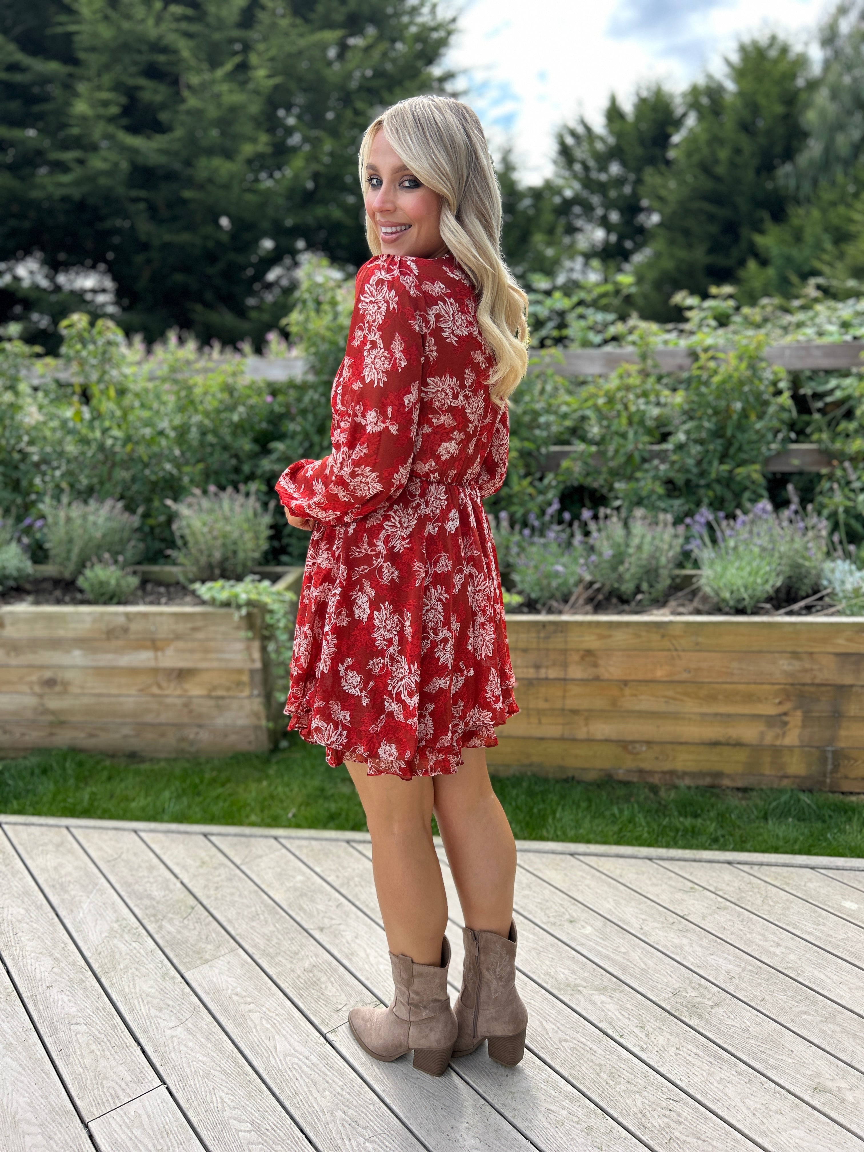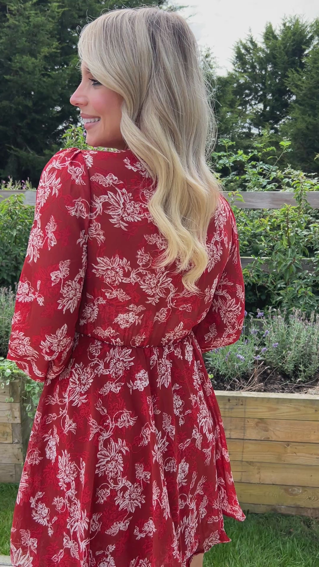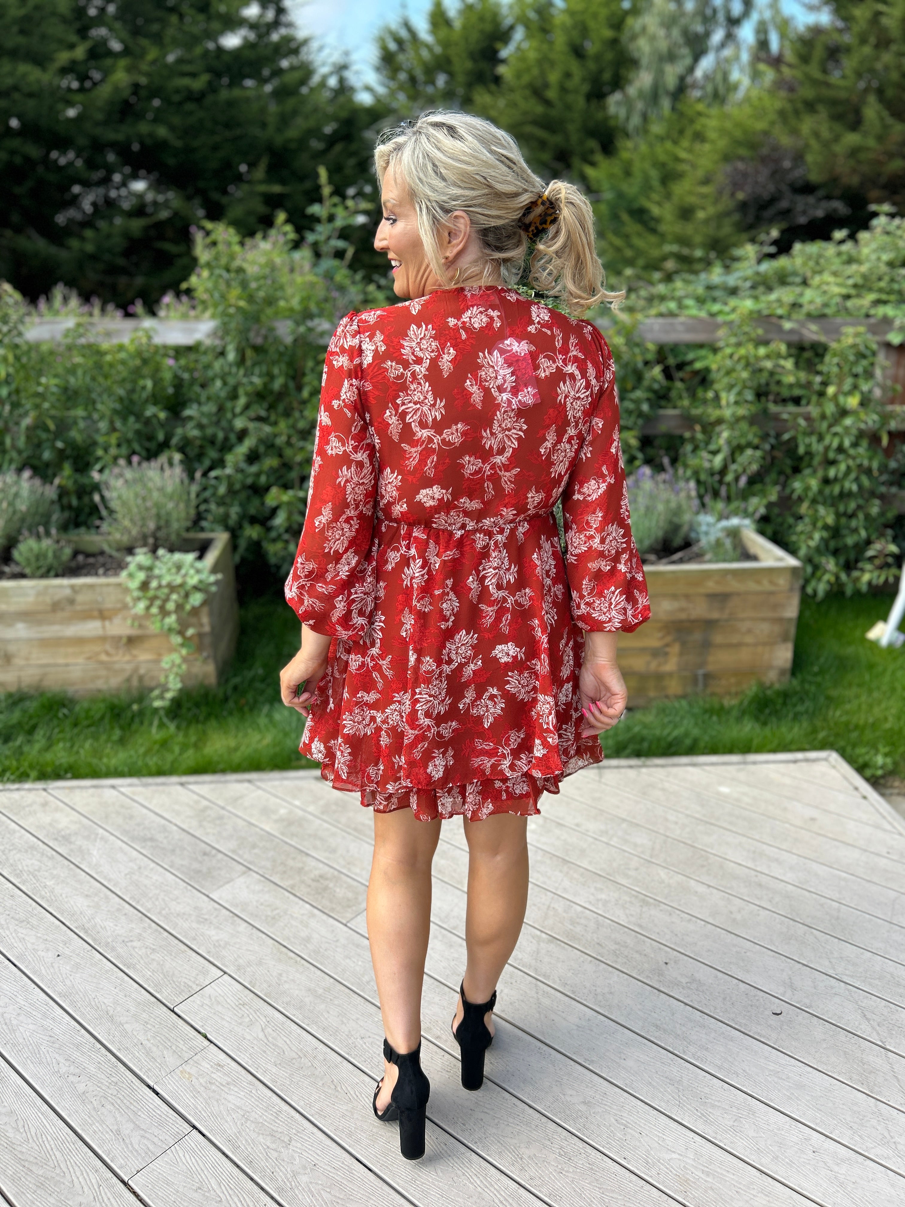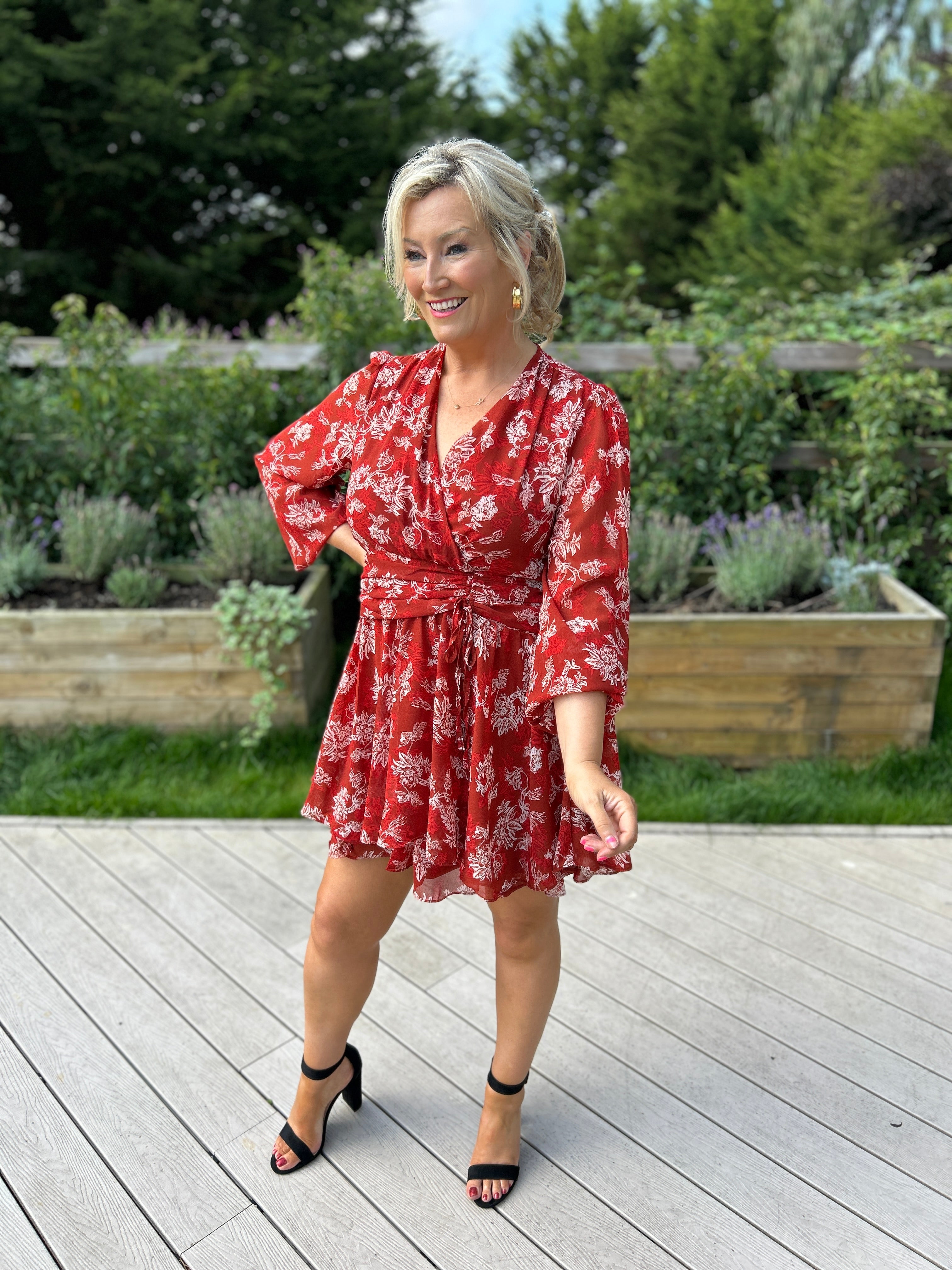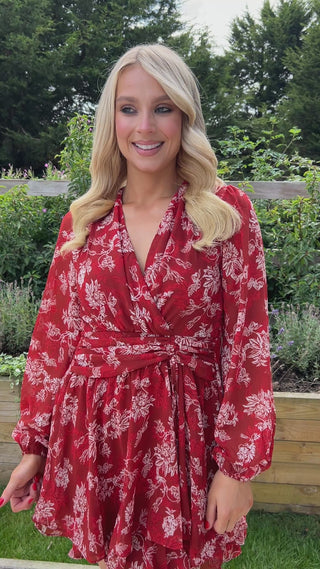 Meet your new wardrobe favourite – the Roxi Dress is a head-turning wrap-style mini that combines elegance with playful charm. With its flowing silhouette, tie waist, and delicate floral print on a rich red background, this dress flatters in all the right places.