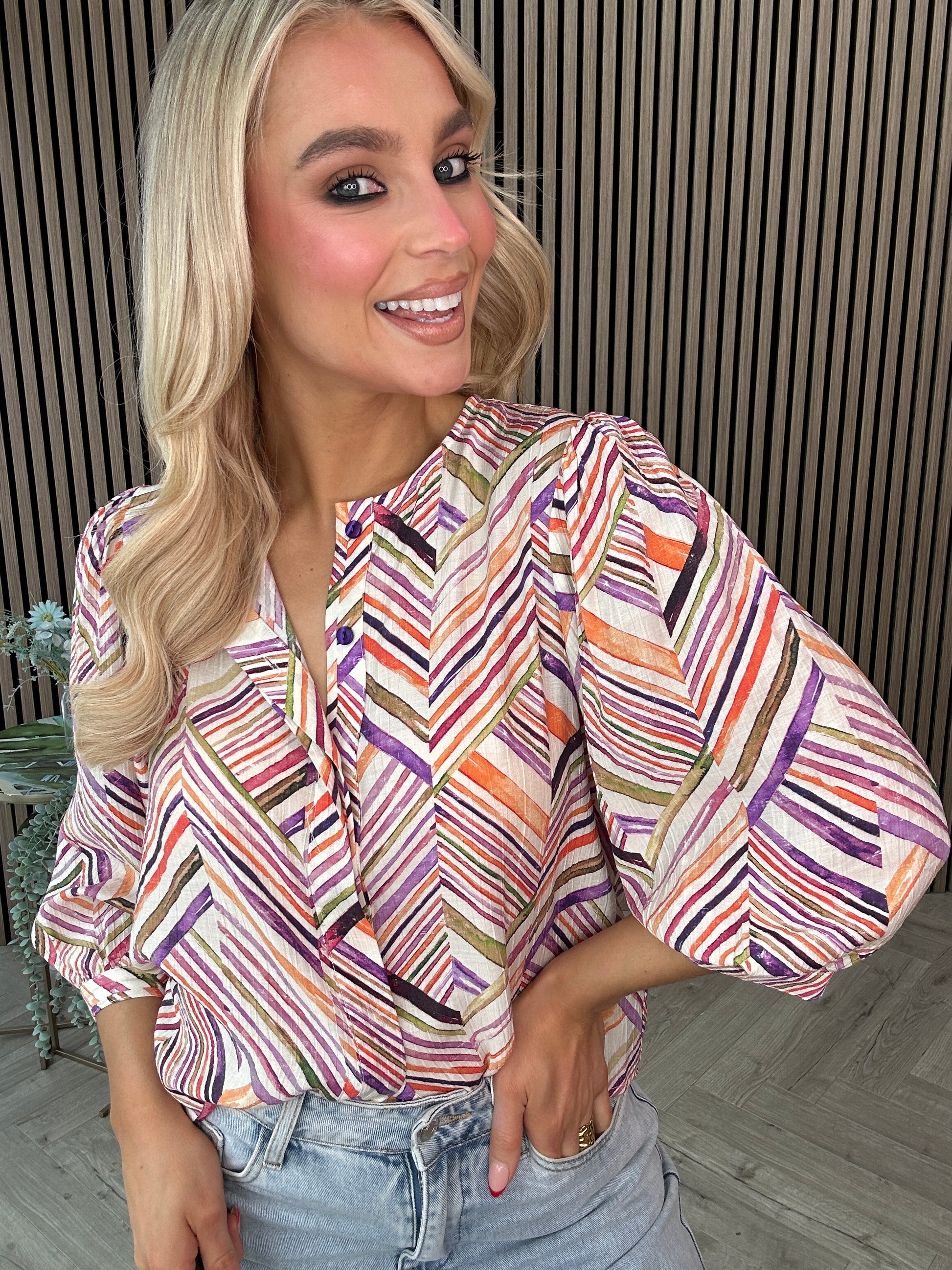 Chic, modern, and effortlessly stylish, the Alexis Blouse is a standout piece that brings a fresh edge to your everyday wardrobe. Featuring an eye-catching geometric print in soft purple tones, this blouse offers the perfect blend of sophistication and versatility.