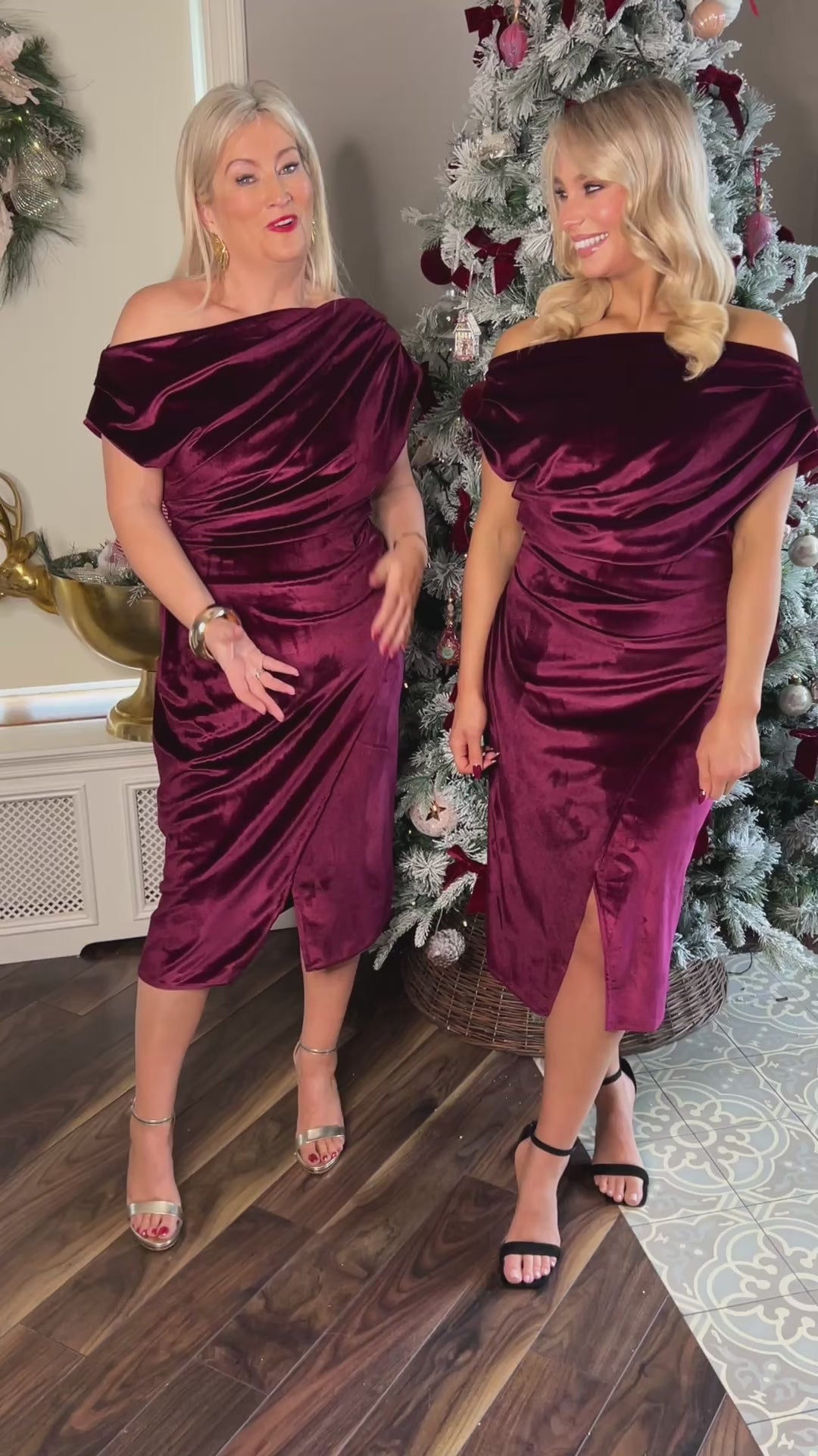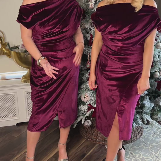 Introducing the Ariana Wine Velvet Dress, a true epitome of elegance and style priced at €65.00. Designed with a keen eye for detail, this dress features strategic rouching around the tummy area, ensuring a flattering silhouette for any body type. The soft, luxurious velvet fabric not only feels incredible on the skin but also falls and flatters in all the right places. Its luminous quality under the light and the rich, winter berry shade make this dress a standout choice for any festive occasion or wedding.