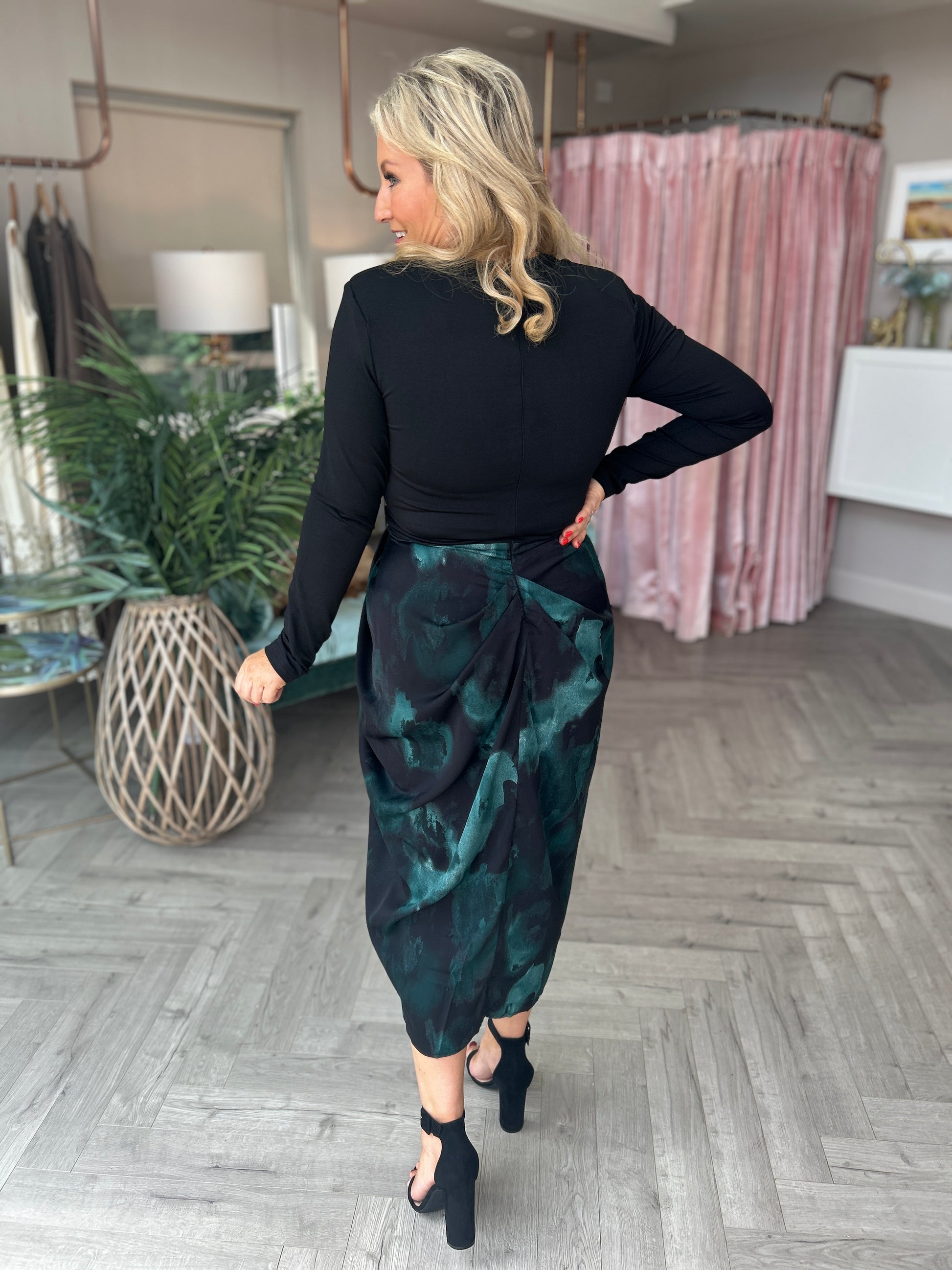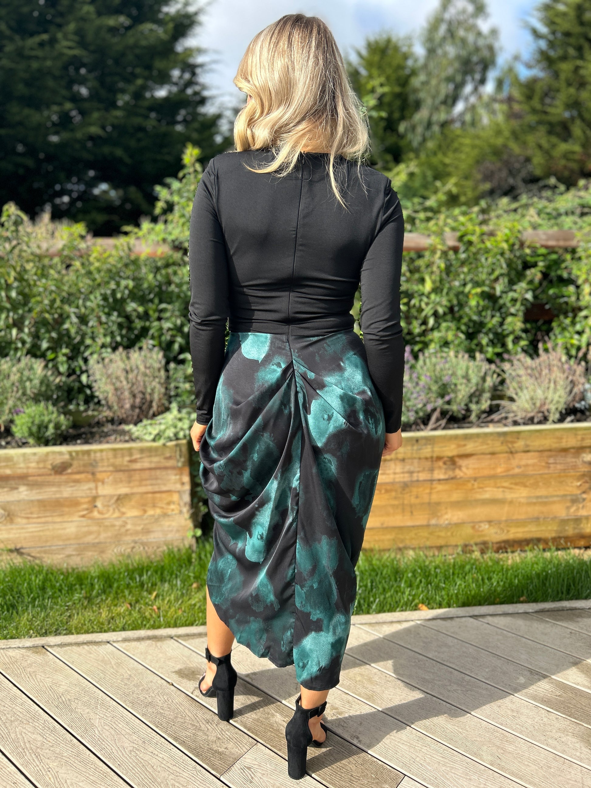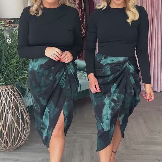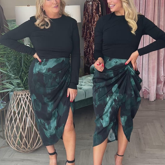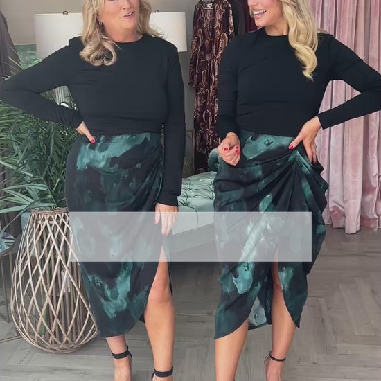 The Asha Dress combines elegance and versatility with its teal and black smudge print gathered midi skirt seamlessly paired with a sleek black stretch jersey top. Designed with padded shoulders and a zip-up back, it offers a structured yet comfortable fit. Perfect for transitioning effortlessly from professional settings to evening events, this dress pairs beautifully with heels and a matching bag to elevate your style.