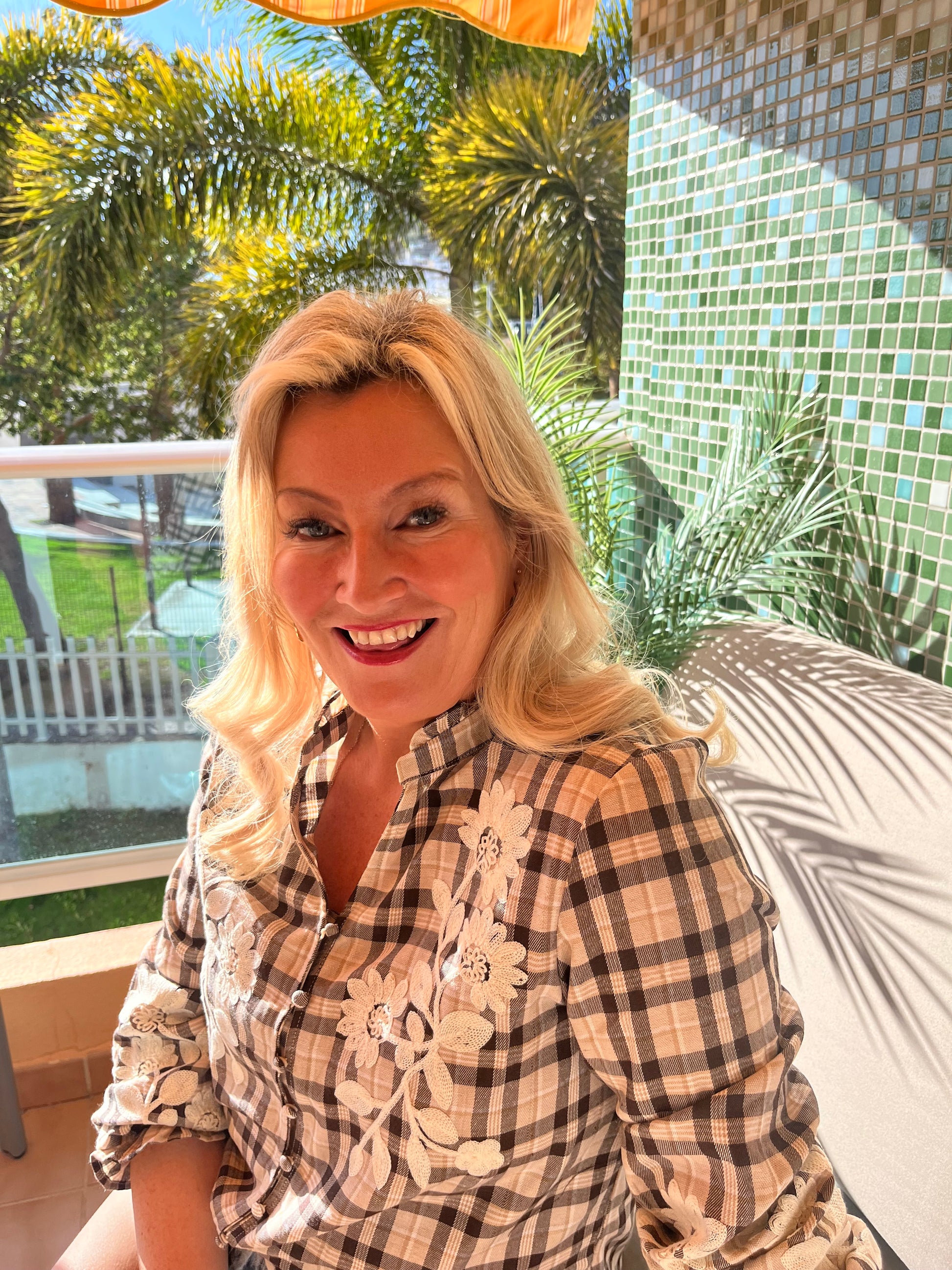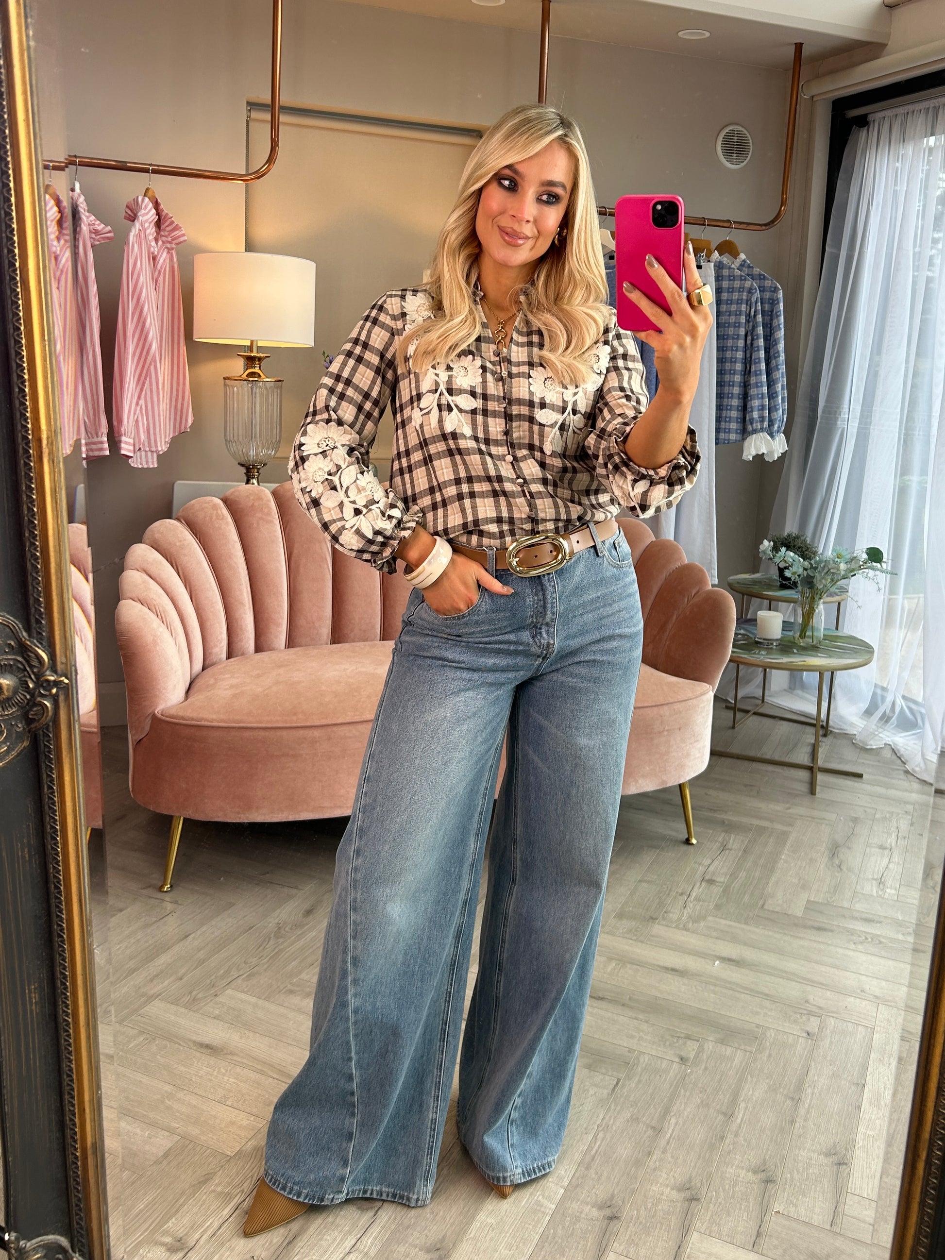 Introducing the new Carey Shirt. This gorgeous spring check print has warm neutral tones & the contrast embroidery stitching adds an exquisite detail.