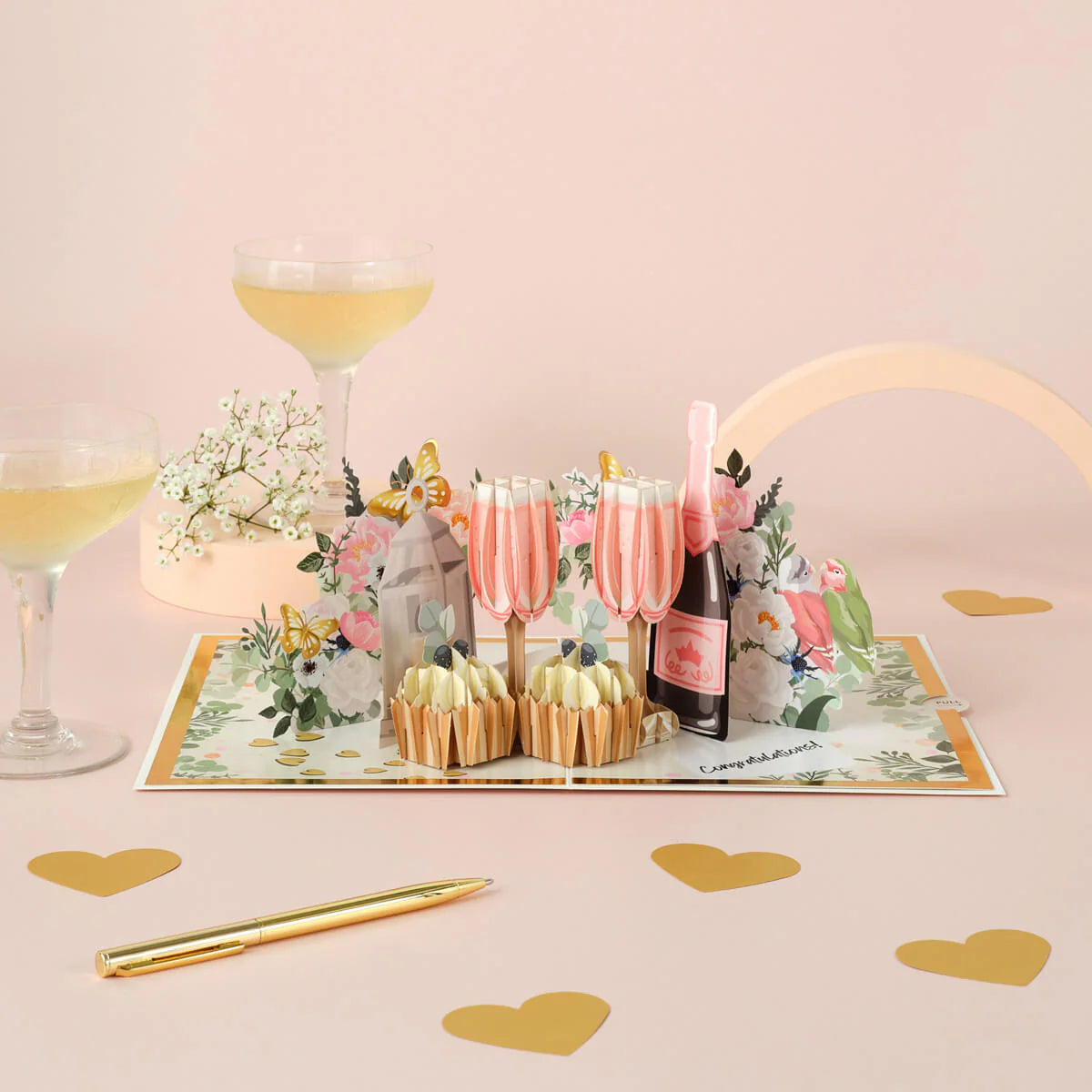 Make every special occasion unforgettable with this beautifully designed 3D pop-up card, perfect for celebrating love and joyous milestones. Featuring an elegant scene with delicate floral accents, champagne glasses, a bottle of bubbly, and delectable desserts, this intricately crafted card pops open to create a stunning display that brings celebrations to life.