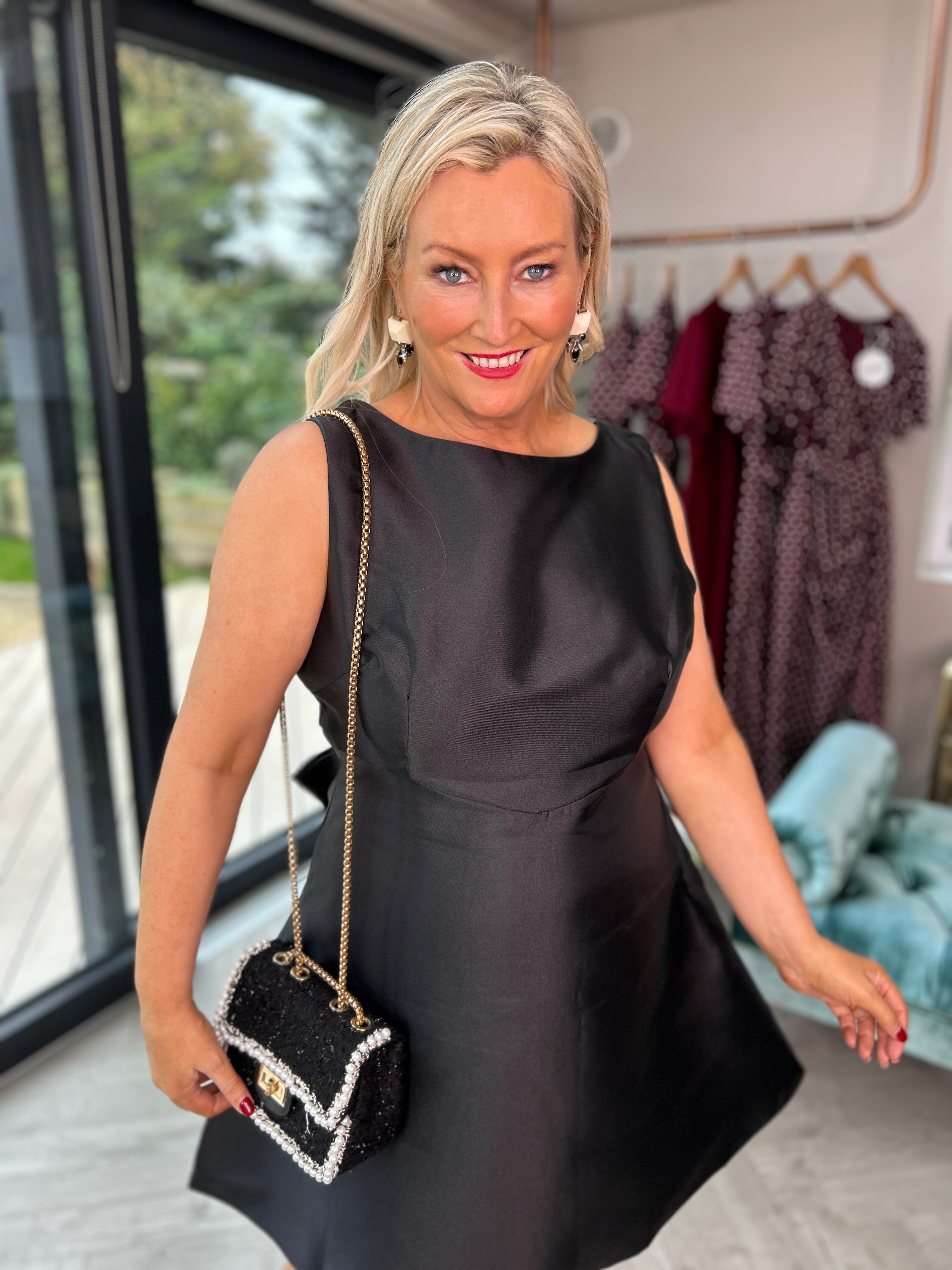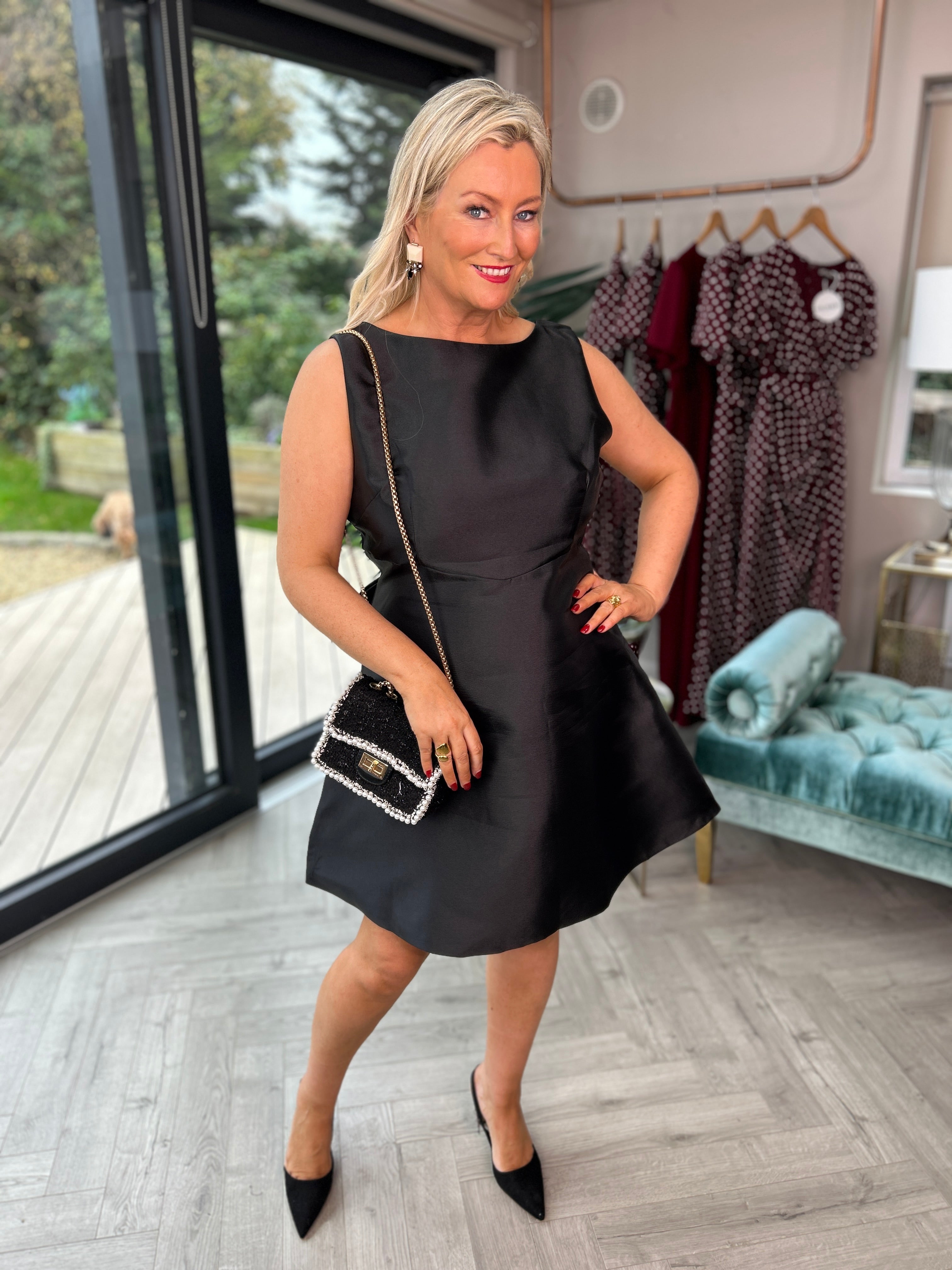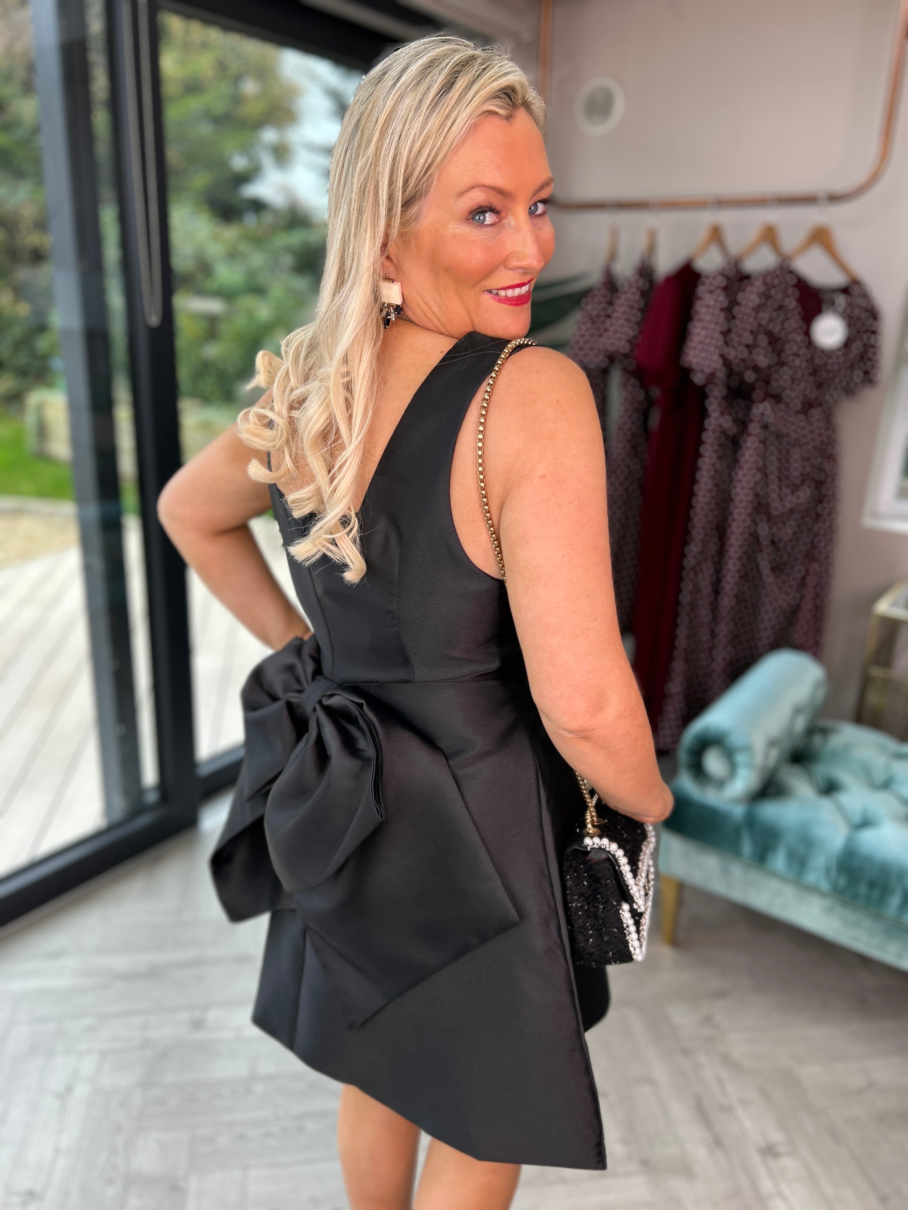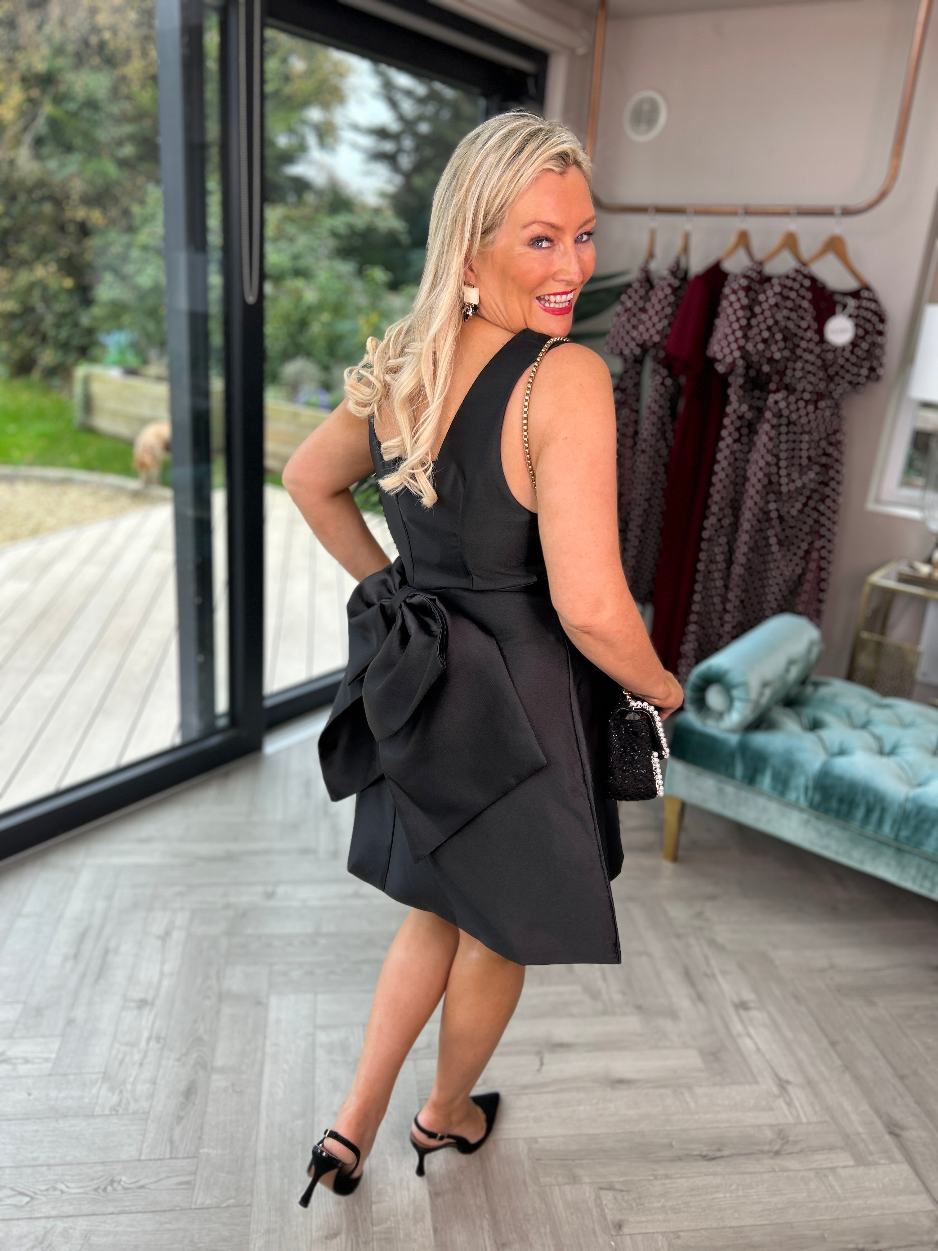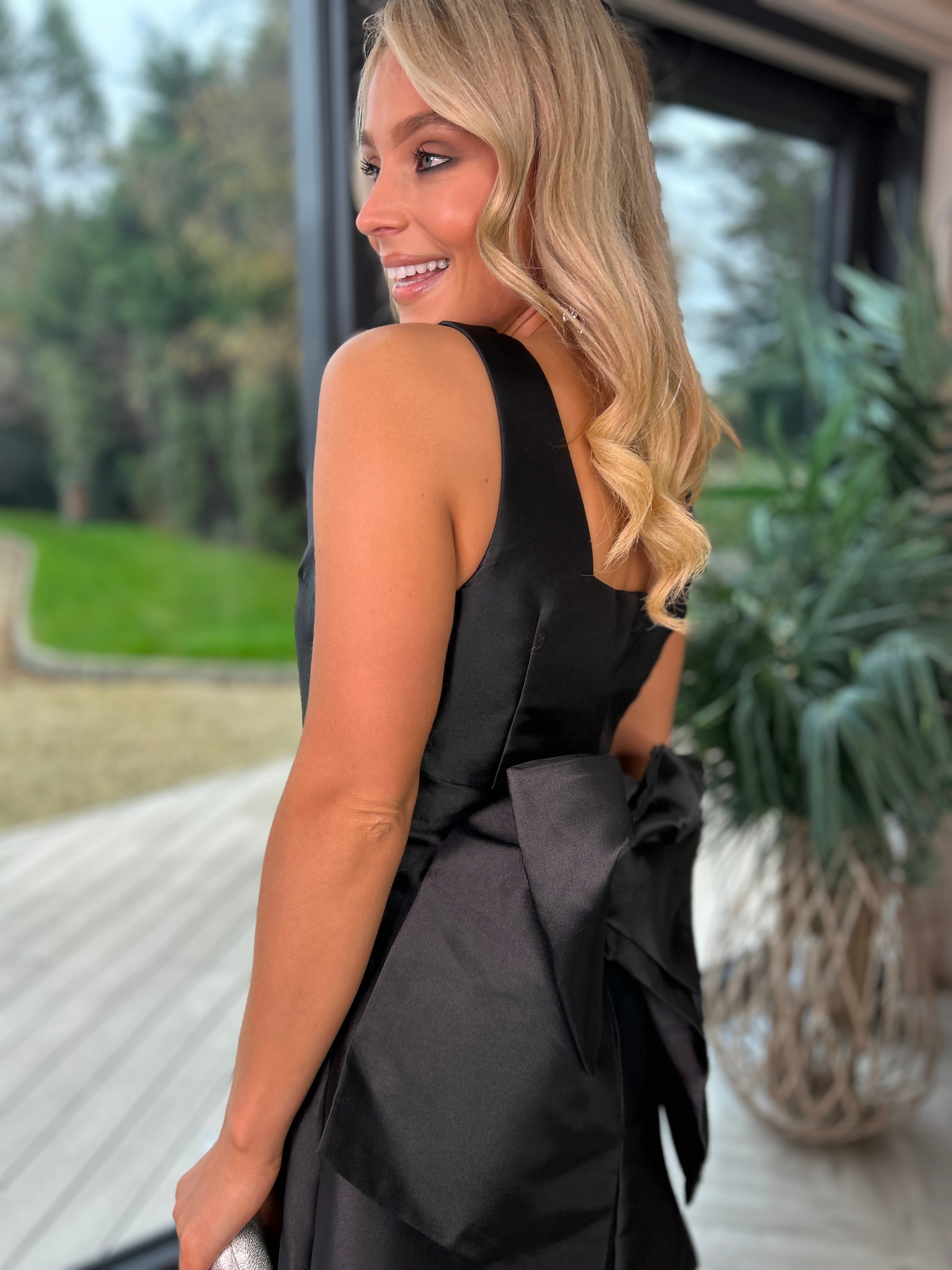 Elegant, feminine, and strikingly sophisticated — the Feyre Dress is a true showstopper. Crafted from lustrous fabric with a beautiful sheen, this structured mini dress features a flattering fit-and-flare silhouette and a statement oversized bow detail at the back for a touch of modern drama.