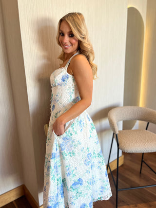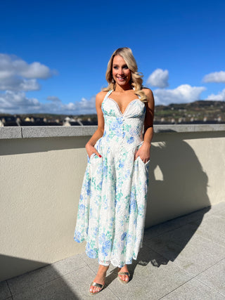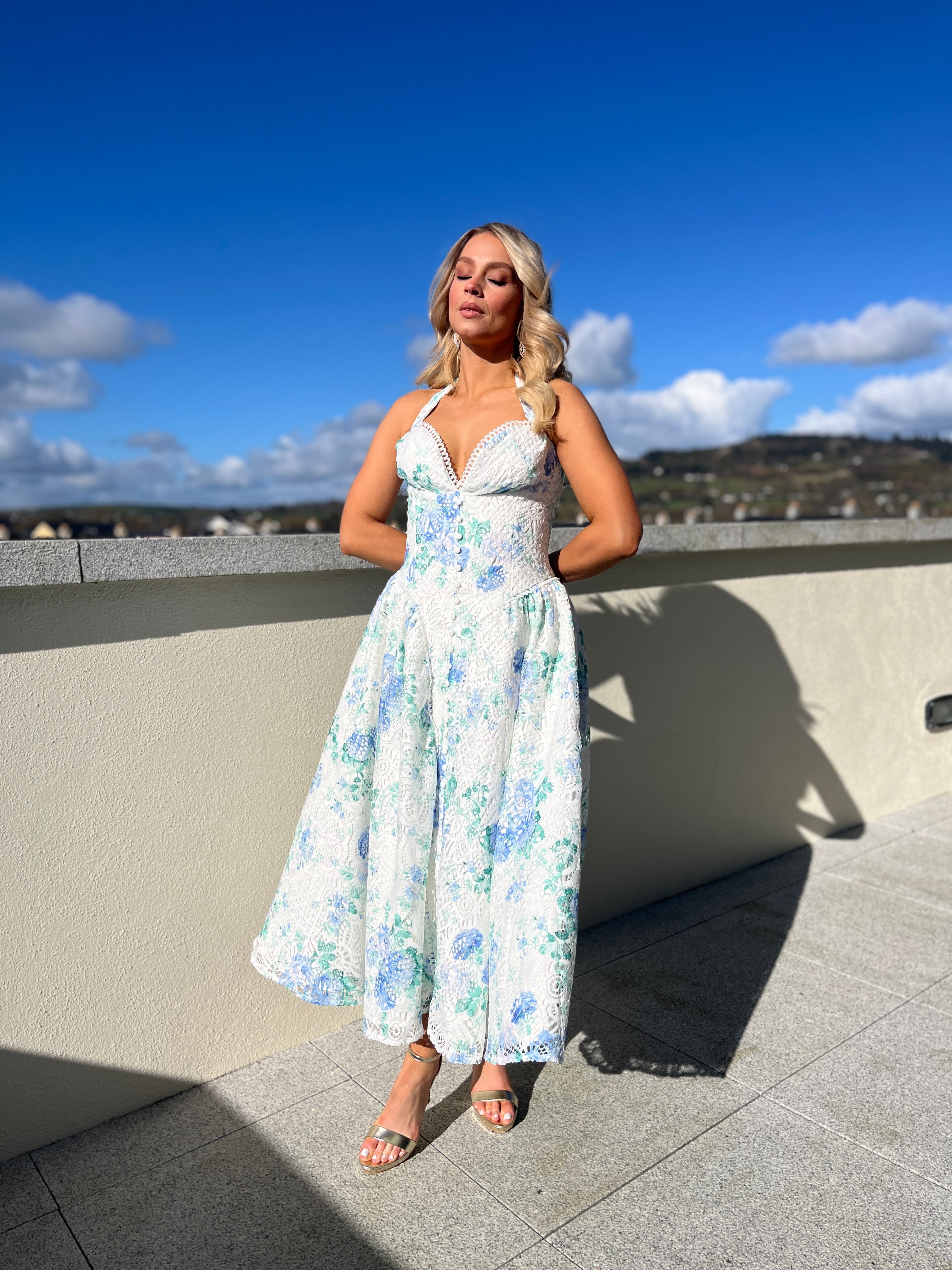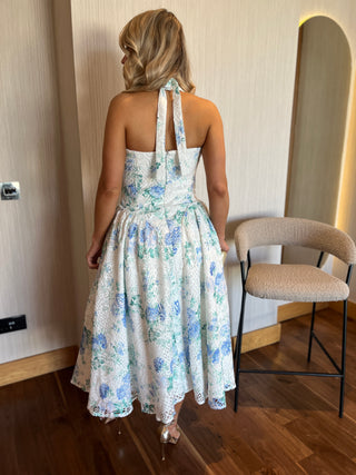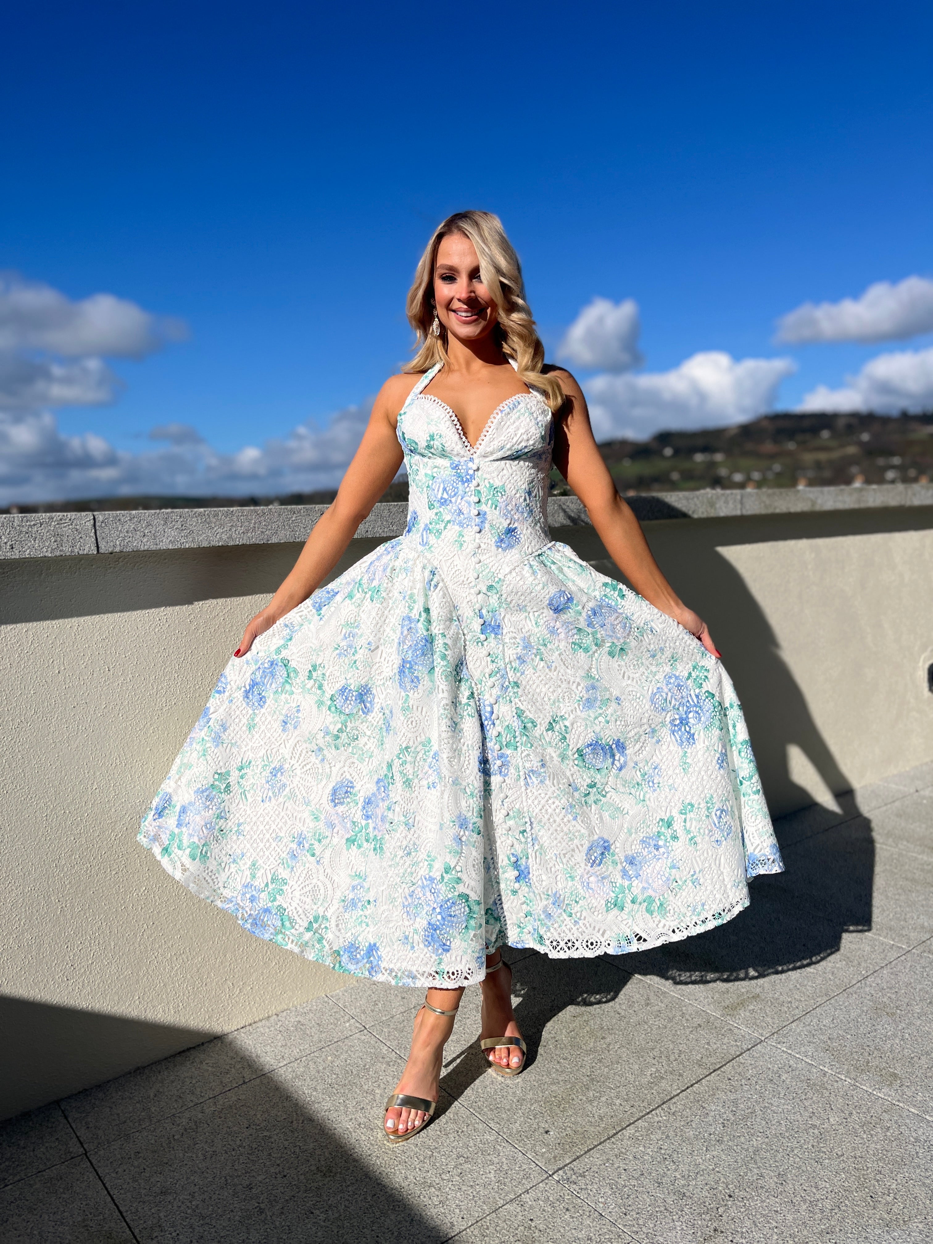 Defined by luxurious textures and bold design, the HAYLEY Micro Button and Loop Detail Volume Flared Midi Dress is a show-stopping choice for those who love to stand out. Crafted from premium floral broderie fabric, this elegant piece flows gracefully into a voluminous flared skirt, creating a striking silhouette. The halter neck design and sweetheart neckline enhance the look with a touch of feminine charm. Perfect for spring parties, weddings, or any special occasion, let this stunning dress take centre stage by pairing it with minimalist accessories and sleek stilettos for a truly captivating ensemble.