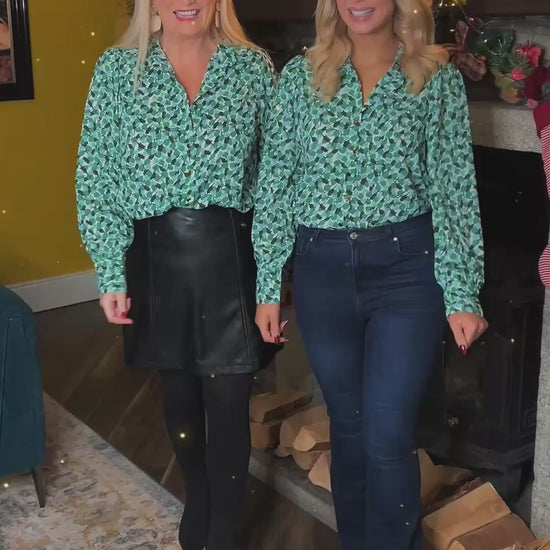 Introducing the Jasleen Blouse in Green. This blouse captures the essence of the festive spirit with its holly-like green leaf pattern. The fresh, vibrant blend of forrest and moss green hues is perfectly complemented by gold buttons, adding a touch of luxury and sophistication to your look. Its quality ensures comfort and durability, making it a piece you'll reach for time and again.