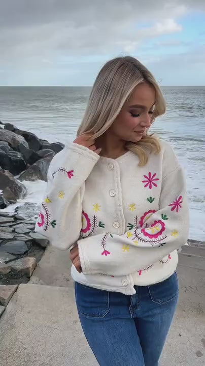 Style it buttoned up with your favorite pair of jeans and trainers for a casual yet chic look, or layer it over a basic top to add a sophisticated layer of warmth and style. We think you will love the Karri Embroidered Cardi for its unique blend of effortless chic and playful elegance, making it a perfect choice for those looking to bring a hint of springtime into their everyday style.