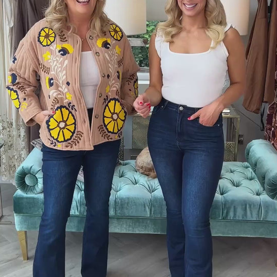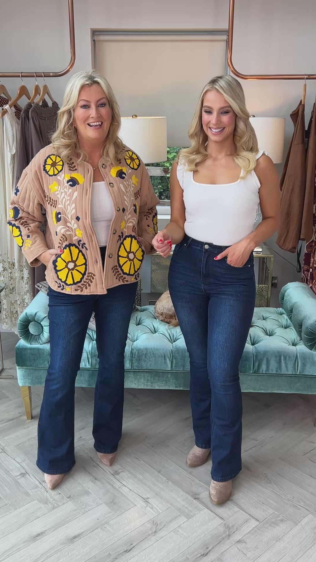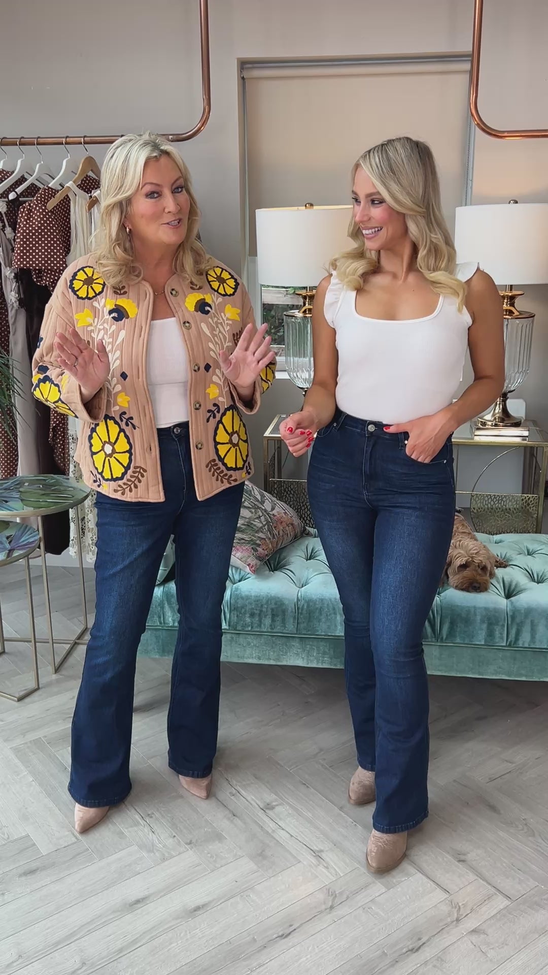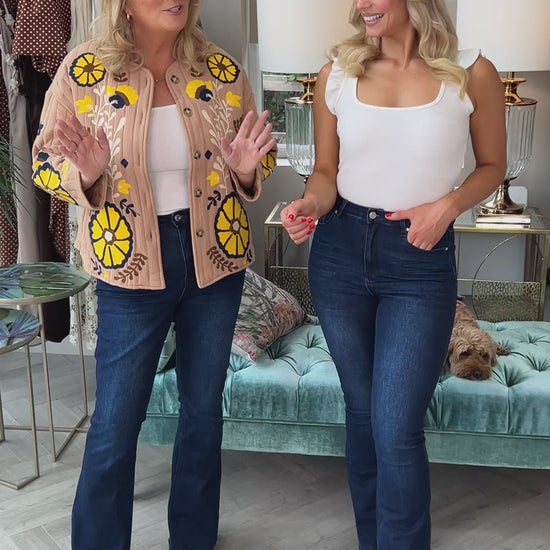 Update your denim collection with the Kym Flare Jean from Rant and Rave, a flattering pair of ladies’ high-rise jeans designed to smooth, shape, and elongate your figure, these flare jeans for women contour beautifully through the waist, hips, and thighs before kicking out to a statement bootcut flare leg.