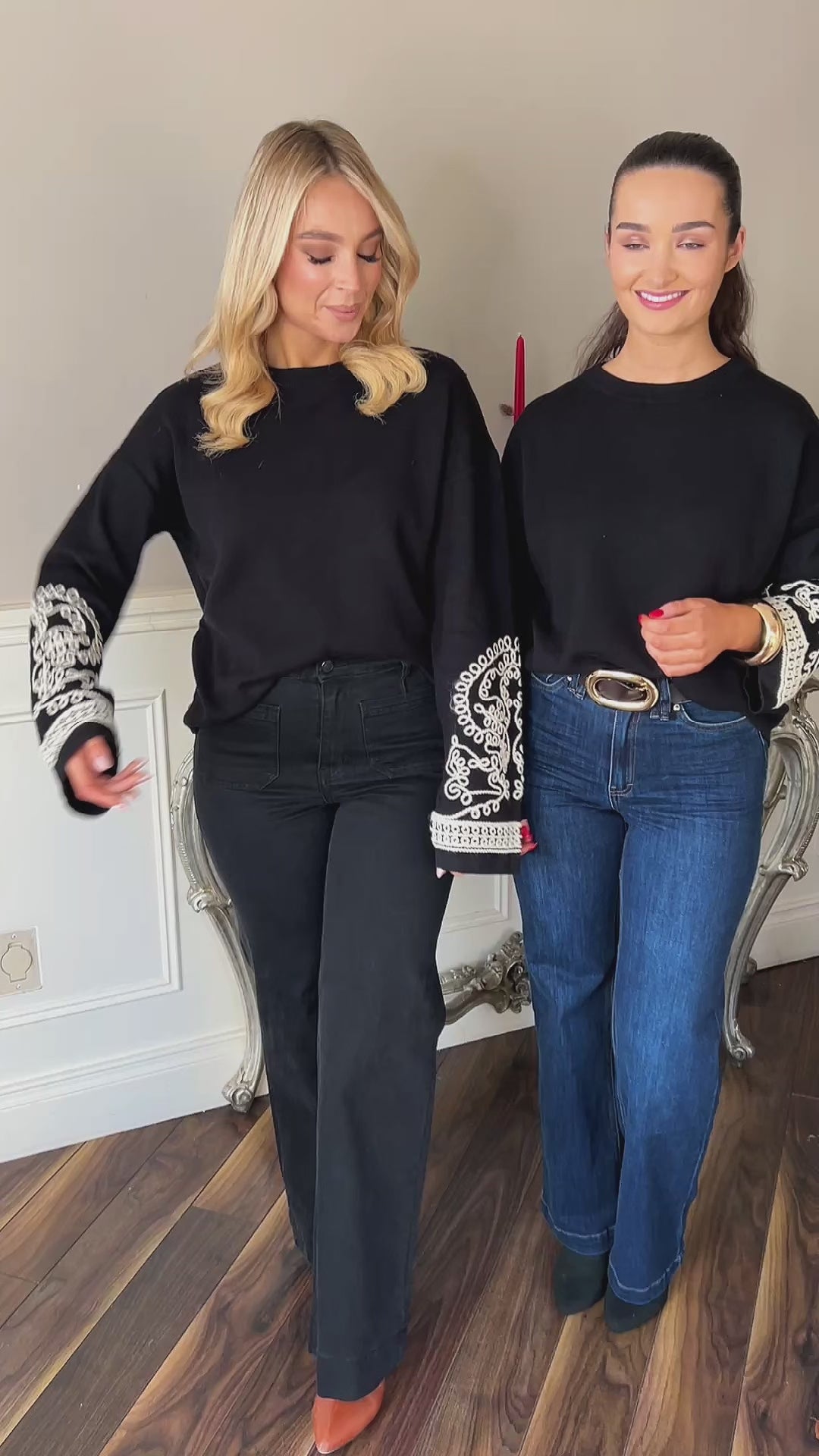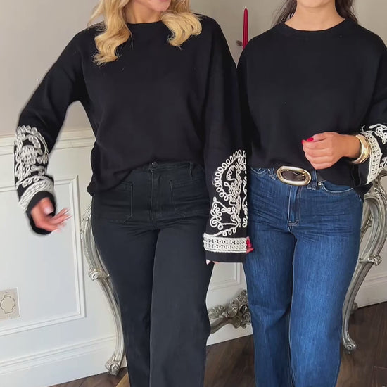 Introducing the Madison knit, your new go-to for effortlessly chic style. Priced at €49.00, this exquisite piece combines the timeless elegance of a classic black jumper with a twist of modernity, thanks to its intricate white embroidery detail on the sleeve.