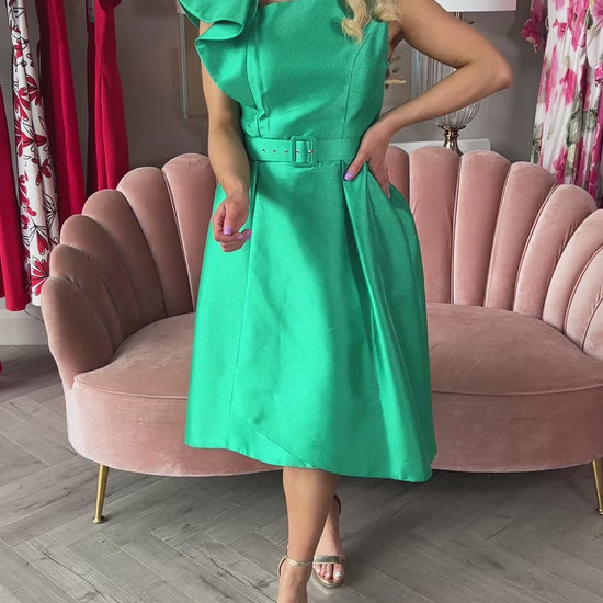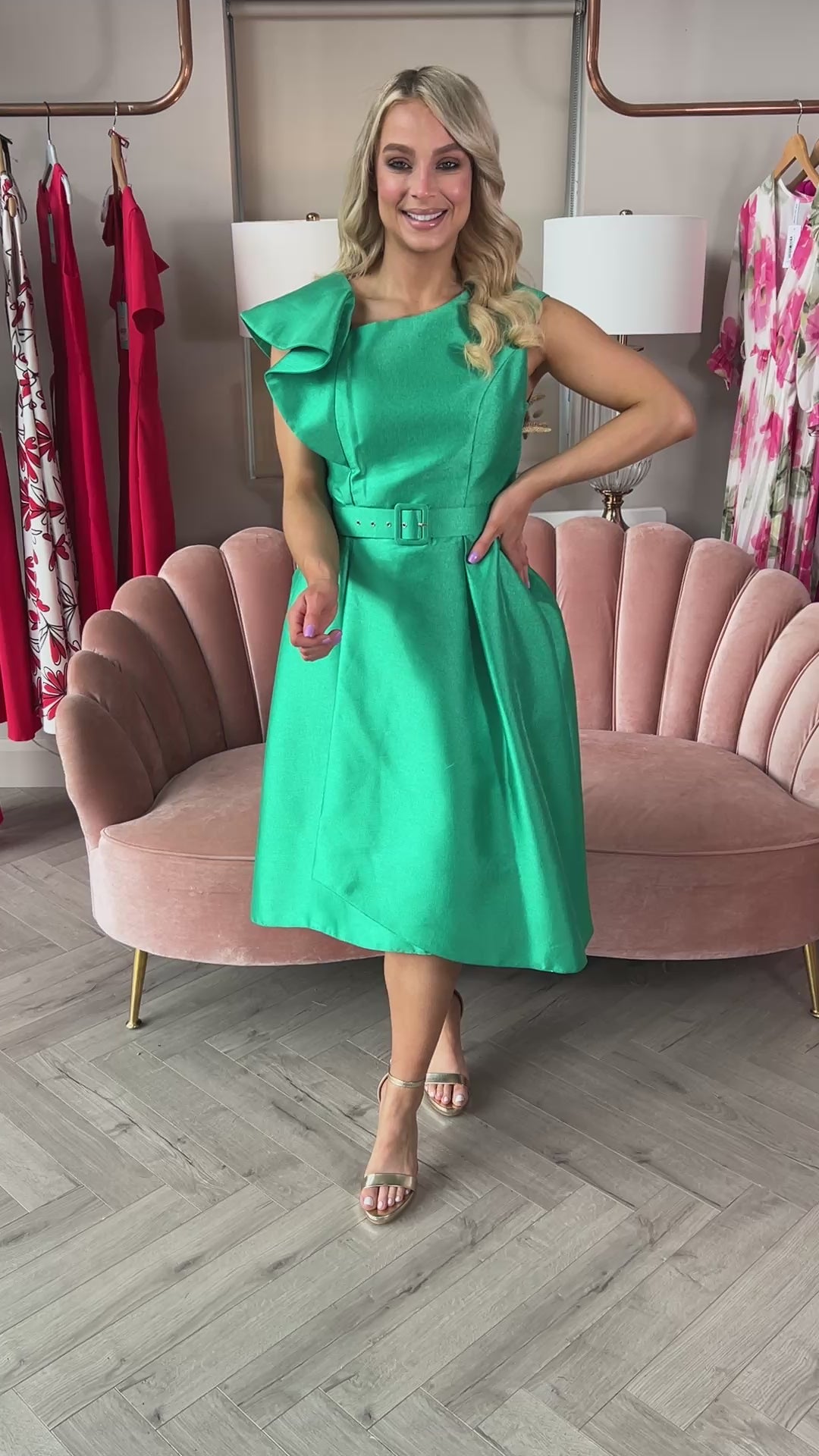 Turn heads in the Micha Dress, the ultimate showstopper for your next special event. Designed with a shimmering finish that catches the light beautifully, this dress features a dramatic ruffle detail on one shoulder for a bold, feminine touch. The fit-and-flare silhouette cinches at the waist with a matching belt, creating a flattering and elegant shape. A true occasion piece, perfect for weddings, races, or any standout moment.