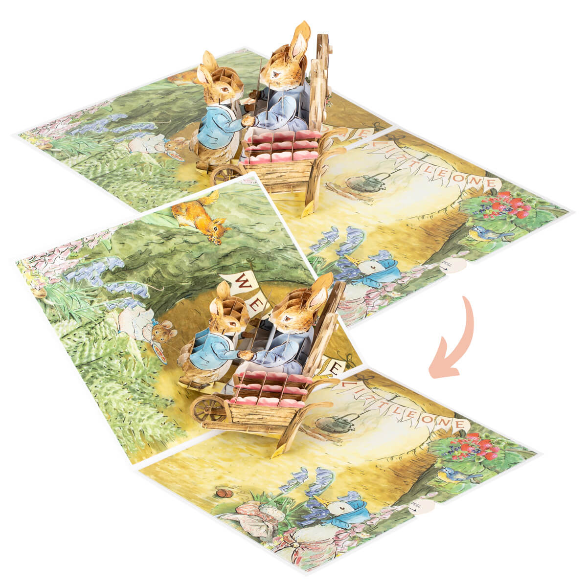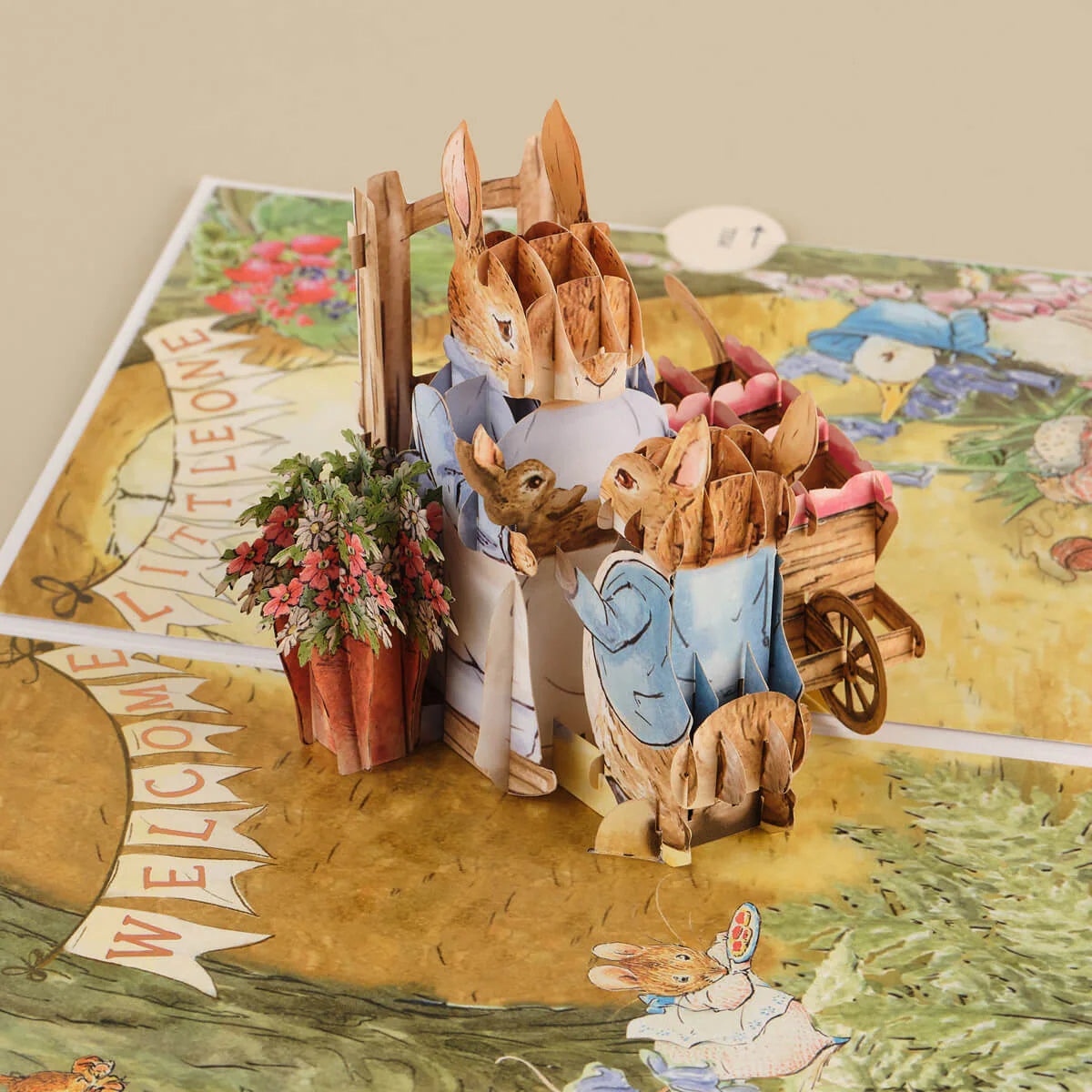 Upon opening, an adorable nursery scene unfolds inside Peter Rabbit’s burrow—Mrs. Rabbit sits in a rocking chair, cradling her newborn baby kit, while Peter Rabbit eagerly peeks in. A charming 3D bassinet draped with a pink blanket adds to the warmth of the moment, while Jemima Puddleduck, Mrs. Tiggy-Winkle, and other beloved characters gather to celebrate.