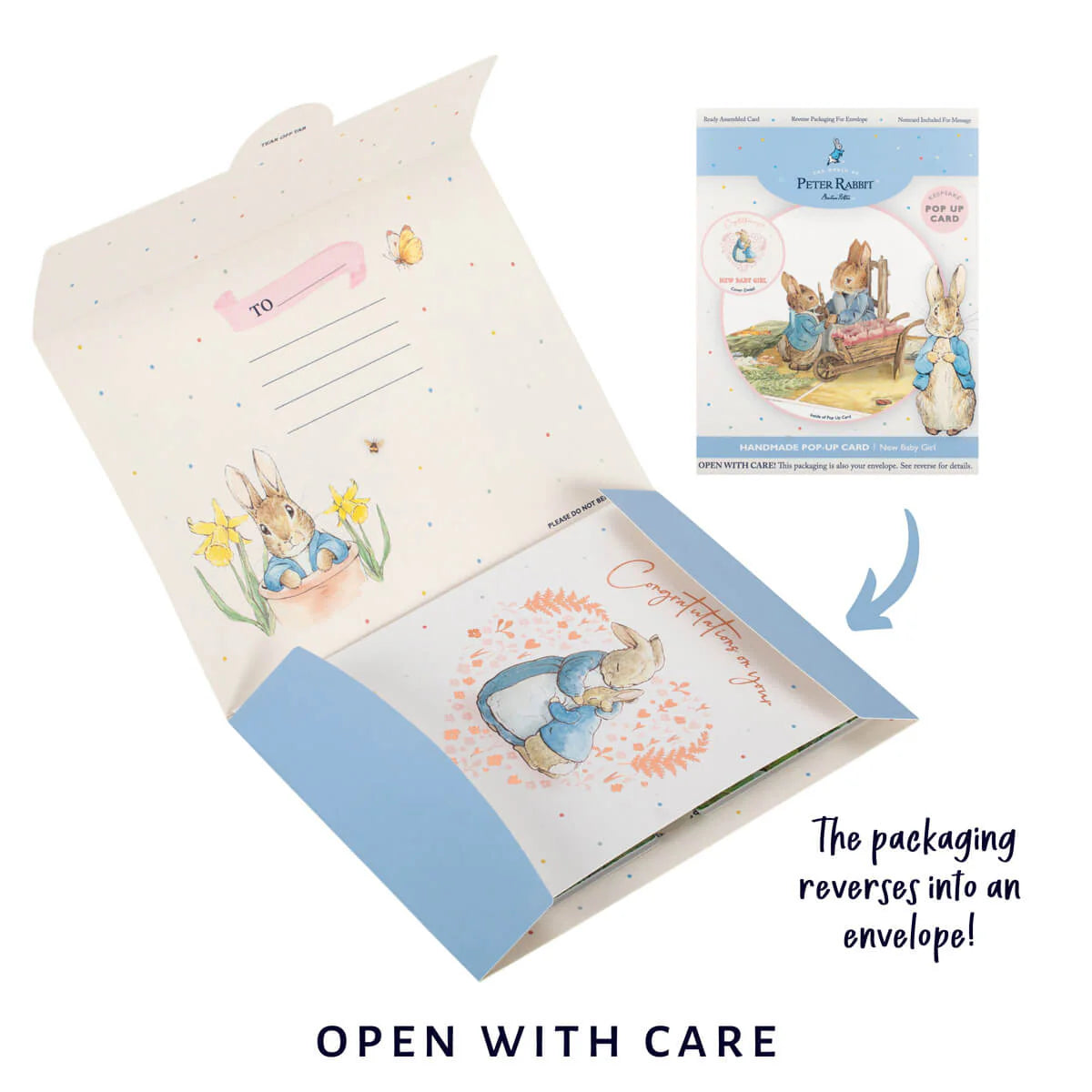 Celebrate the arrival of a precious baby girl with this stunning and unique keepsake featuring the beloved Peter Rabbit™ and Mrs. Rabbit in an enchanting 3D pop-up scene. Inspired by Beatrix Potter’s iconic storybook world, this handcrafted card is a heartwarming way to welcome a little one into the world.