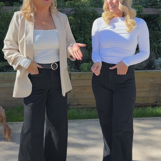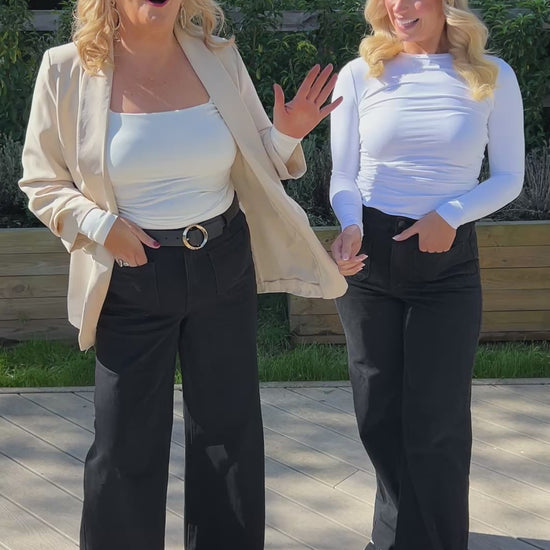 Step into effortless style with the Nola Wide Leg Jean, designed for both comfort and versatility. Cut in a flattering high-rise fit with a relaxed wide-leg silhouette, these jeans contour at the waist and hips before flowing into a chic, easy shape. The rich black wash adds a touch of sophistication, making them the perfect pair to take you from casual days to dressed-up evenings.