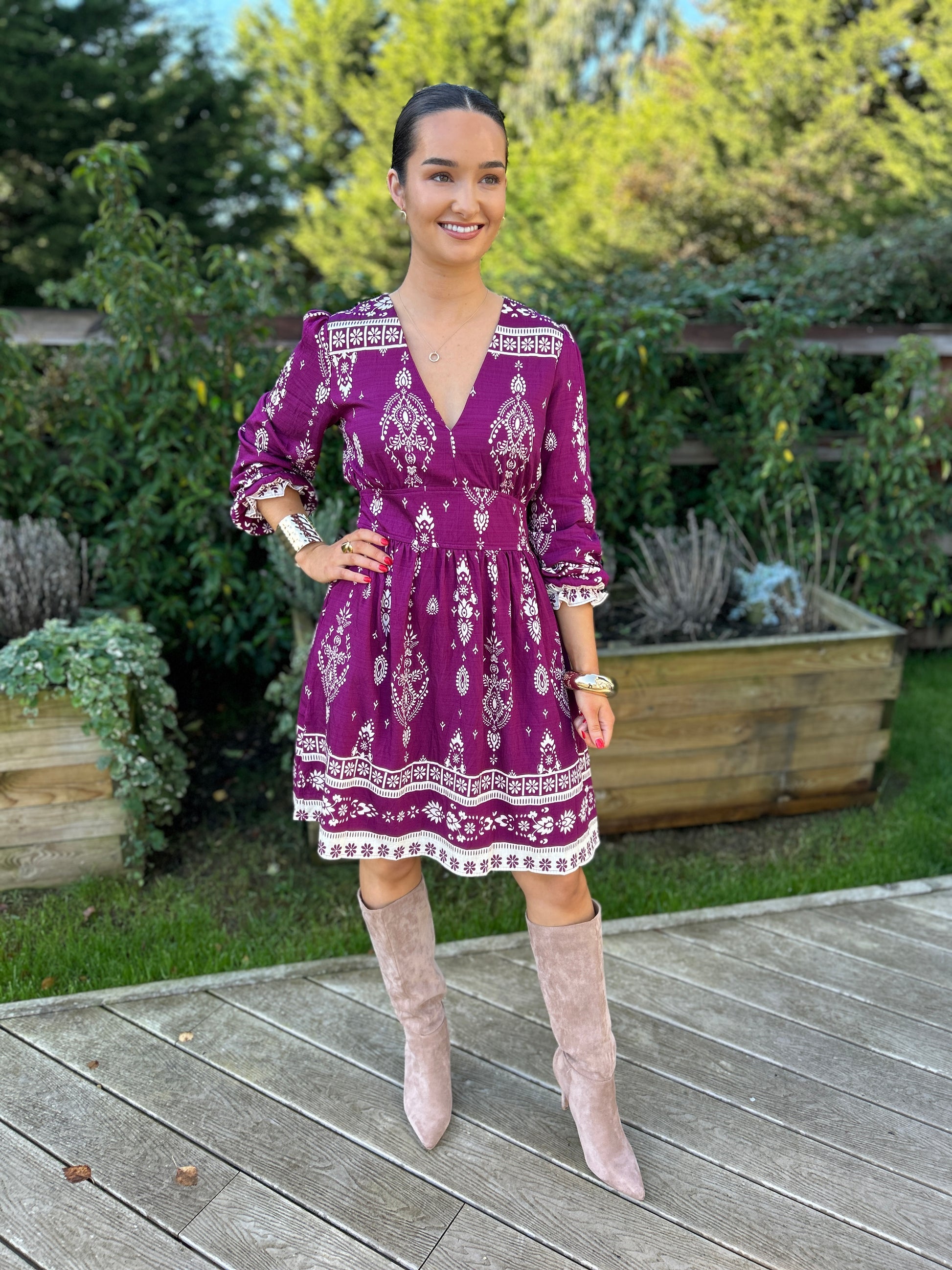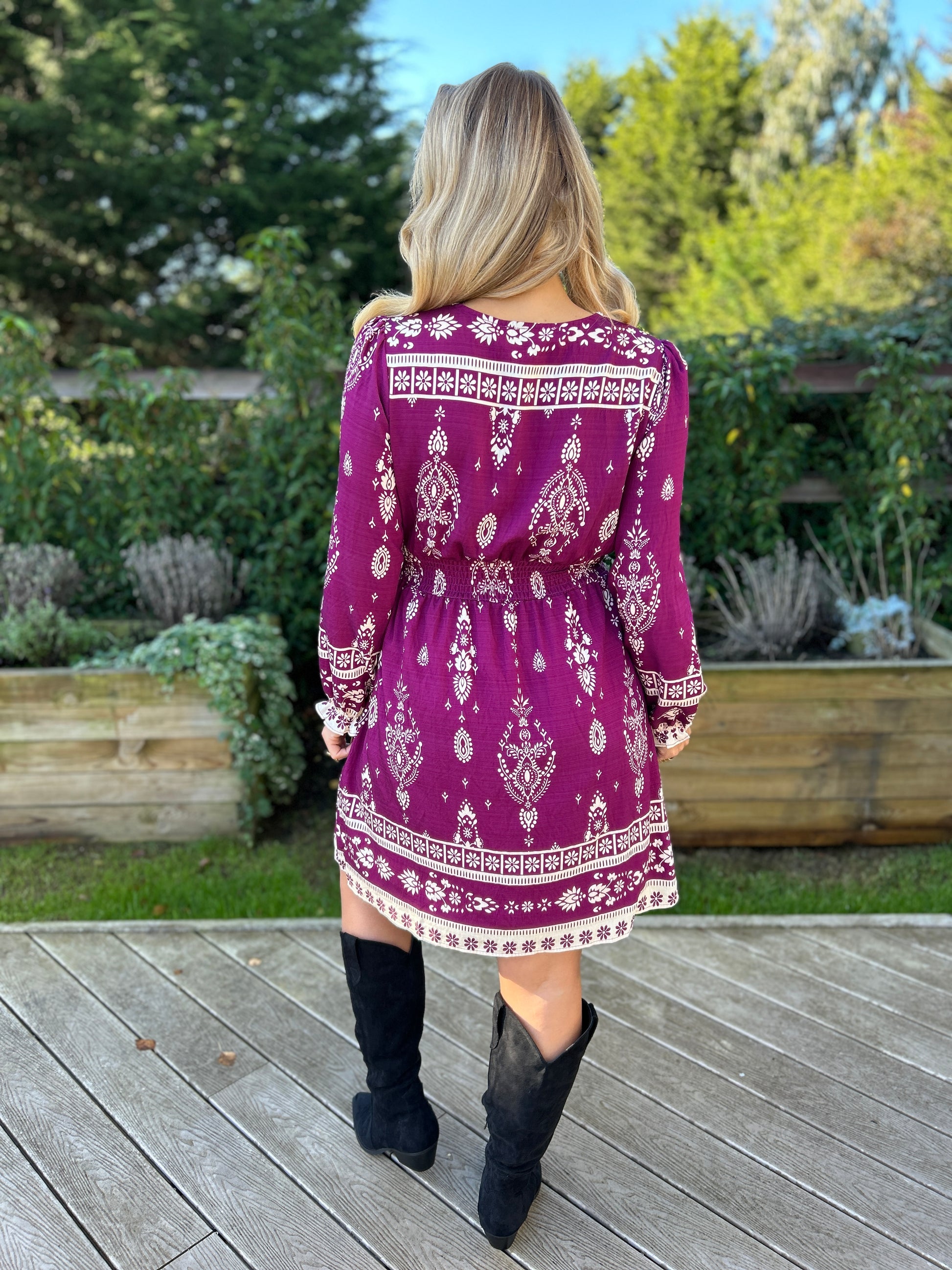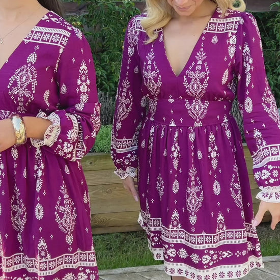 Embrace effortless femininity with the Vie Dress, a piece that blends bohemian spirit with modern polish. Crafted in a burgundy print with ecru patterns, its flowing silhouette flatters the figure while exuding relaxed, everyday elegance.